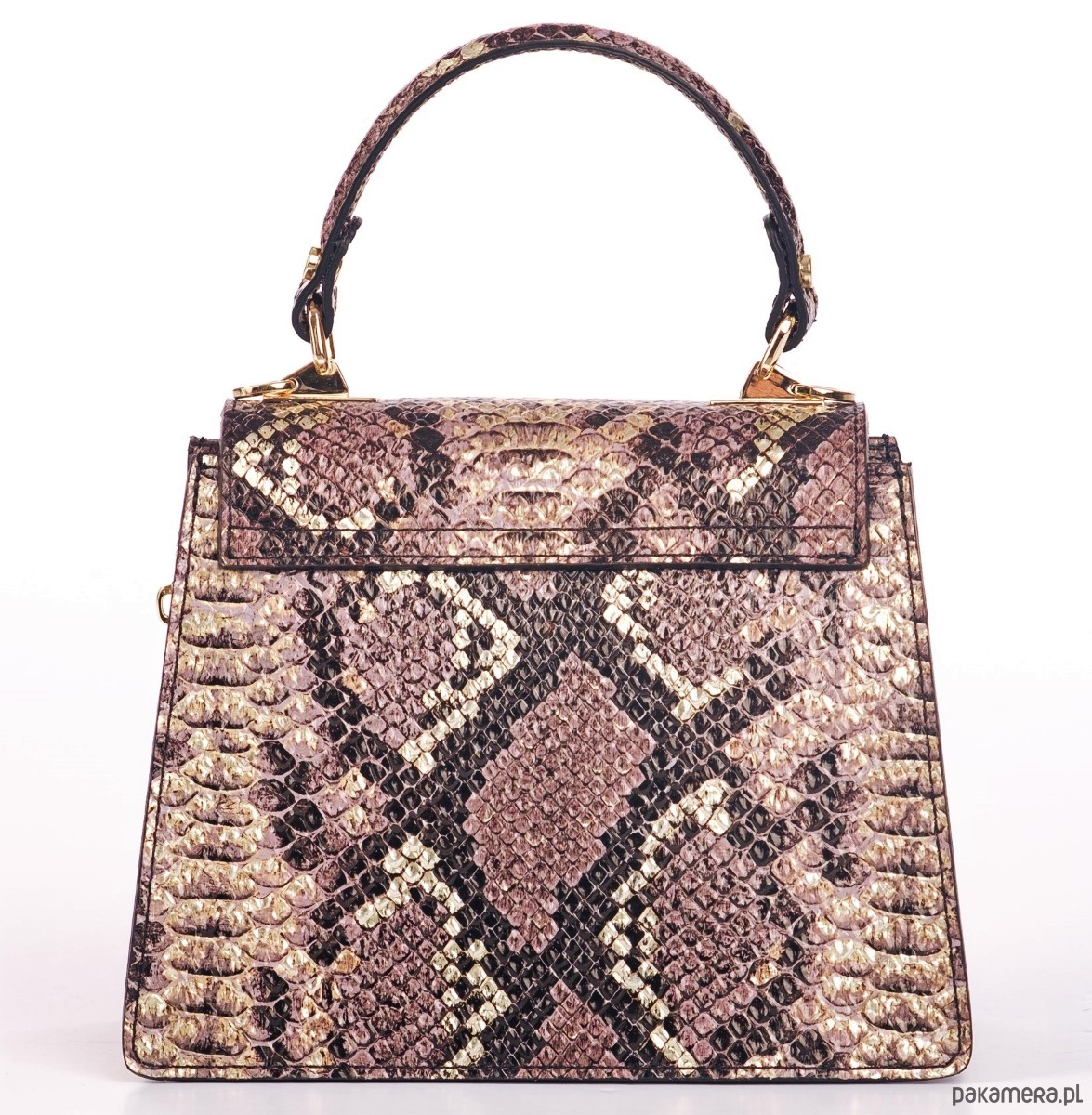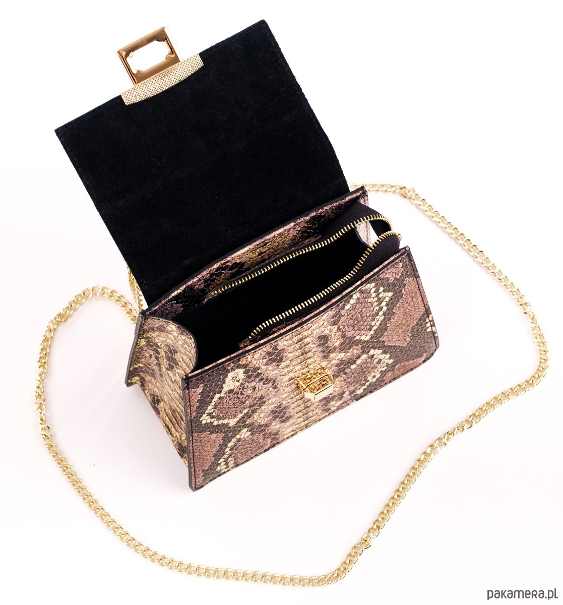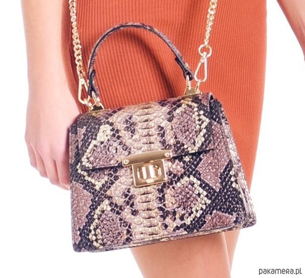 Ozdobne zamknięcie, dopinany łańcuszek do przewieszenia torebki przez ramię.