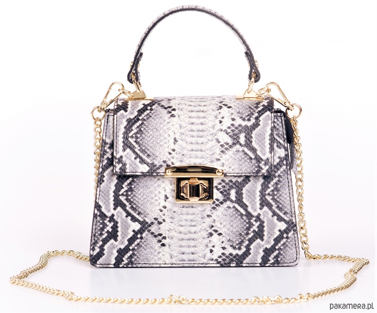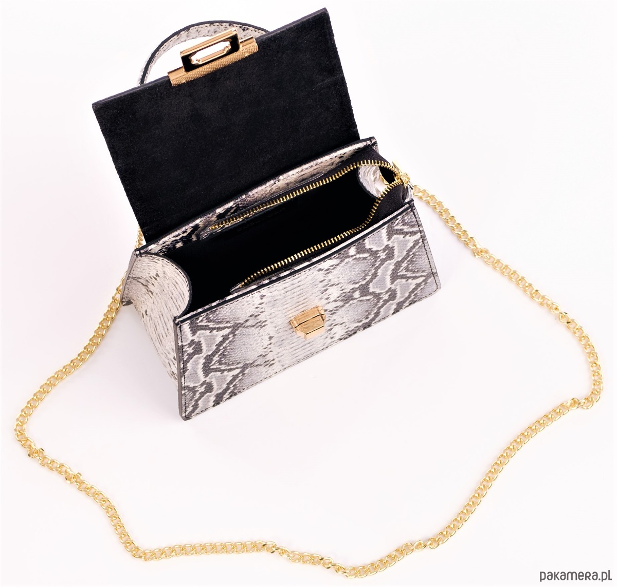 Ozdobne zamknięcie, dopinany łańcuszek do przewieszenia torebki przez ramię.