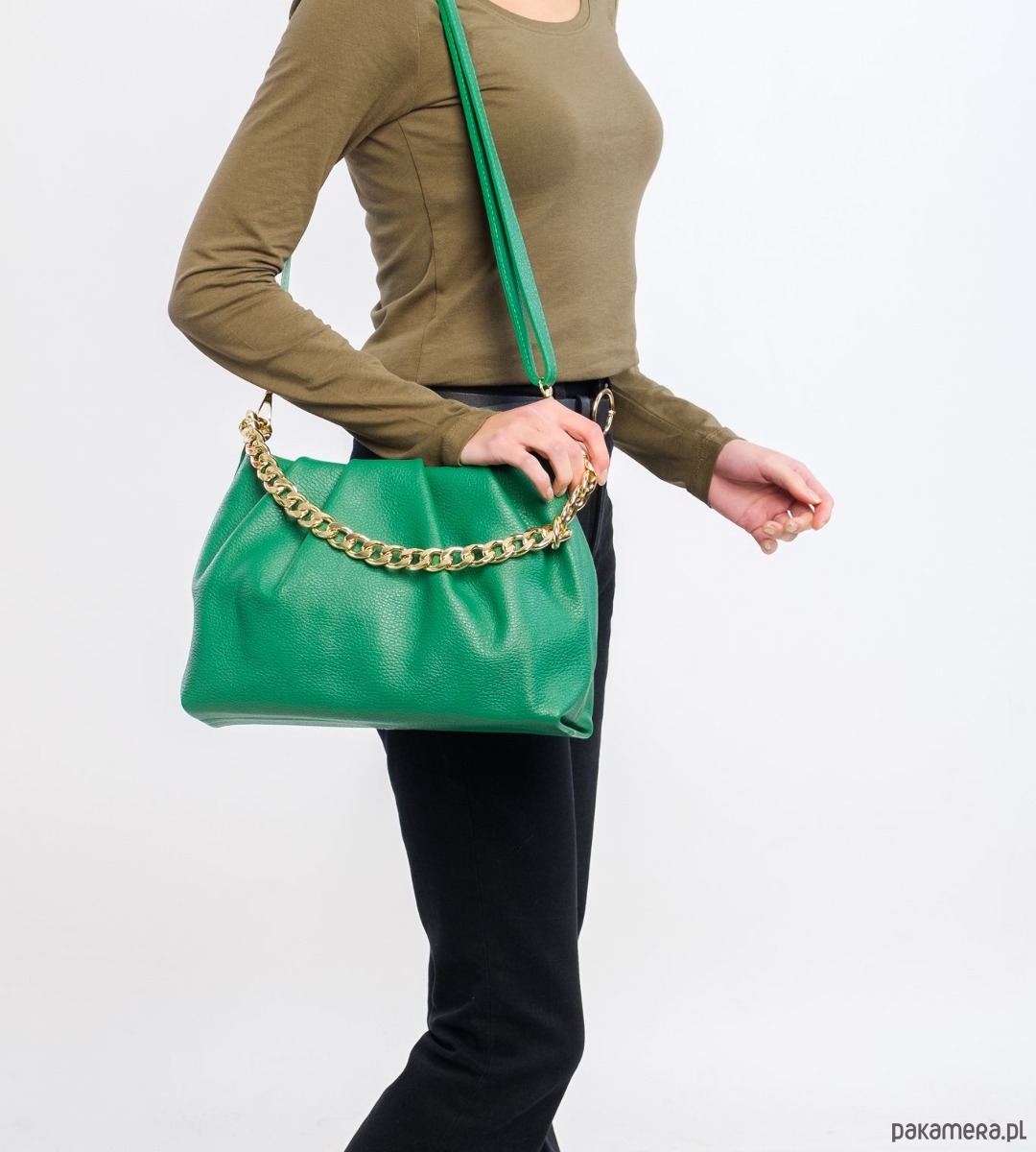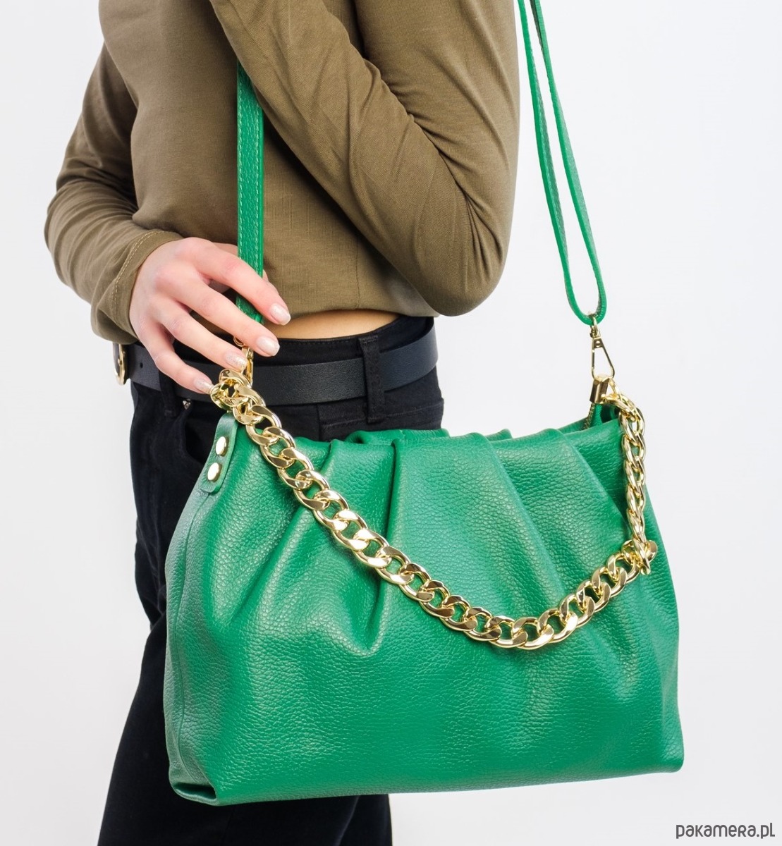 Bardzo modna w tym sezonie, ozdobny łańcuch i dopinany regulowany pasek.