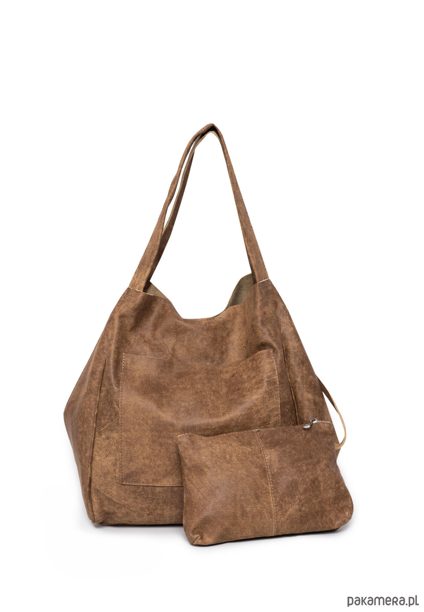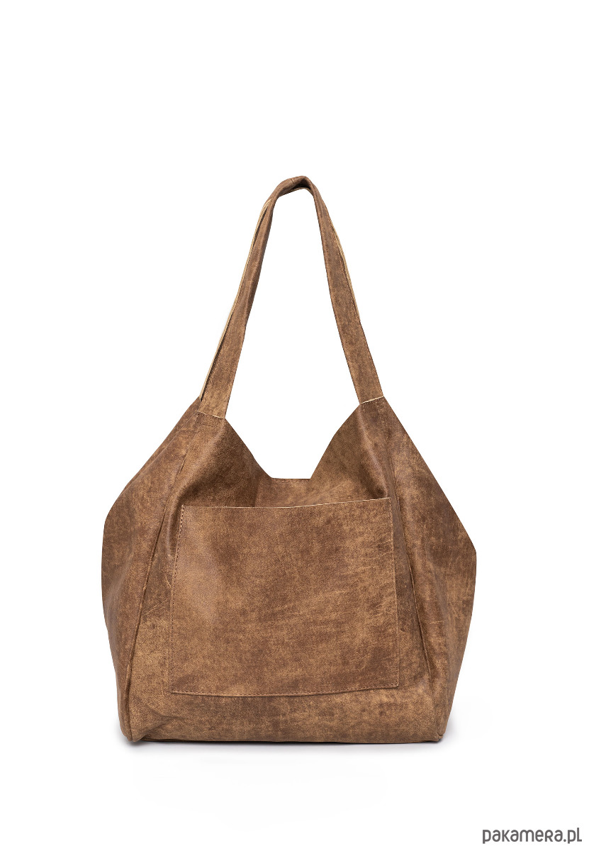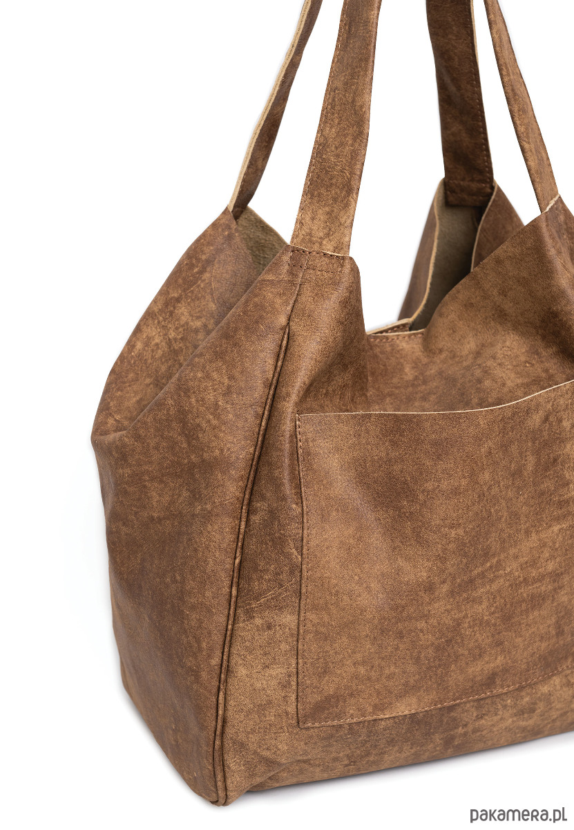 Oryginalna, obszerna torba na ramię typu shopper. Uszyta z miękkiej, włoskiej, cielęcej skóry licowej w kolorze kamelowym. Świetna forma, w której zmieścisz absolutnie cały swój babski świat. Podwójne rączki i dodatkowa kieszeń z przodu nadają jej nieformalny charakter.