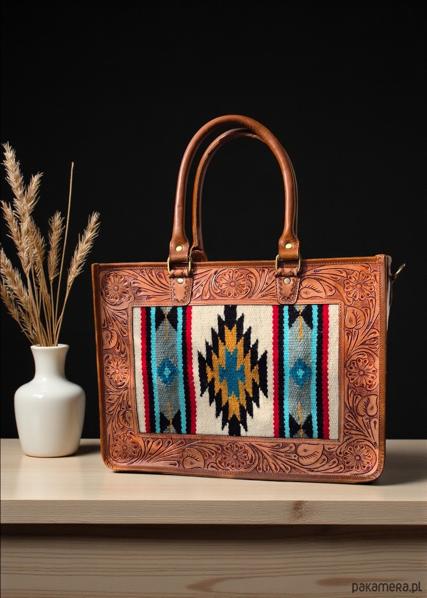 Duża torba skórzana z eleganckim zdobieniem w postaci rzeźbionych motywów na powierzchni skóry, ręcznie wykonana w Indiach, co nadaje jej unikalny charakter i autentyczny rys ręcznej pracy. Wykonana z wysokiej jakości materiałów, które zapewniają trwałość i długowieczność użytkowania. Zdobienie tworzy subtelny kontrast faktury skóry oraz kolorowy tkany materiał. Przestronne wnętrze z dodatkowymi kieszeniami zapewnia praktyczność w podróży i codziennych zastosowaniach. Idealna dla osób ceniących rękodzieło, wyjątkowy design i trwałe, stylowe dodatki.