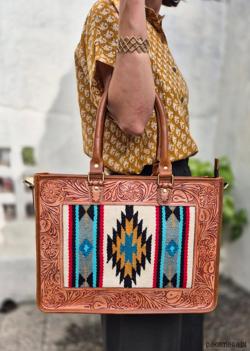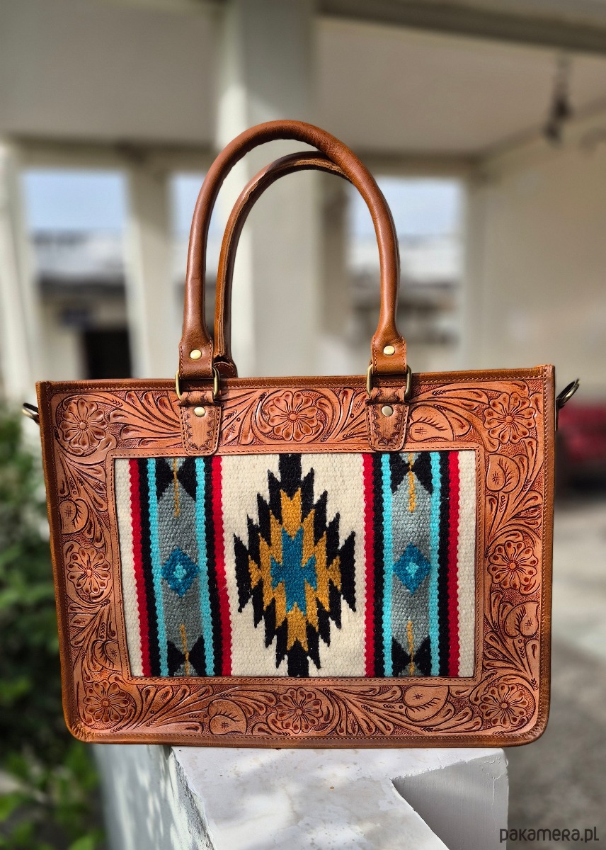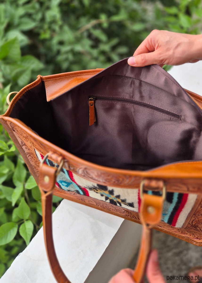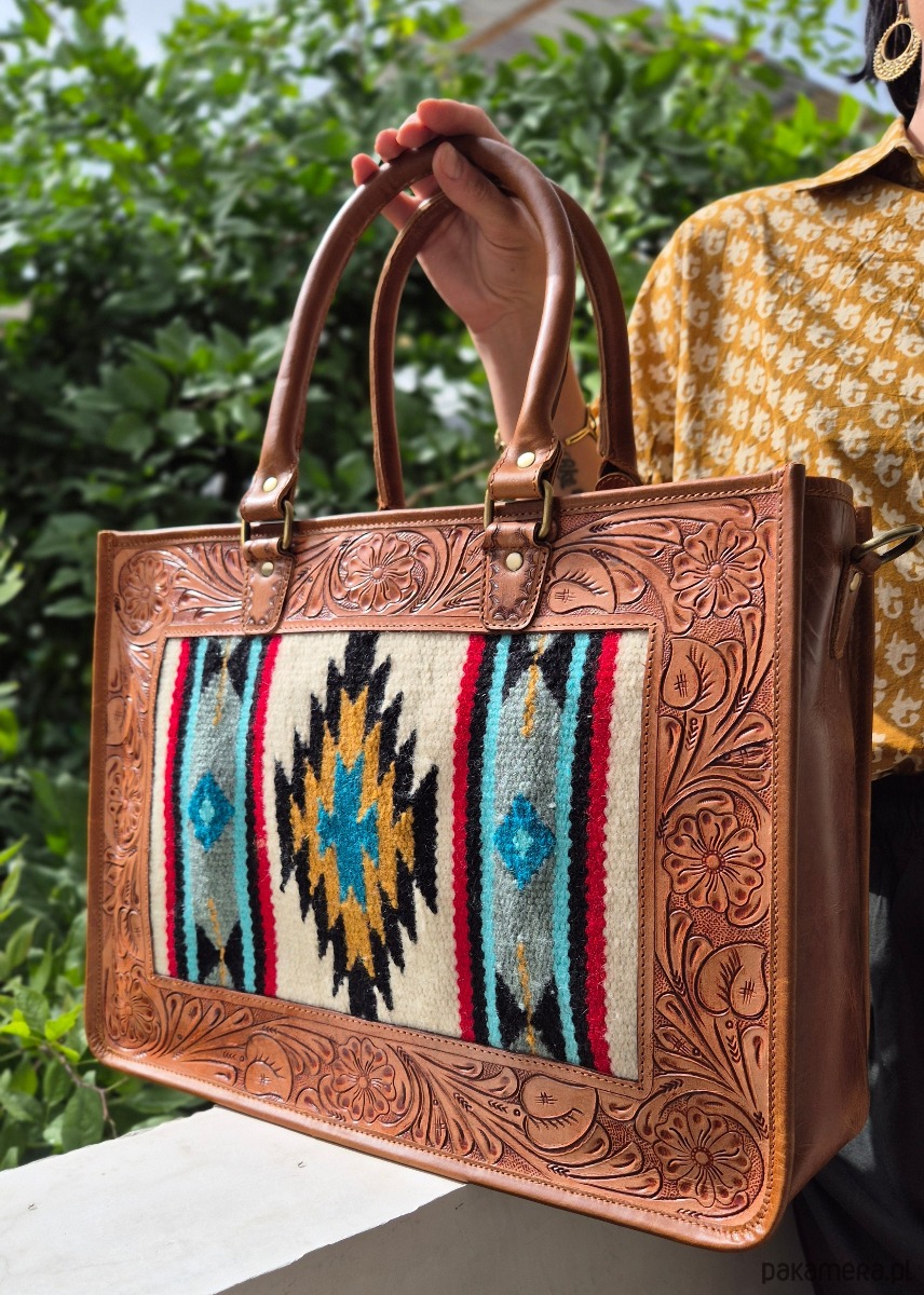 Duża torba skórzana z eleganckim zdobieniem w postaci rzeźbionych motywów na powierzchni skóry, ręcznie wykonana w Indiach, co nadaje jej unikalny charakter i autentyczny rys ręcznej pracy. Wykonana z wysokiej jakości materiałów, które zapewniają trwałość i długowieczność użytkowania. Zdobienie tworzy subtelny kontrast faktury skóry oraz kolorowy tkany materiał. Przestronne wnętrze z dodatkowymi kieszeniami zapewnia praktyczność w podróży i codziennych zastosowaniach. Idealna dla osób ceniących rękodzieło, wyjątkowy design i trwałe, stylowe dodatki.