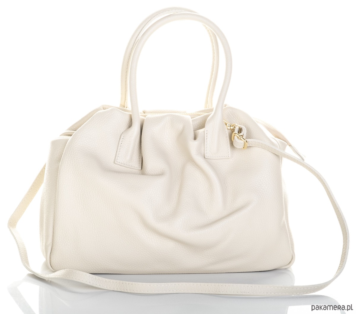 Elegancka forma kuferka, ozdobne marszczenia. Długi pasek w komplecie.. Mieści format A4.