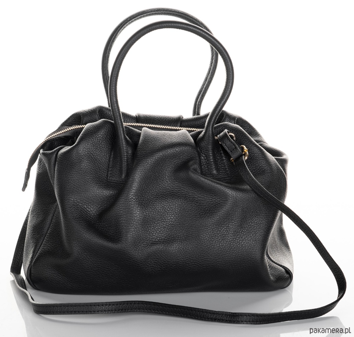 Elegancka forma kuferka, ozdobne marszczenia. Długi pasek w komplecie.. Mieści format A4.
