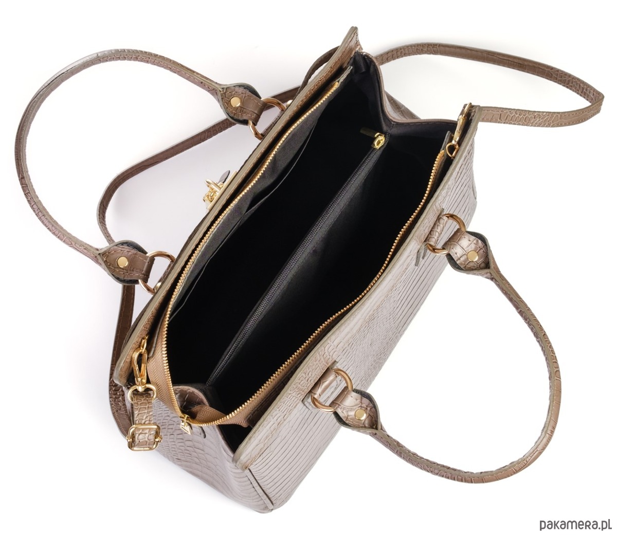 Torba do ręki lub na ramię, w komplecie dopinany długi pasek, ozdobne okucia - pasek z kłódką.