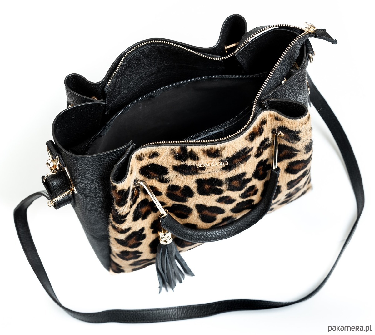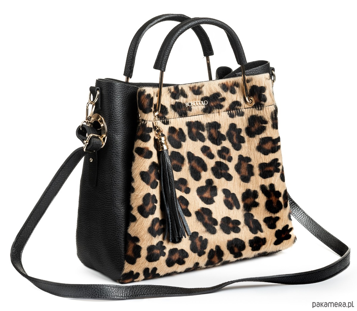 Elegancka torba ze skóry naturalnej, wstawka z printem w pantrkę ze skóry z włosiem, bardzo stylowa i idealna do codziennych stylizacji, wielkość miesząca A4, dopinany pasek.