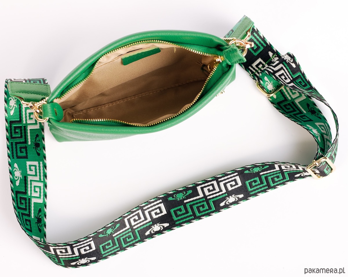 Design dopinany szeroki na 5 cm pasek tekstylny z wzorem, skórzane końcówki w kolorze torebki, regulowany, max 135 cm
