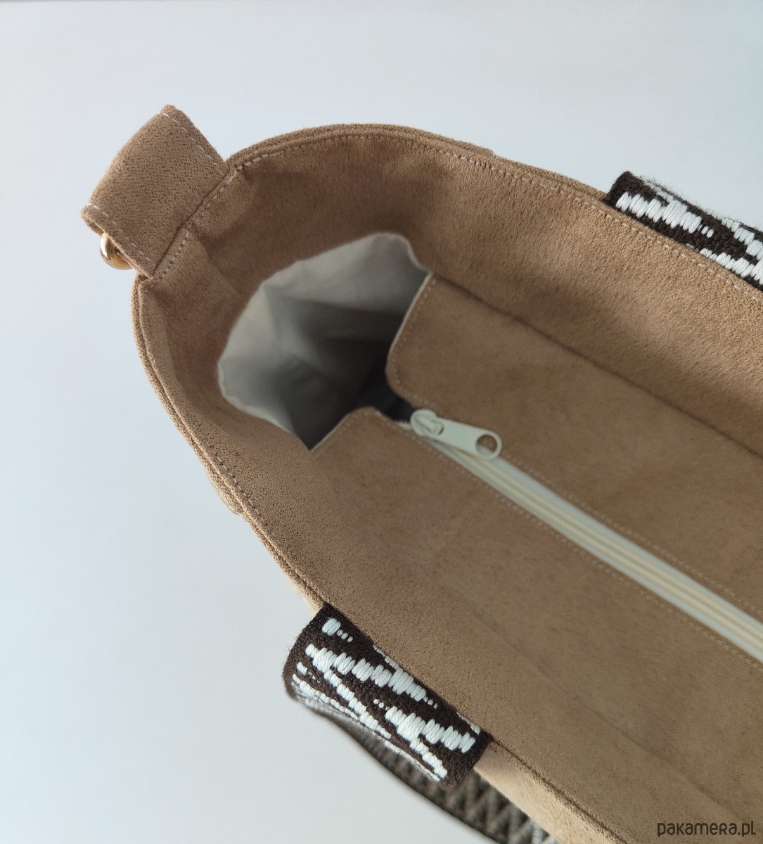 Wewnątrz bawełniana podszewka oraz kieszonka zapinana na ekspres umieszczona na tylnej ścianie.