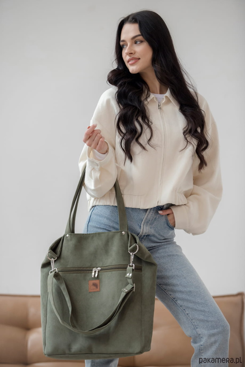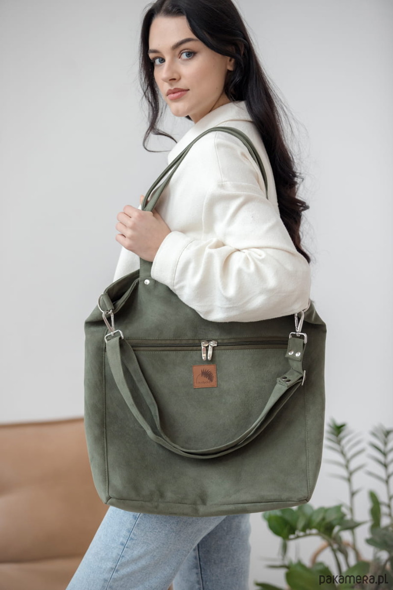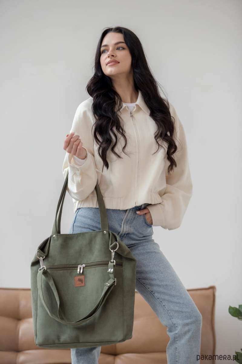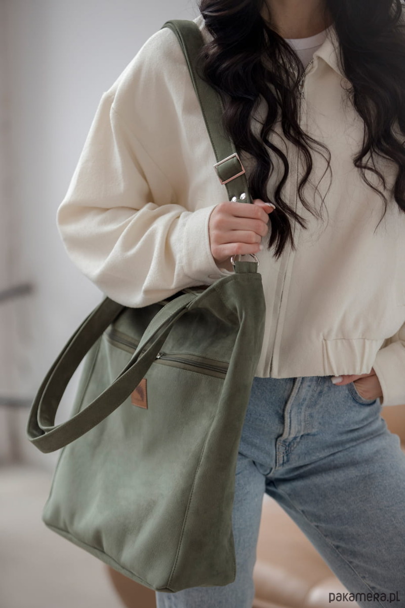 Duża, nubukowa TOTE BAG do noszenia na ramieniu, lub na skos, na długim regulowanym pasku.
