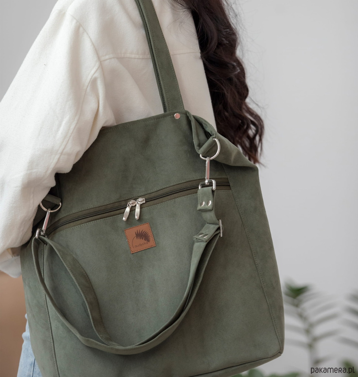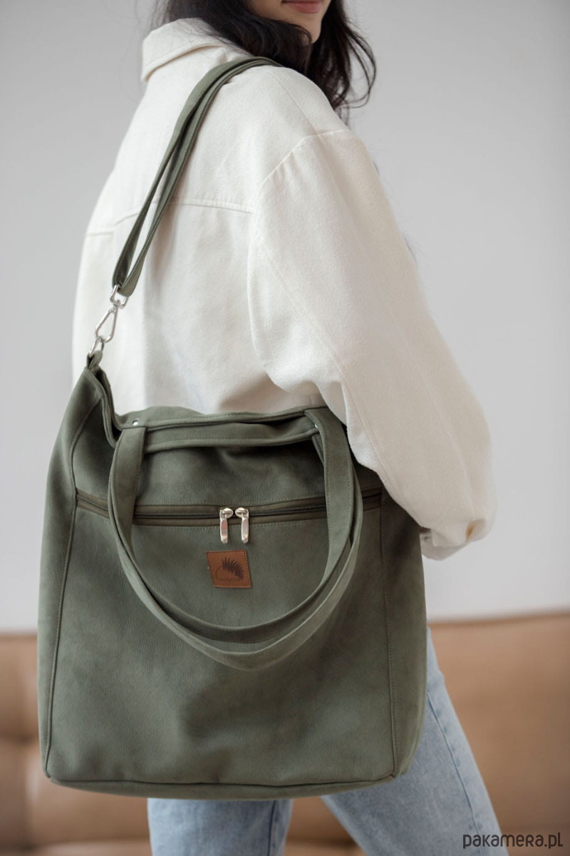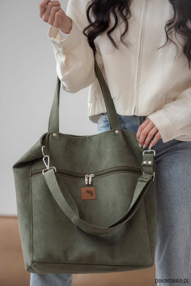 Duża, nubukowa TOTE BAG do noszenia na ramieniu, lub na skos, na długim regulowanym pasku.