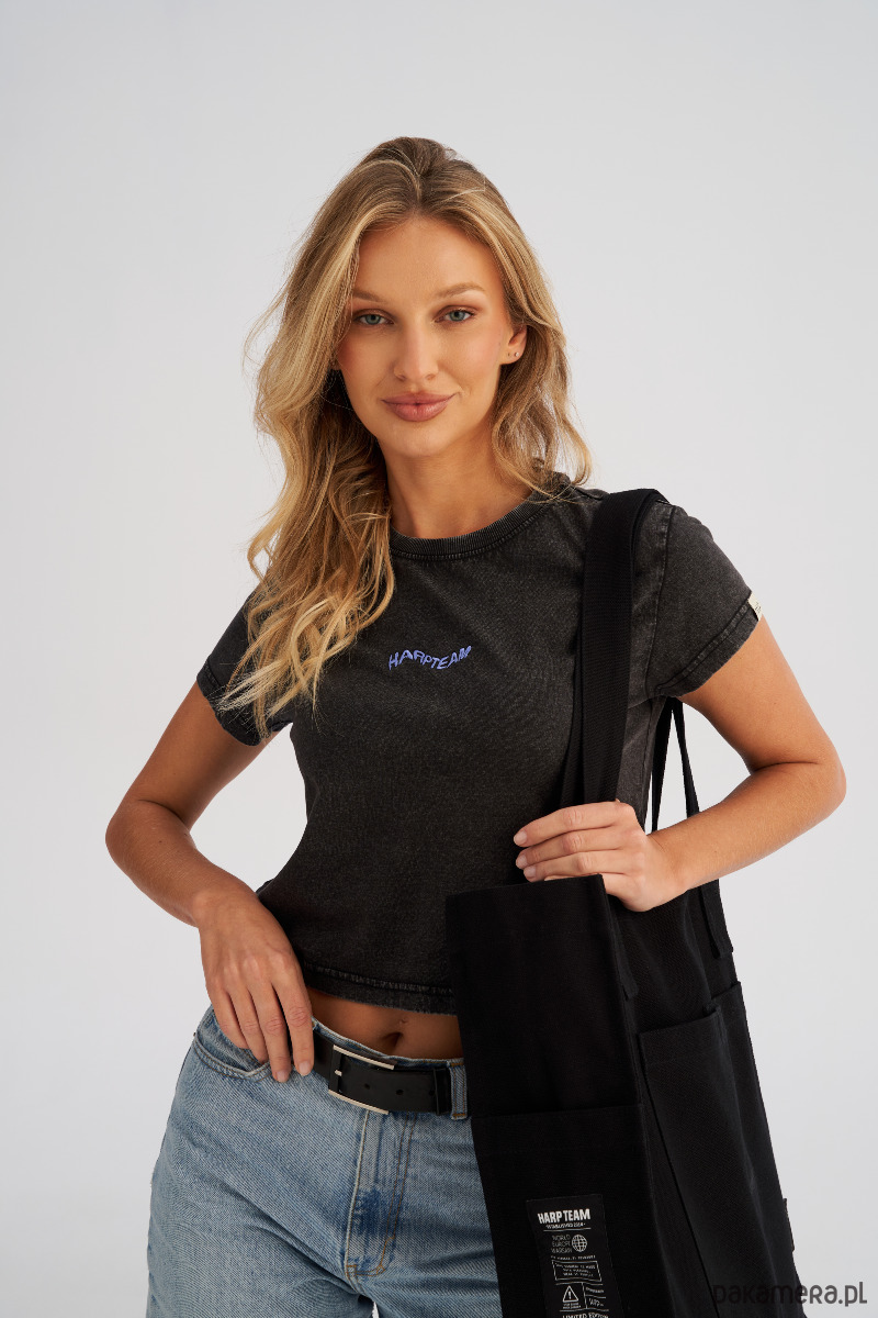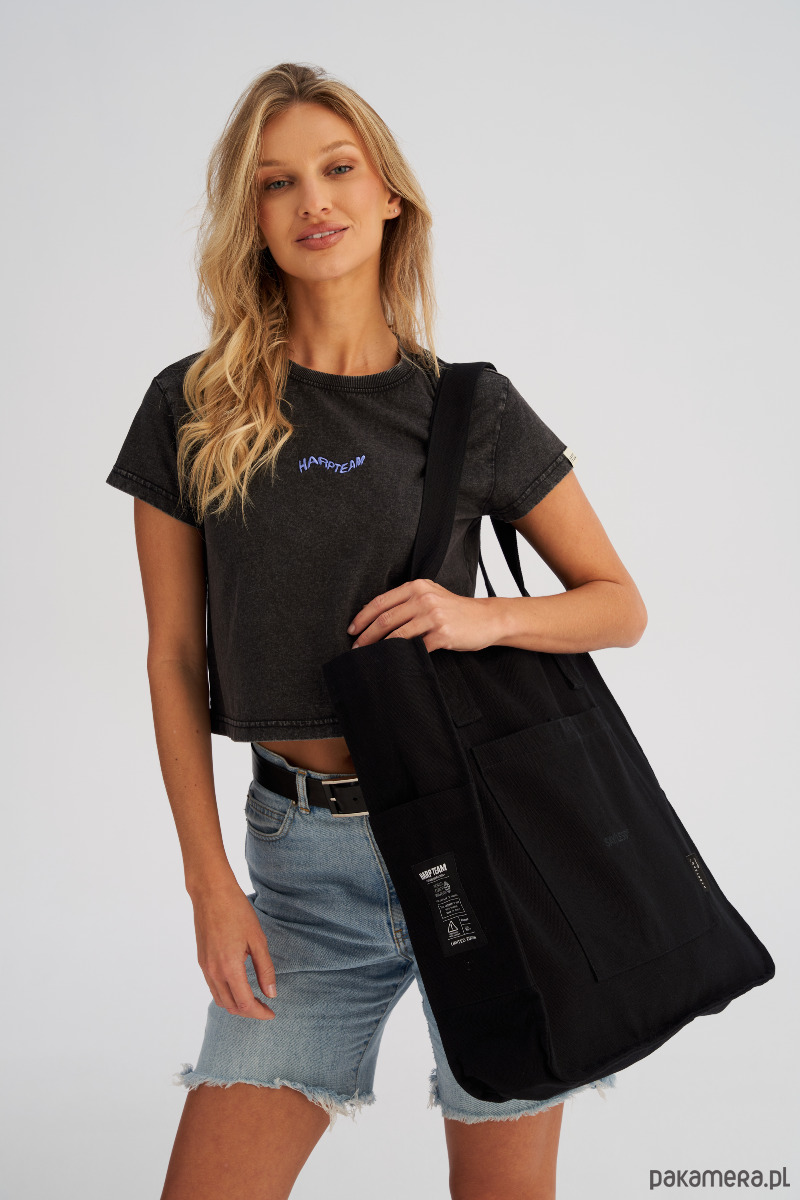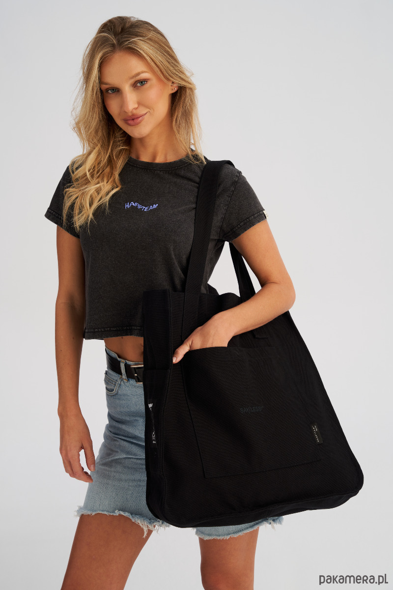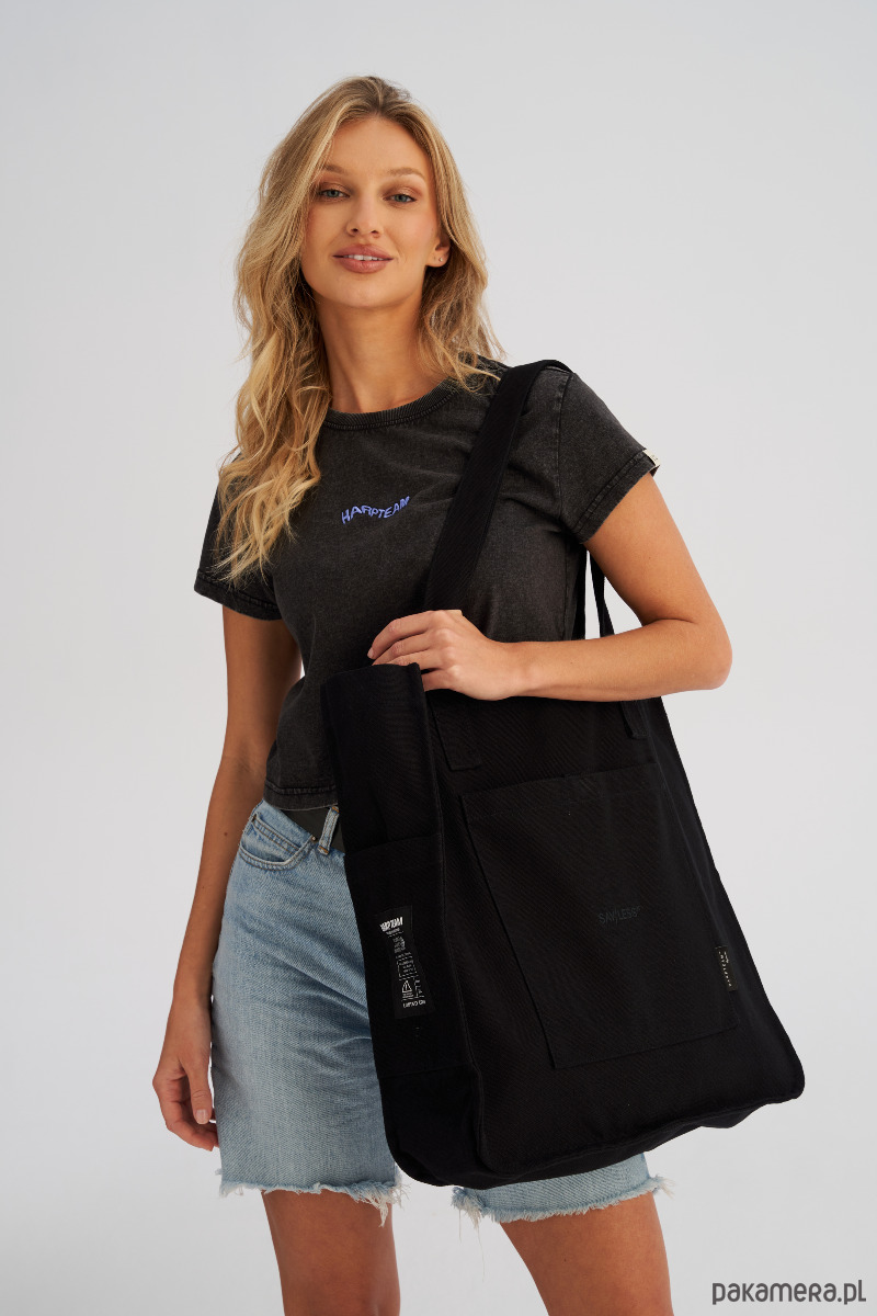 Dwa komplety uchwytów umożliwiają wygodne noszenie torby zarówno w dłoni, jak i na ramieniu, co czyni ją niezwykle wszechstronnym dodatkiem na co dzień. Front torby zdobi nadruk, a ozdobne metki nadają jej modowego charakteru.