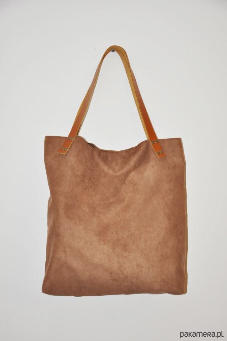 Duża torba w kształcie worka wykonana z alcantary (syntetycznego zamszu) w kolorze karmelowym, miodowe uszy z grubej, naturalnej skóry bydlęcej.