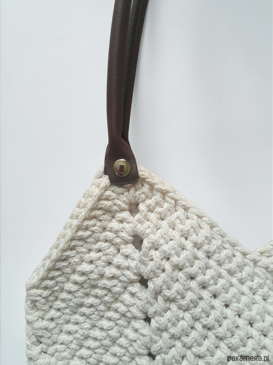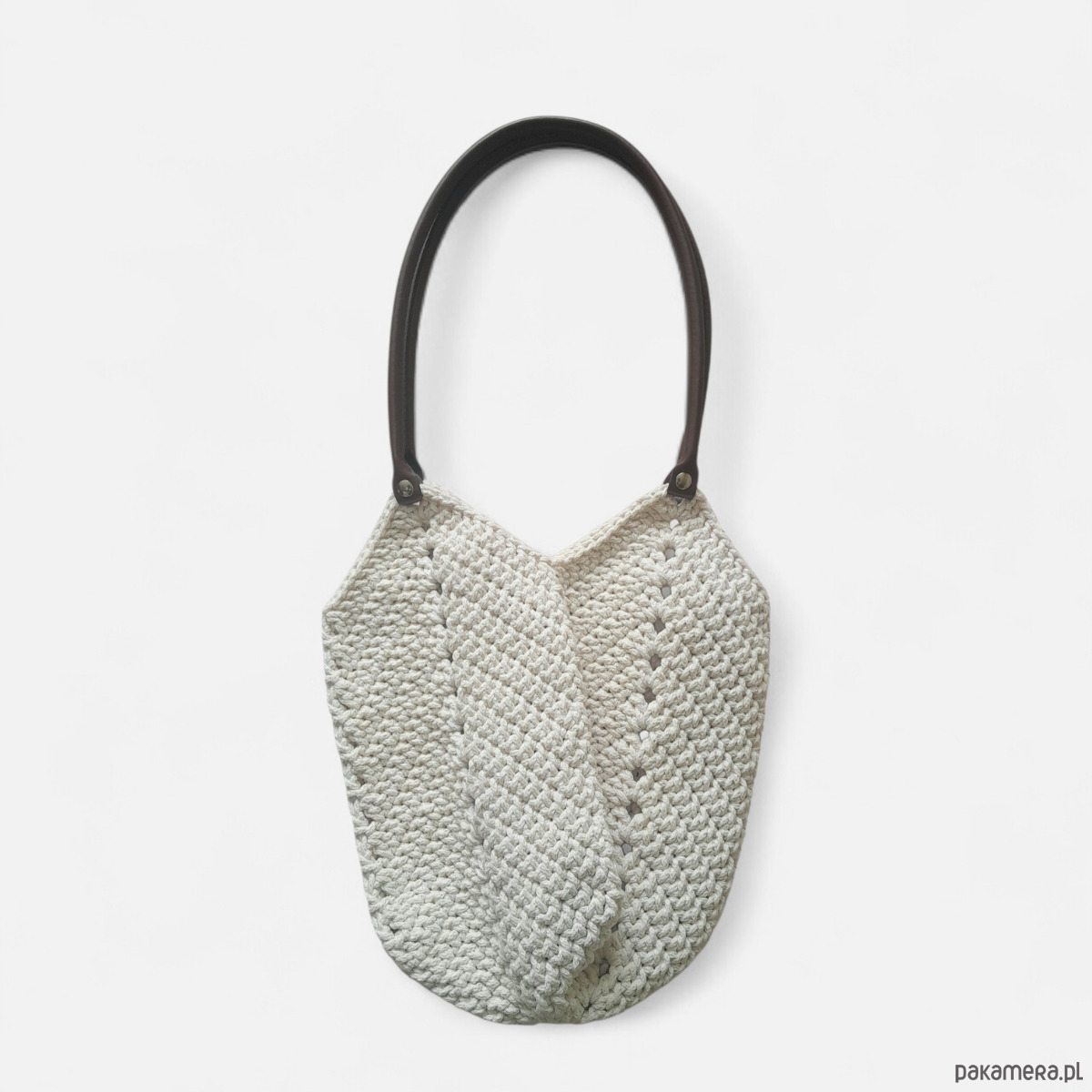Torba została wykonana ze sznurka bawełnianego o grubości 3 mm, dzięki czemu jest trwała, a jednocześnie zachowuje miękkość i dobrze układa się podczas noszenia. Całość dopełniają wygodne rączki z ekoskóry, które dodają jej klasy i podnoszą komfort użytkowania.