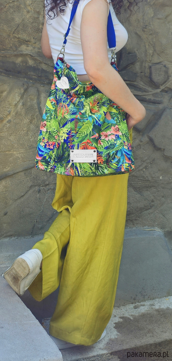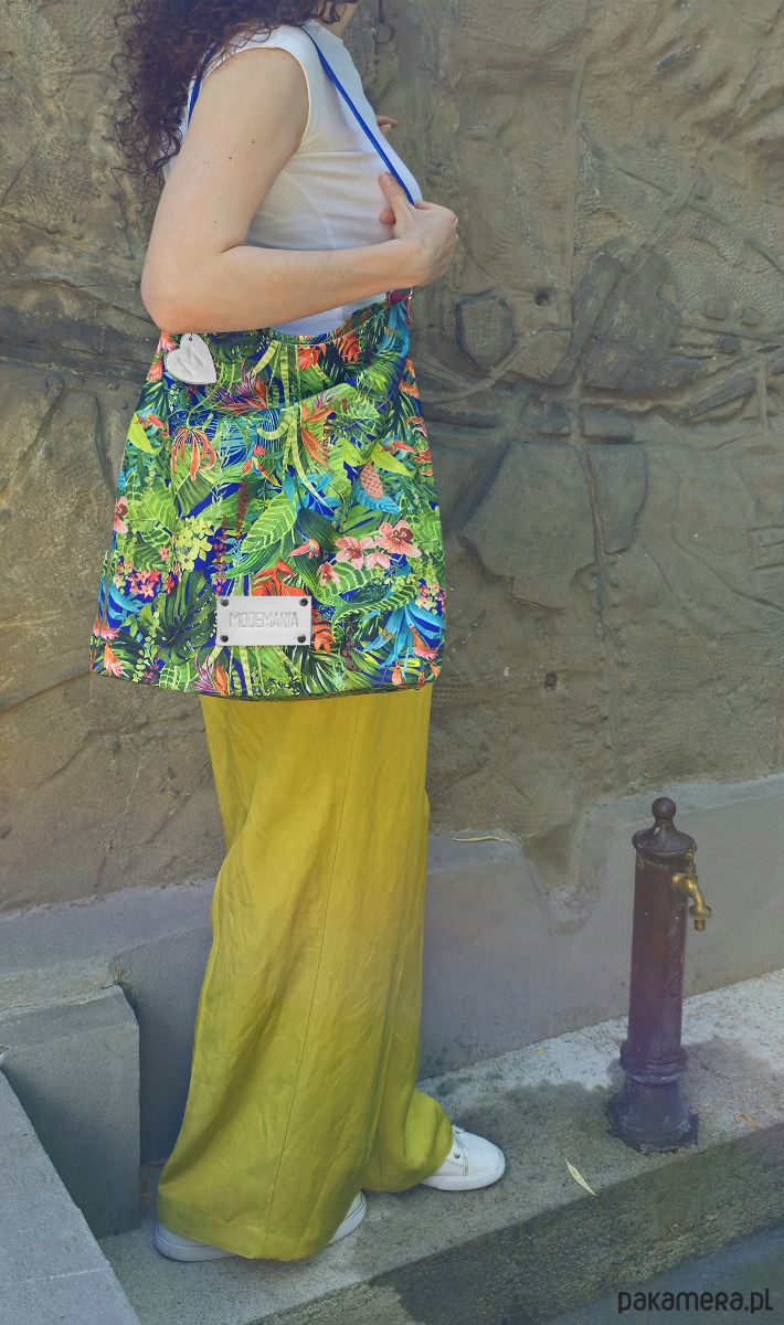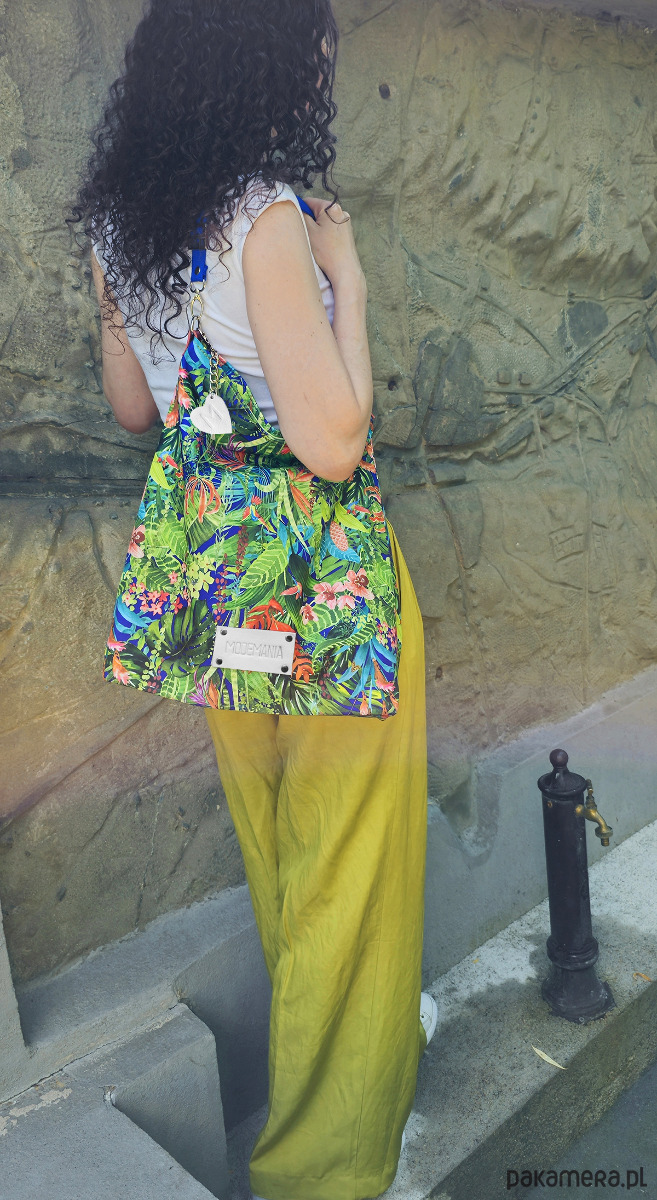 Worek w stylistyce "Urban Jungle" z kolekcji wiosenno- letniej wykonana jest z wytrzymałej i wodoodpornej tkaniny w kwiaty i liście.