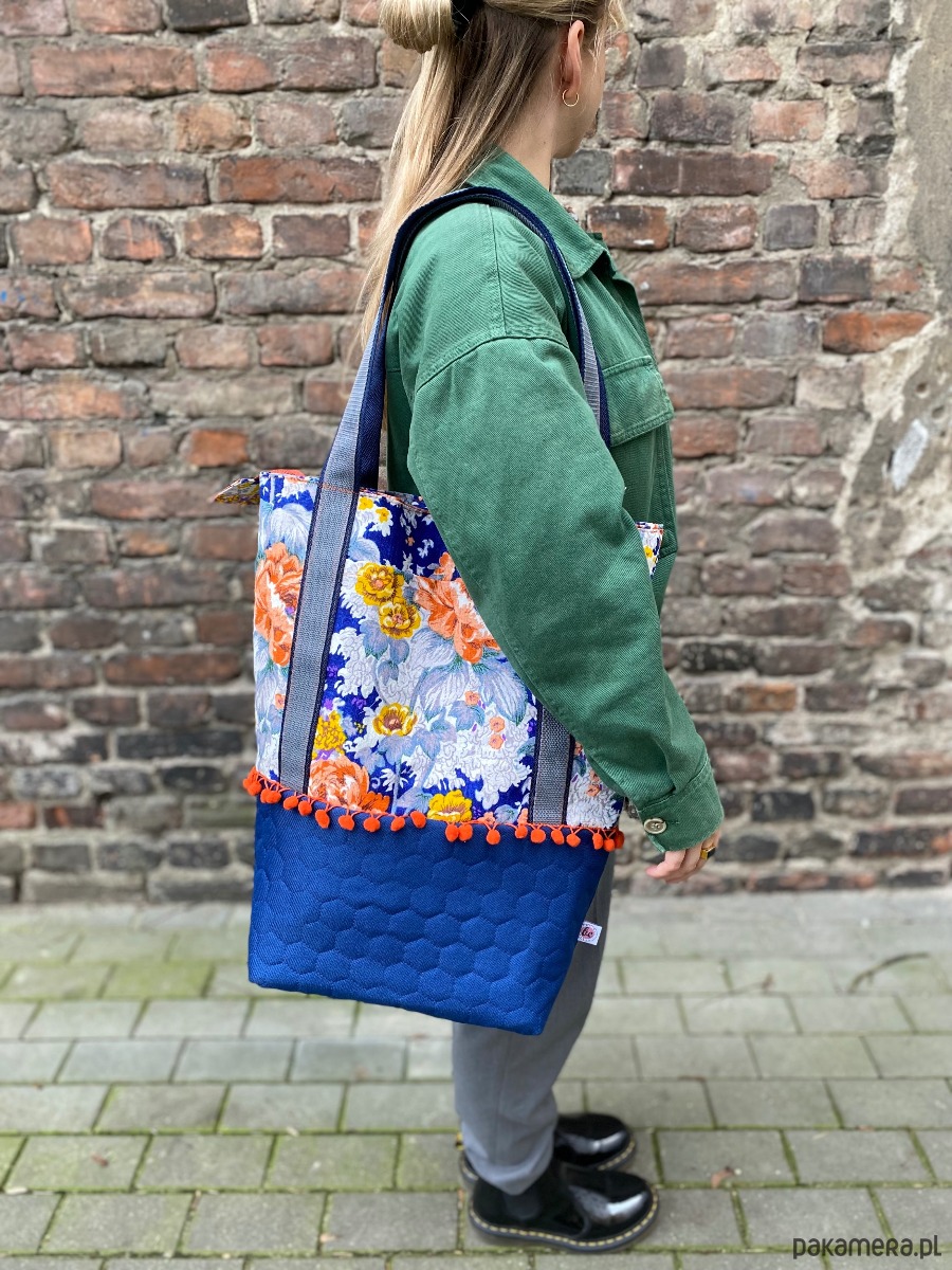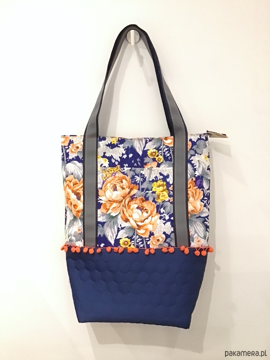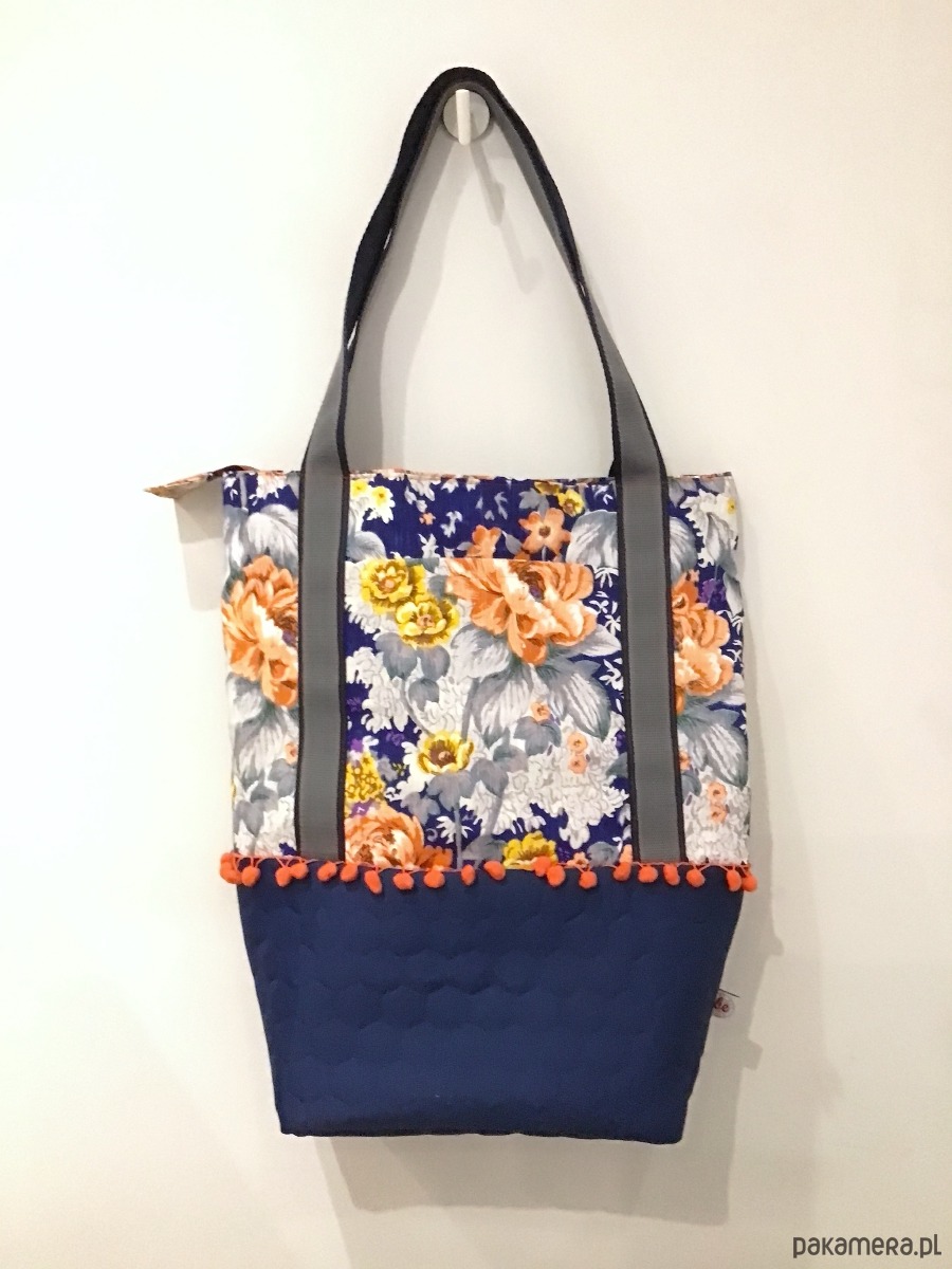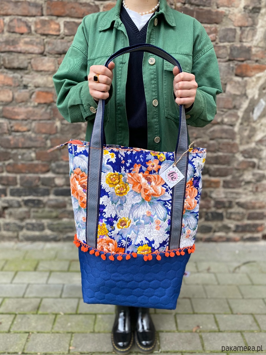 Oryginalna duża torba wykonana w pojedynczym egzemplarzu, została uszyta z różnych tkanin. Góra powstała z grubo tkanej bawełny w pomarańczowe i żółte kwiaty, dół z kobaltowej pikowanej wodoodpornej tkaniny. Na zewnątrz po dwóch stronach dwie otwarte kieszenie. Torba jest w całości delikatnie usztywniona, zapinana na suwak. W środku jest bawełniana podszewka żółta w paski oraz liczne kieszenie (w tym jedna duża na suwak). Uchwyty wykonane z podwójnej mocnej taśmy. Torba jest bardzo pojemna. Idealnie sprawdzi się zarówno na co dzień jak i na wyjazdach.