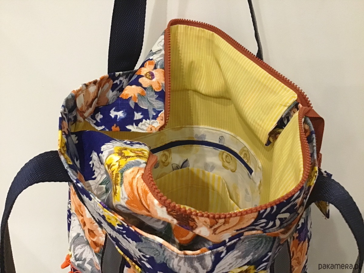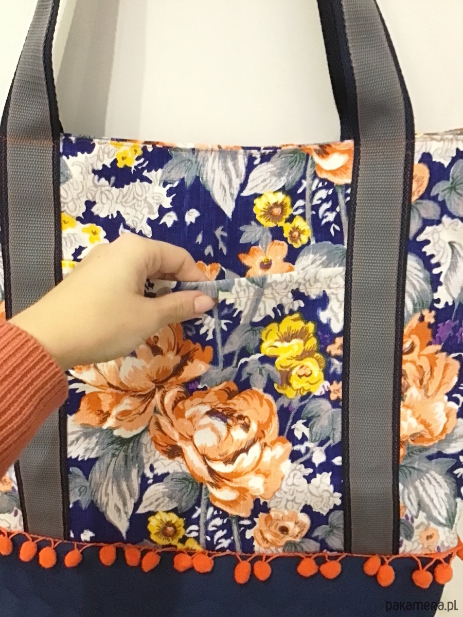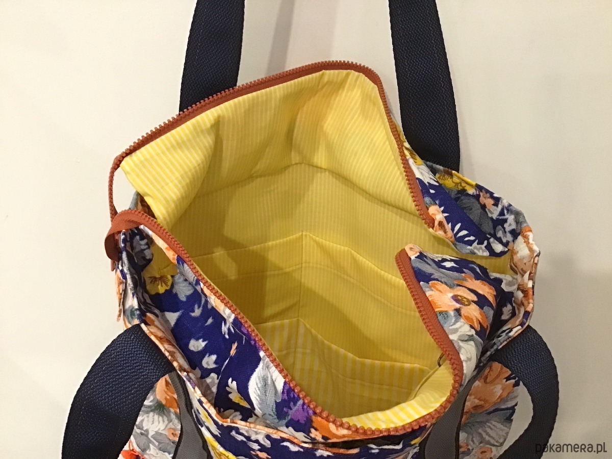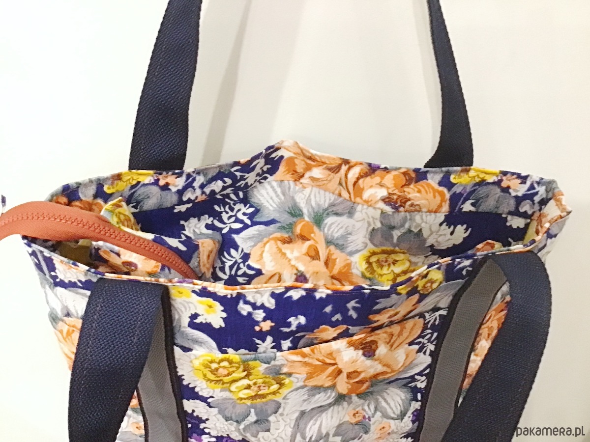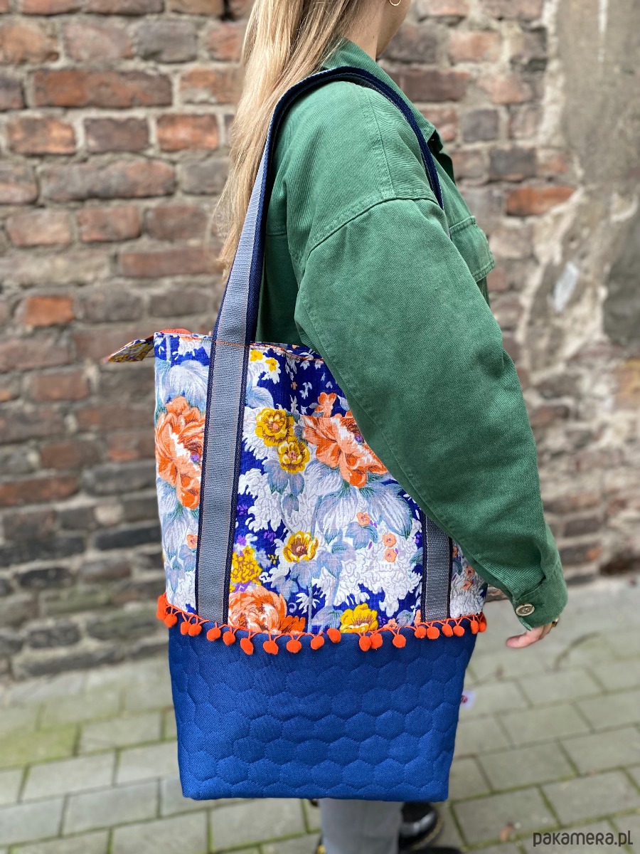 Oryginalna duża torba wykonana w pojedynczym egzemplarzu, została uszyta z różnych tkanin. Góra powstała z grubo tkanej bawełny w pomarańczowe i żółte kwiaty, dół z kobaltowej pikowanej wodoodpornej tkaniny. Na zewnątrz po dwóch stronach dwie otwarte kieszenie. Torba jest w całości delikatnie usztywniona, zapinana na suwak. W środku jest bawełniana podszewka żółta w paski oraz liczne kieszenie (w tym jedna duża na suwak). Uchwyty wykonane z podwójnej mocnej taśmy. Torba jest bardzo pojemna. Idealnie sprawdzi się zarówno na co dzień jak i na wyjazdach.