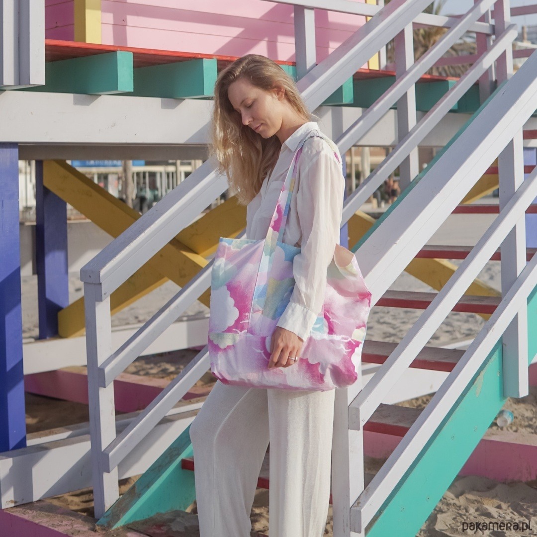 Różowe Chmurki to torba dla marzycielek – subtelna, pastelowa, jak wyjęta z bajkowego snu. Jej niepowtarzalny wzór przypomina dziecięce ilustracje nieba – miękkie chmurki w odcieniach różu, fioletu i błękitu, przeplatające się z delikatnymi tęczowymi łukami. Ta torba nie tylko przyciąga wzrok, ale też natychmiast wywołuje uśmiech – bo moda może być nie tylko praktyczna, ale i przyjemna.