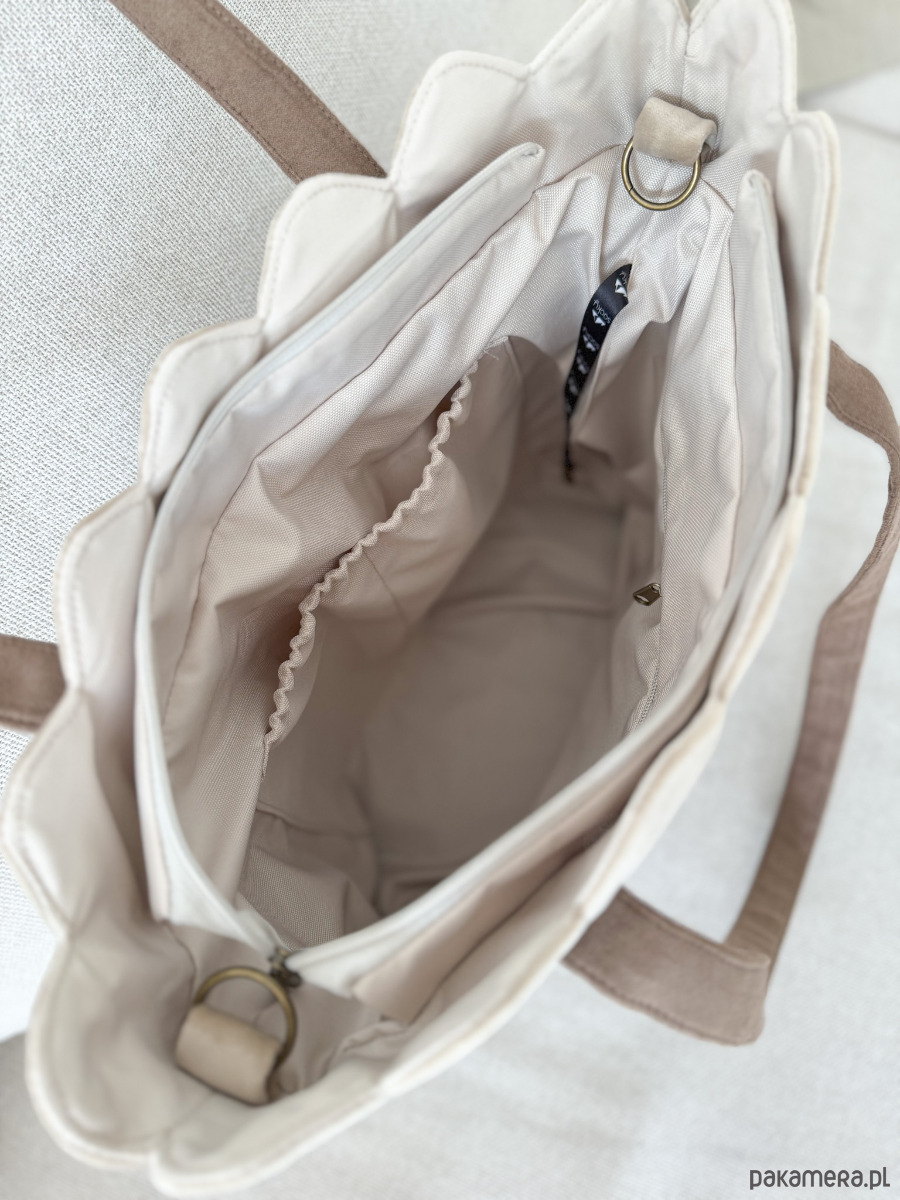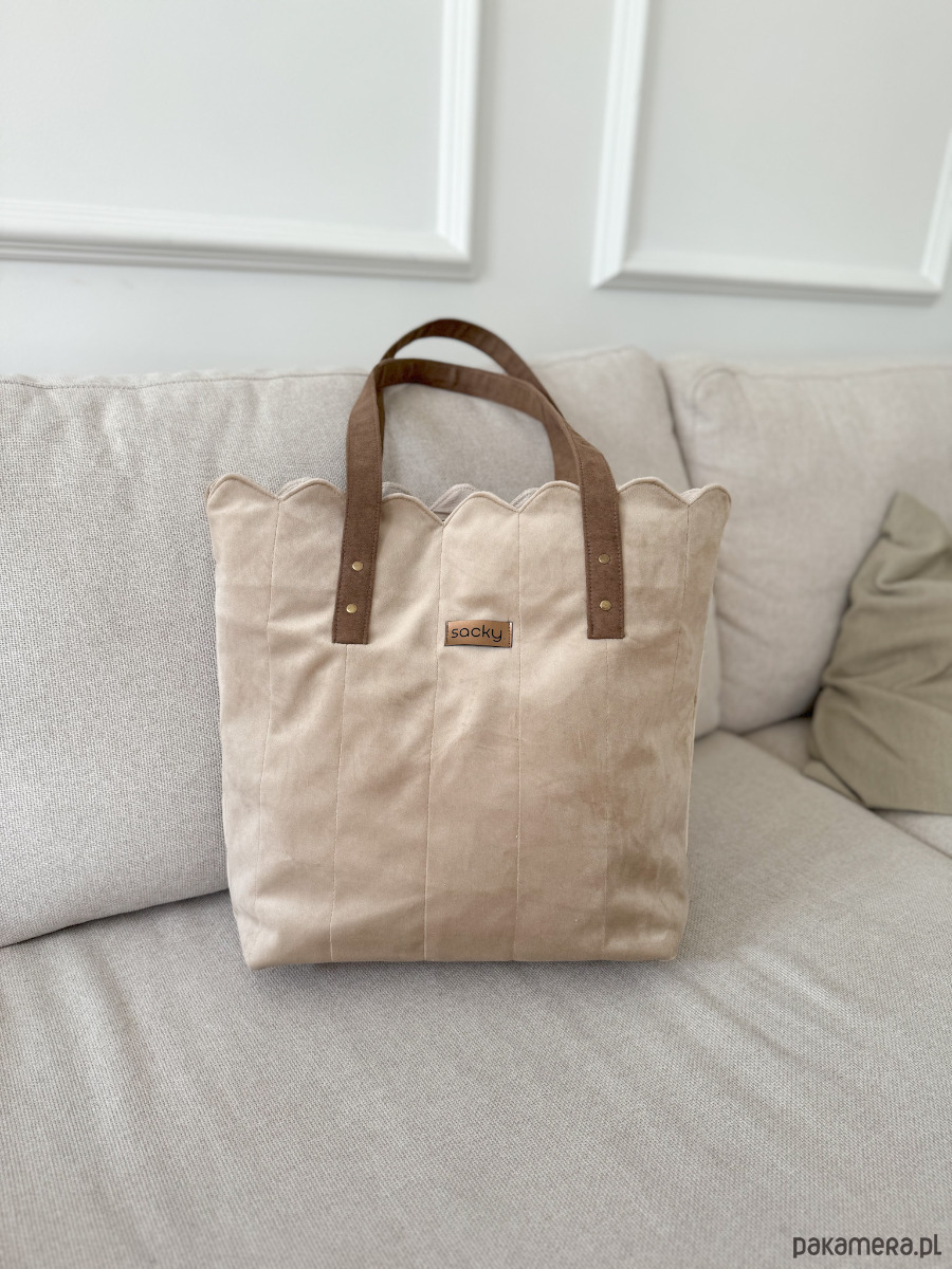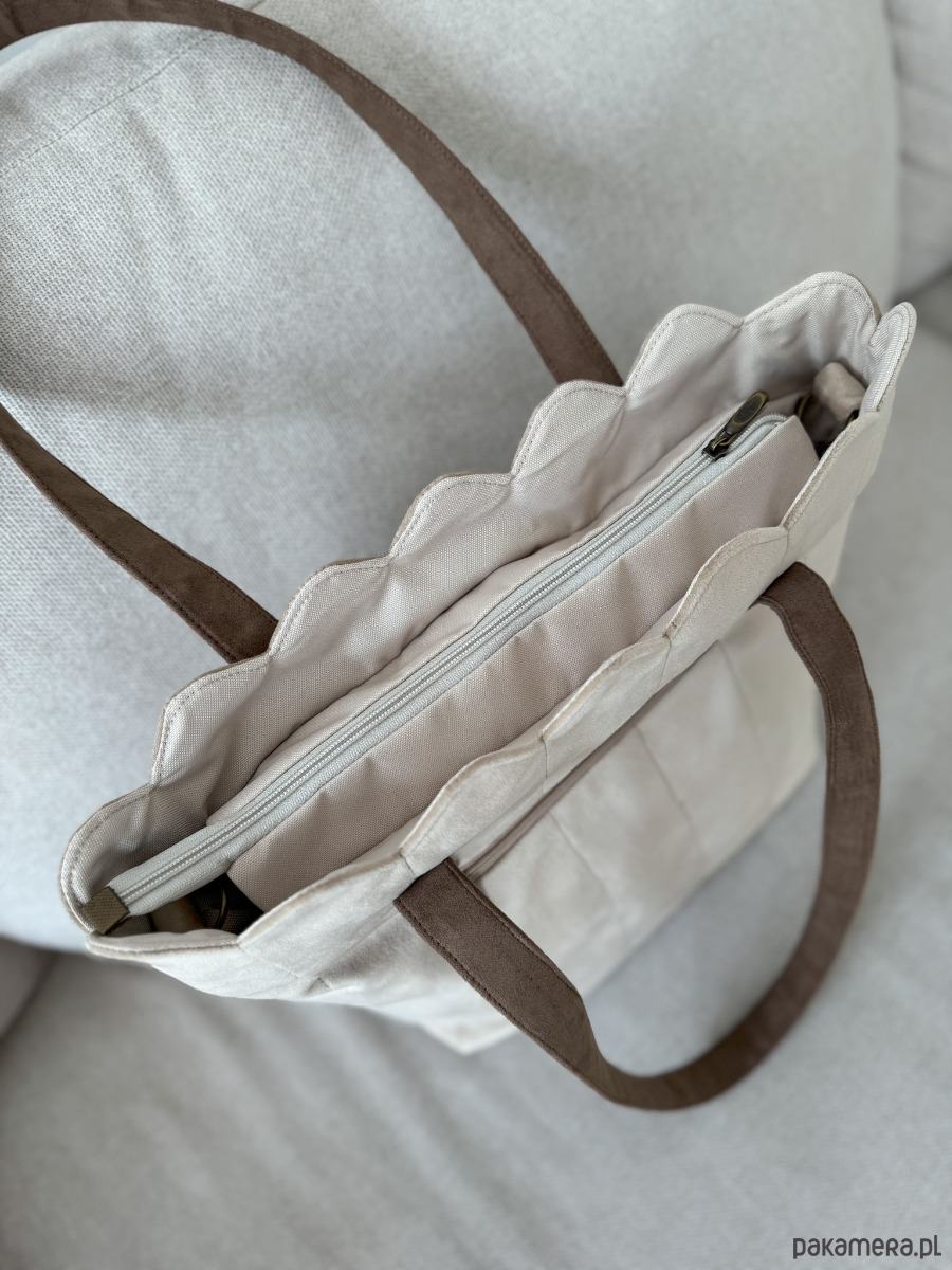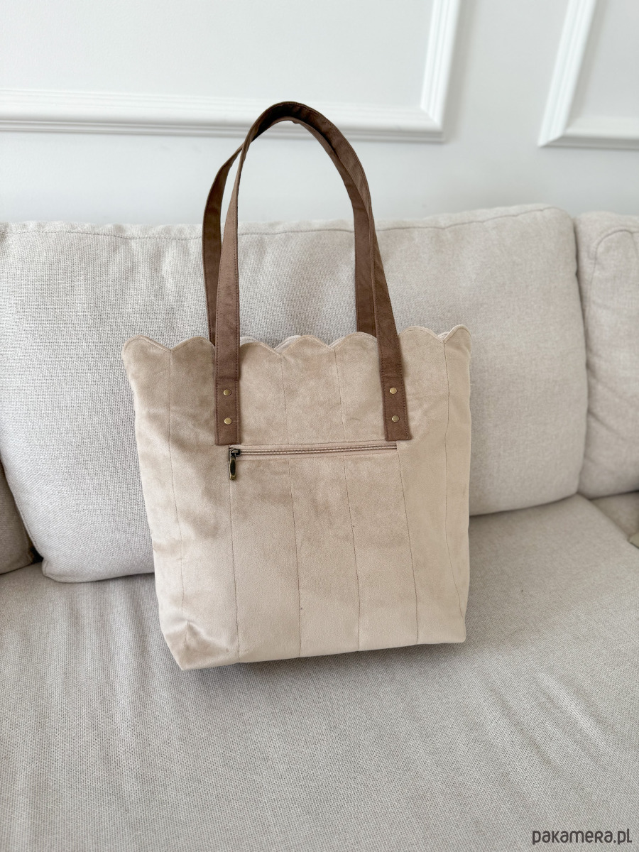 Torba welurowa muffin wanilia z falowanym ozdobnym brzegiem dopełni Twoje stylizacje! Zapinana na zamek shopperka z wodoodporną podszewką pod kolor torby. Na tyle, jak i w środku znajdziesz kieszeń na zamek.