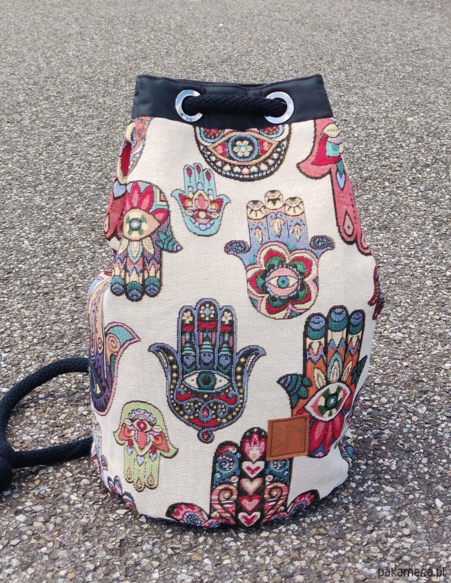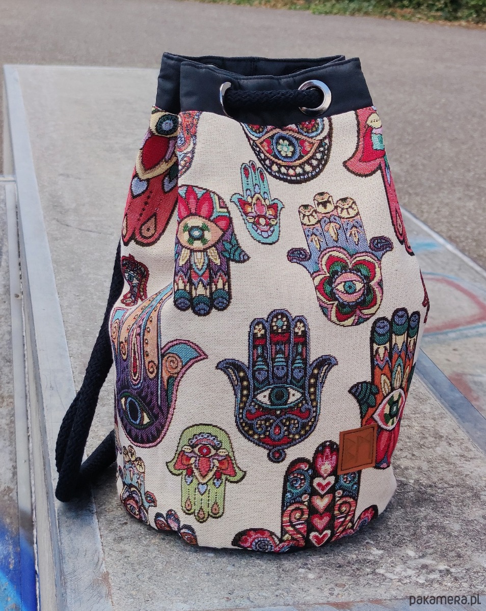 Torba worek ściągany trokiem. Do noszenia jak się komu podoba, na ramię, na oba, na krzyż... Wewnątrz nieprzemakalna podszewka z kieszenią na zamek. Wysokość 45, szerokość 40