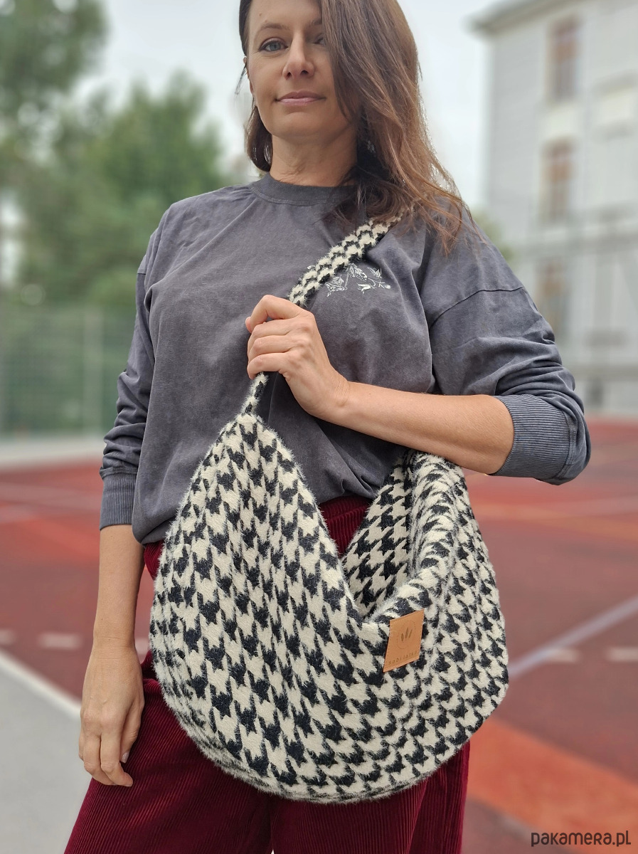 Średniej wielkości, minimalistyczna torba worek wykonana z grubej, miękkiej w dotyku tkaniny o powierzchni z meszkiem.