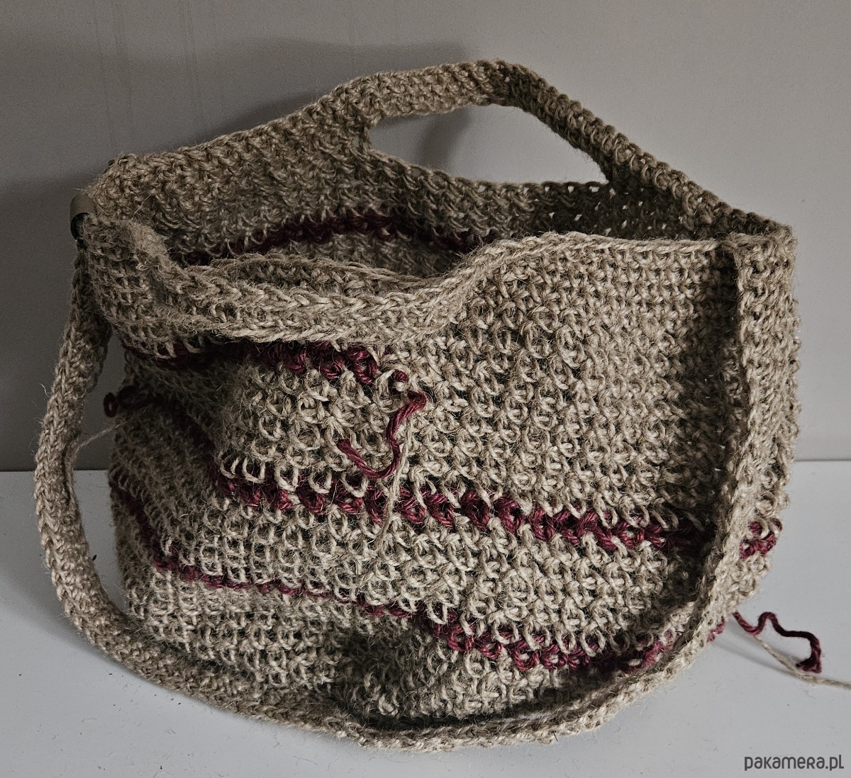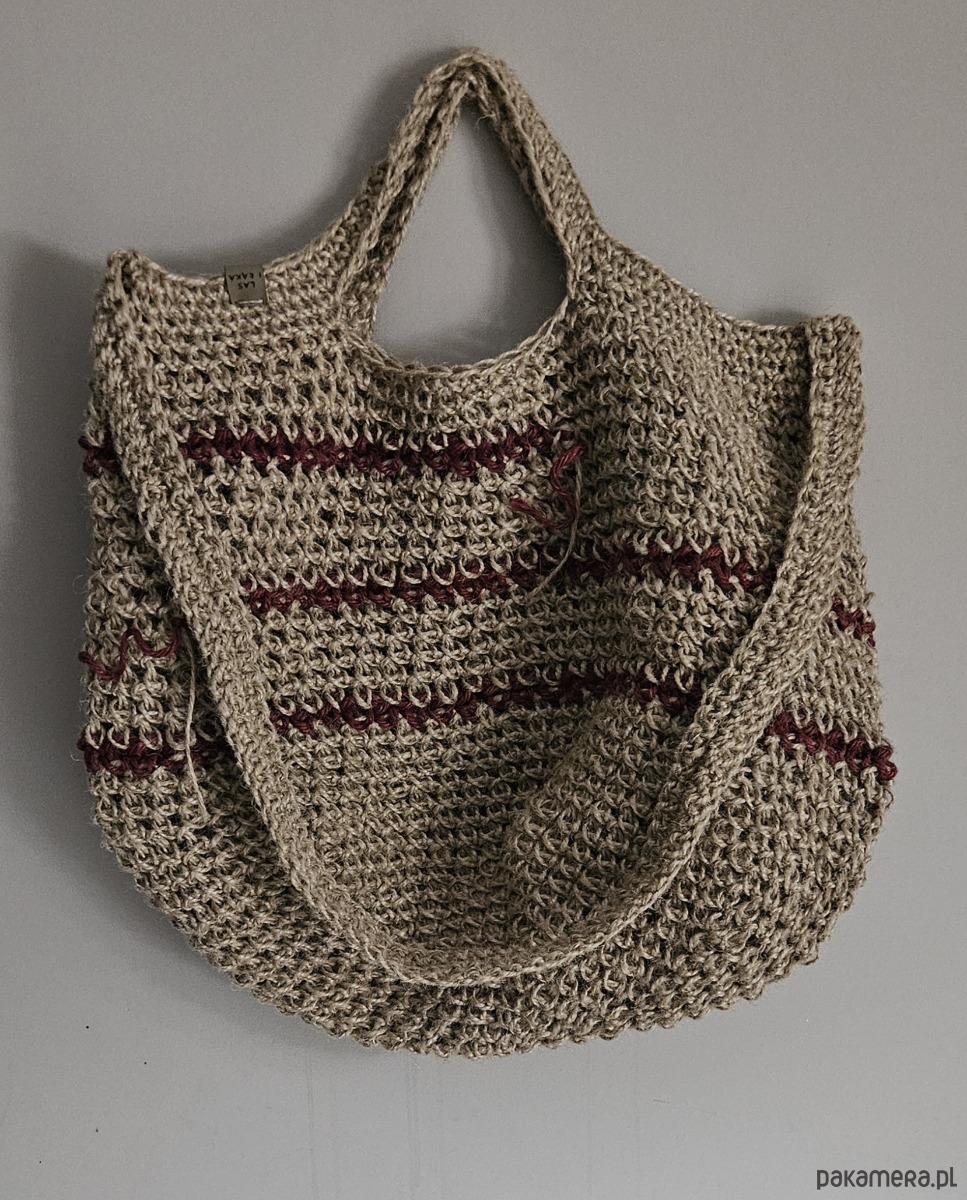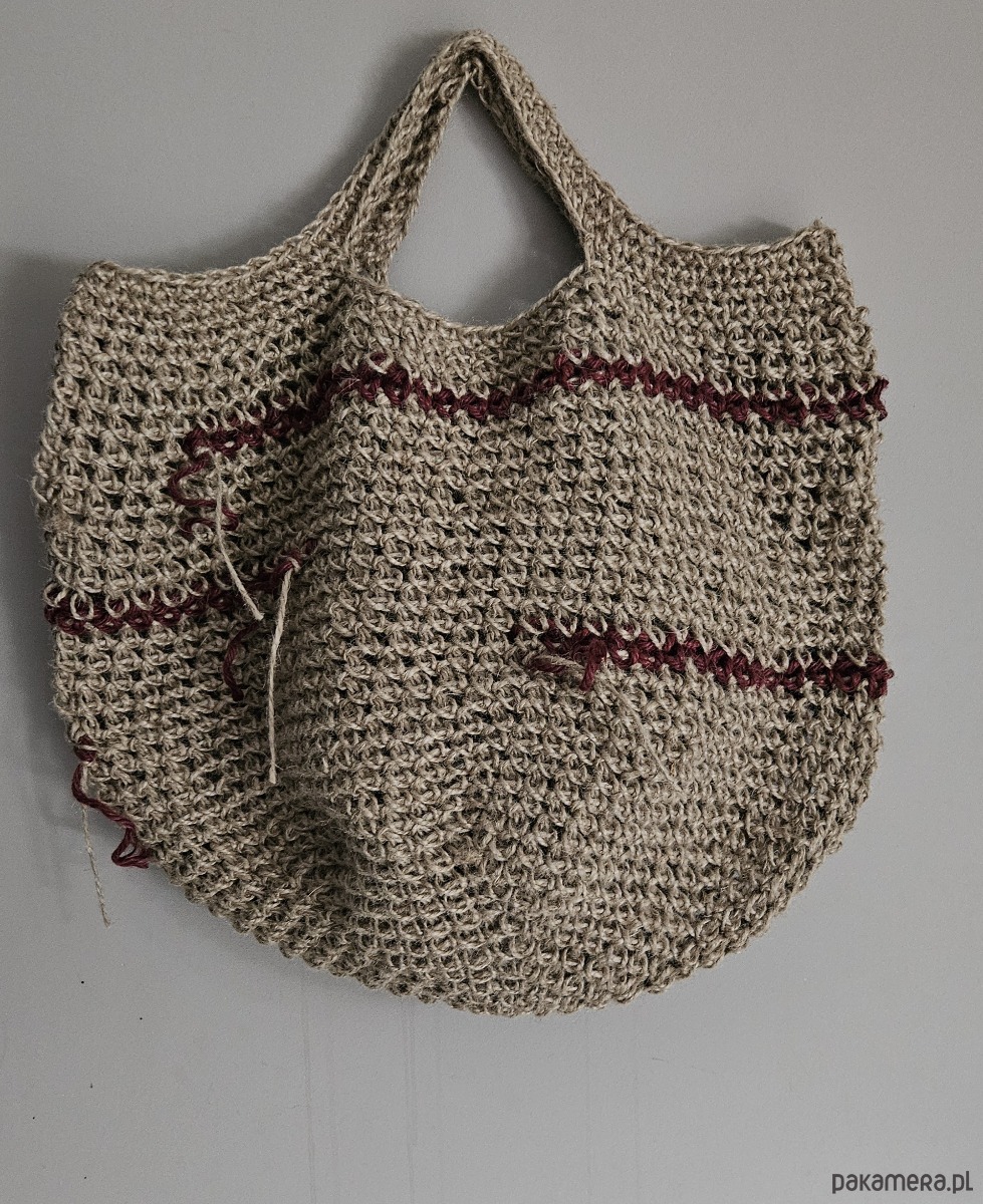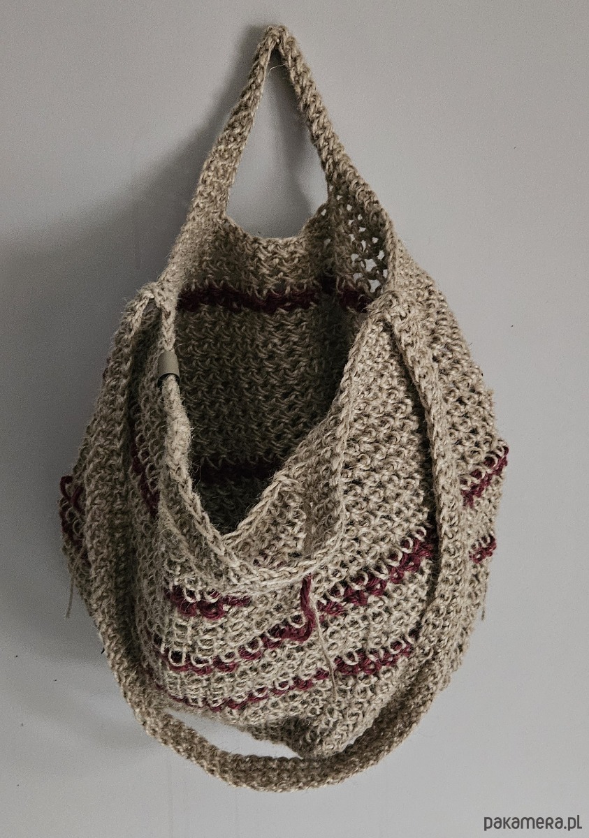 Naturalna struktura konopi nadaje jej surowy, lekko rustykalny charakter, a subtelne, bordowe akcenty delikatnie przełamują stonowaną kolorystykę. Świetnie sprawdzi się na co dzień – na zakupy, spacer, targ lub jako stylowy dodatek do boho i naturalnych stylizacji.