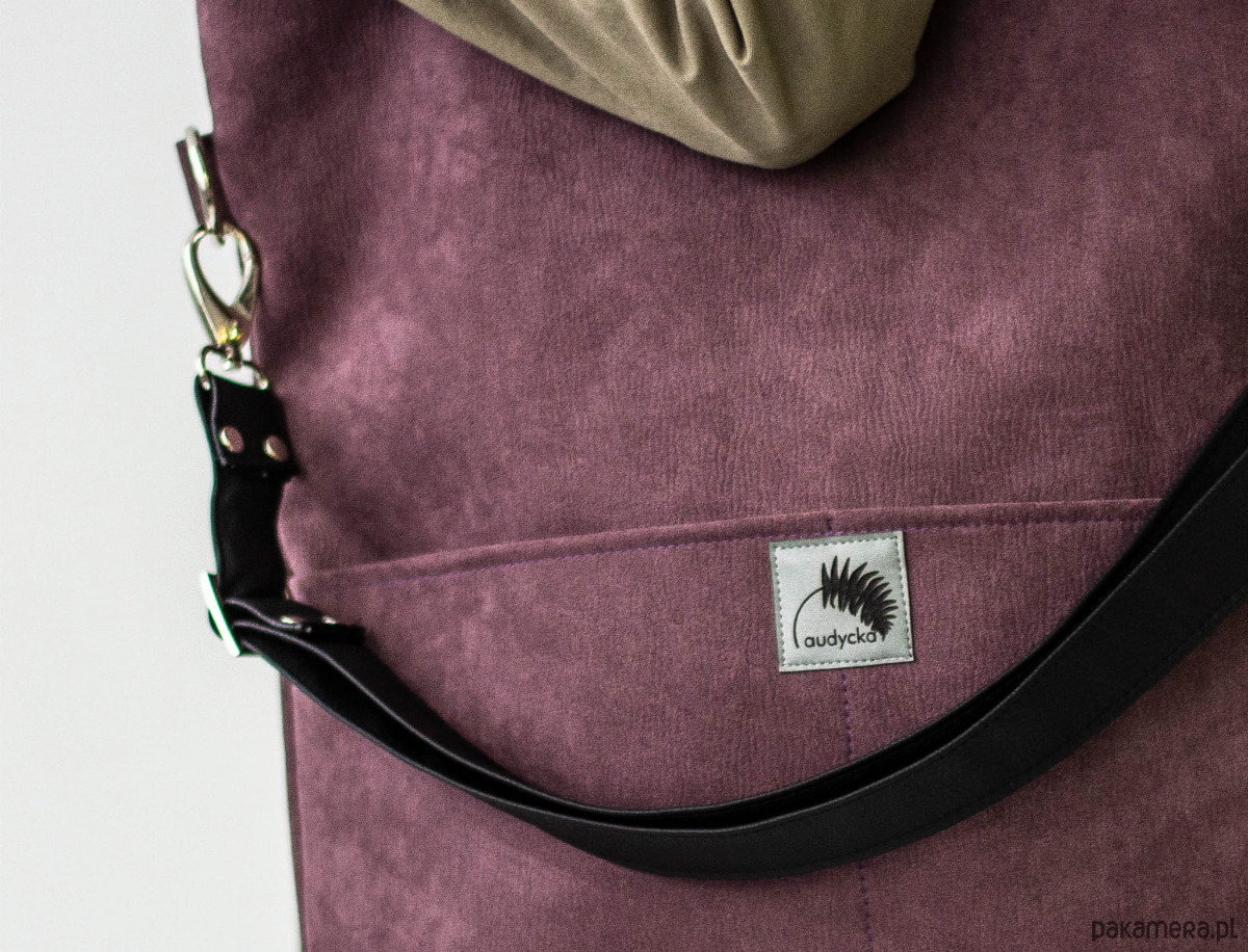 Duża zamszowa torba (sztywny, gruby, wodoodporny nubuk ekologiczny ) w kolorze jasnej śliwki do noszenia na ramieniu i na skos na długim regulowanym, dopinanym pasku.