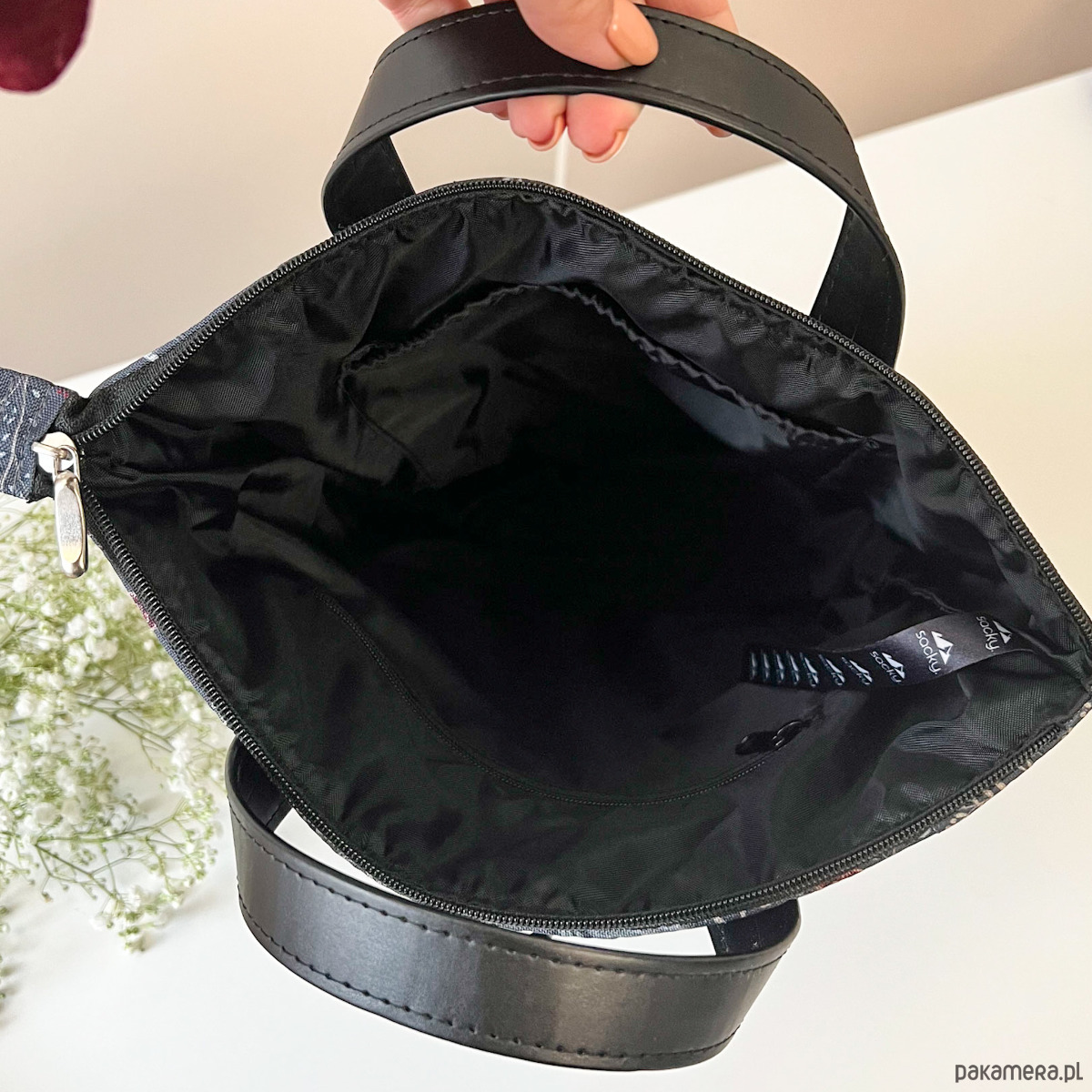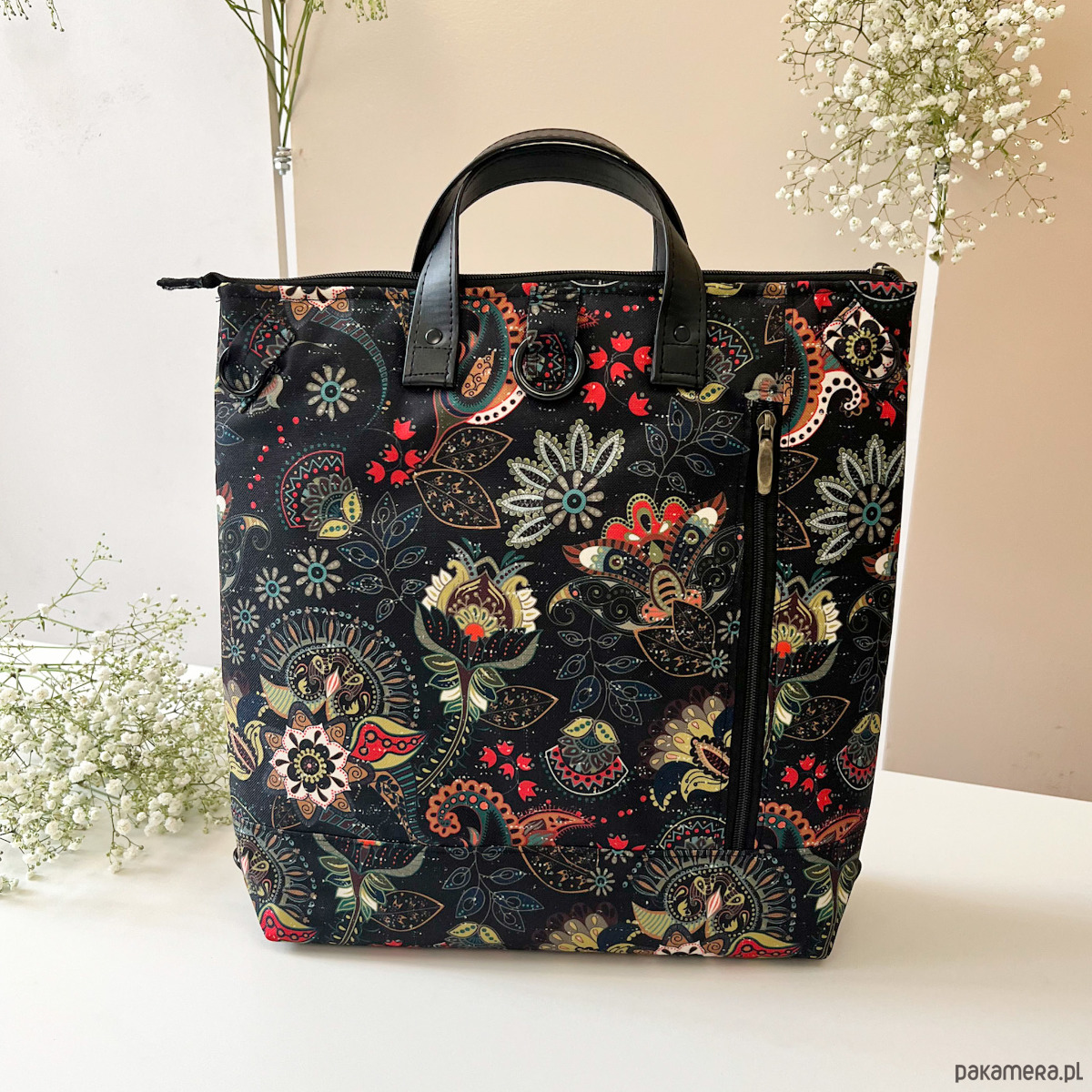 Torbo plecak 2w1 mandala to piękny, pojemny torbo plecak zapinany na zamek z opcją regulacji pasków. Odpinane szelki pozwalają Ci decydować, czy będzie to torba, a może plecak 🙂 Plecak wykonany jest z wodoodpornej tkaniny w piękny kwiatowy nadruk. Główna komora torbo plecaka jest zapinana na zamek, co zapewni Ci bezpieczeństwo Twoich rzeczy. Wewnątrz znajduje się czarna wodoodporna podszewka oraz dwie kieszonki (podstawowa oraz zapinana na zamek). Na tyle torbo plecaka znajdziesz dodatkową kieszeń zasuwaną na zamek.