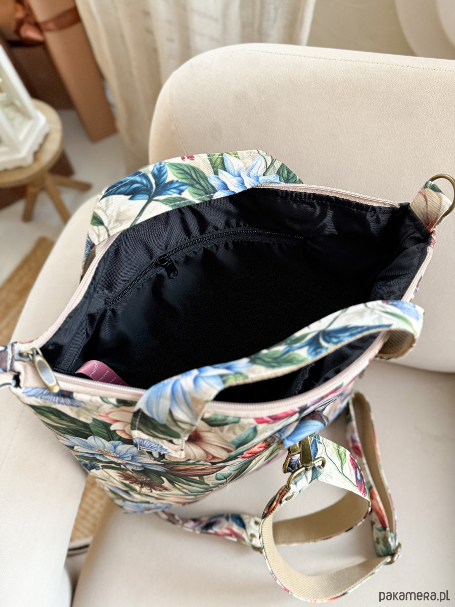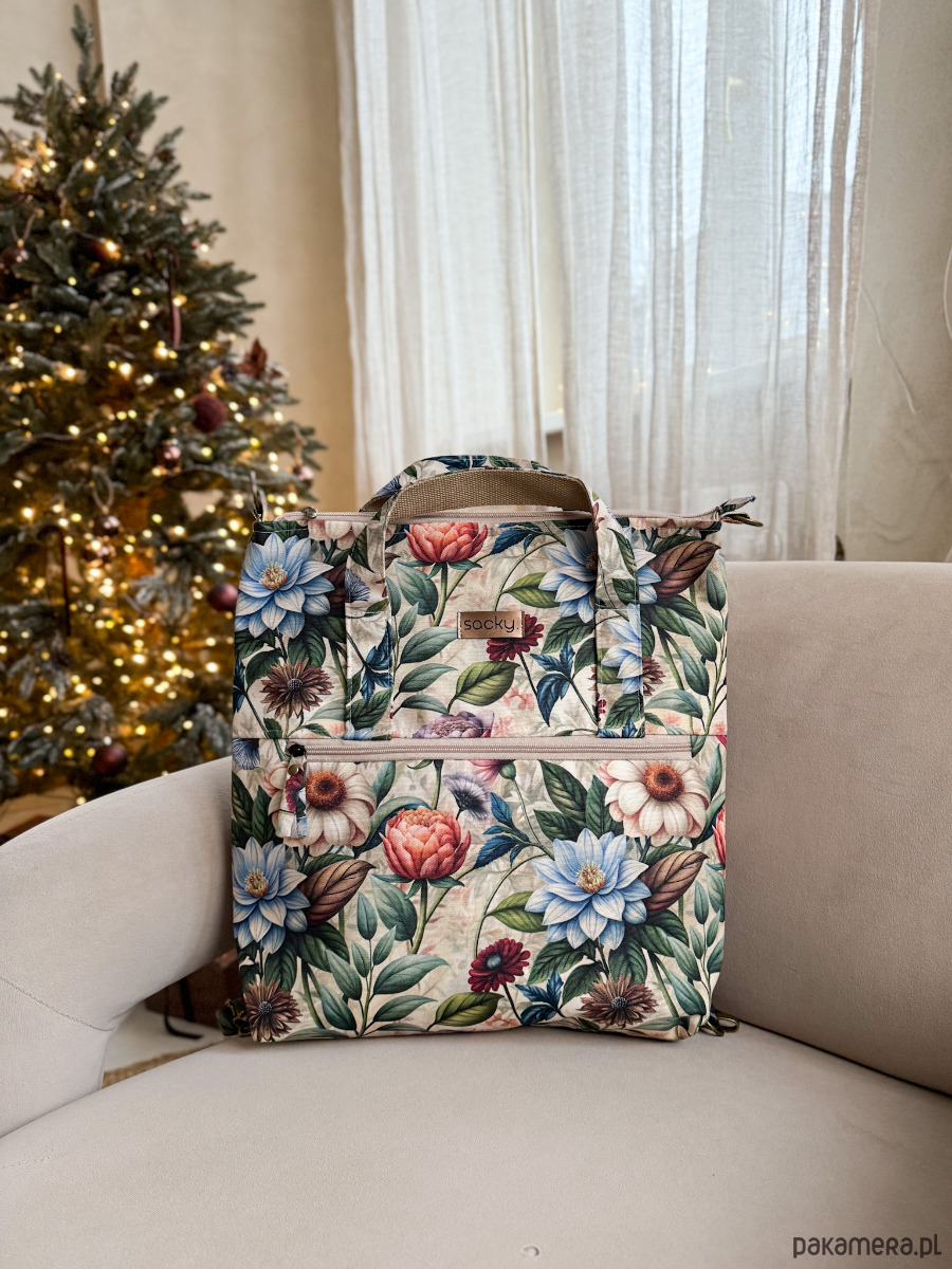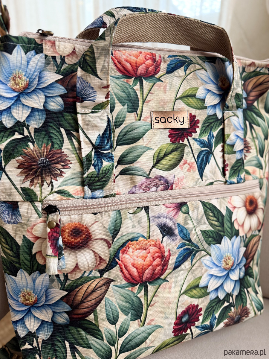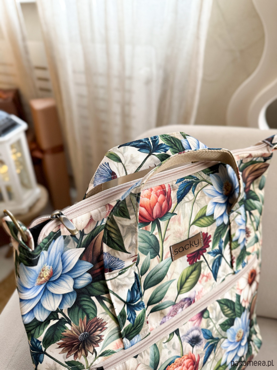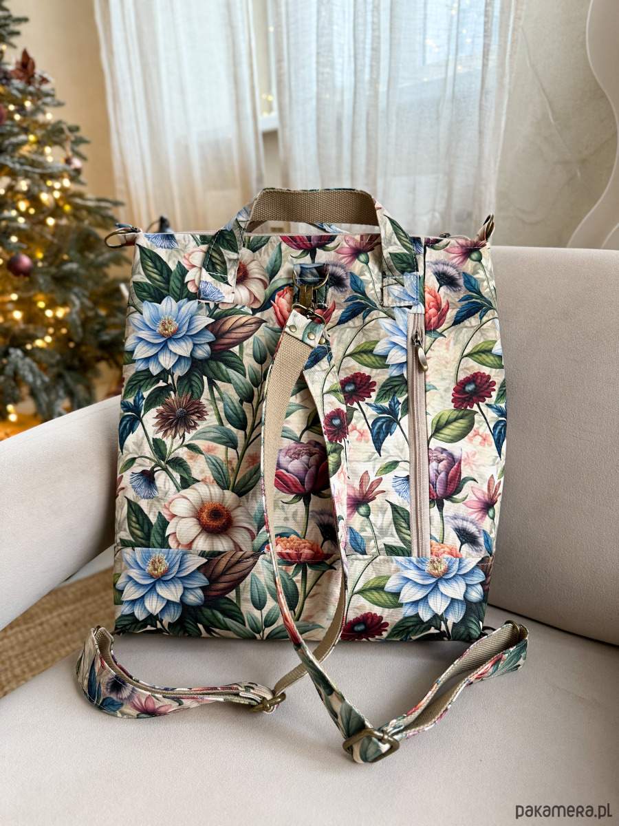 Torbo plecak wodoodporny jutrzenka to piękny, pojemny torbo plecak zapinany na zamek z opcją regulacji pasków. Odpinane szelki pozwalają Ci decydować, czy będzie to torba, a może plecak 🙂 Plecak wykonany jest z wodoodpornej tkaniny w piękny kwiatowy nadruk. Główna komora torbo plecaka jest zapinana na zamek, co zapewni bezpieczeństwo Twoich rzeczy. Na przodzie, jak i na tyle znajduje się duża kieszeń na zamek. Wewnątrz znajduje się czarna wodoodporna podszewka oraz dwie kieszonki (otwarta oraz zapinana na zamek).