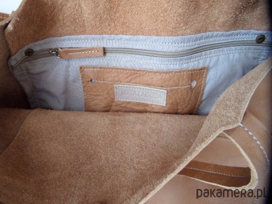 Wewnątrz skóra, w środku kieszeń z płótna zapinana na zamek i mniejsza na telefon.