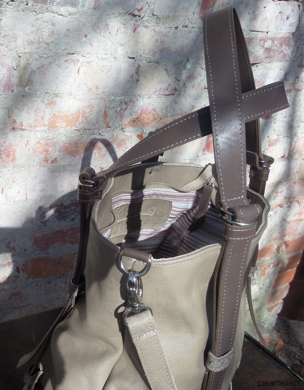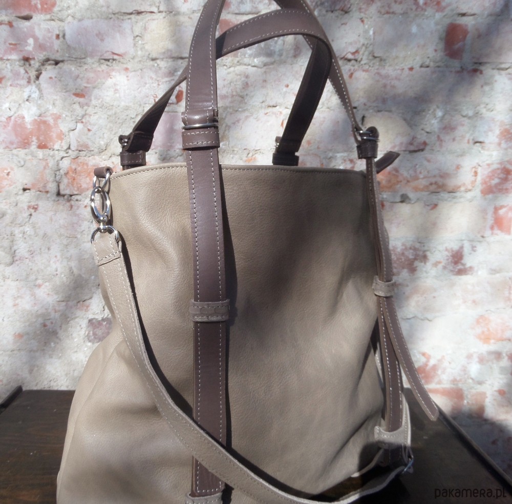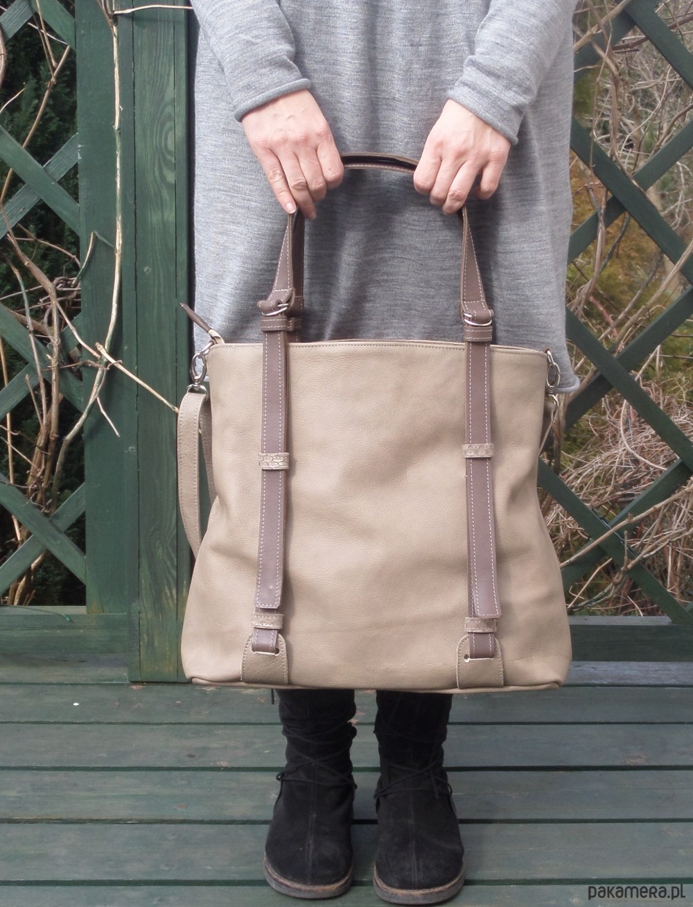 Duża skórzana torba uszyta z ze skóry naturalnej w kolorze beżowym (chłodniejszy odcień). Paski i uchwyty ciemniejsze. Torba raczej miękka, choć skóra jest grubsza.. Uchwyty regulowane - do noszenia w ręku lub na ramieniu. Dno usztywnione. W komplecie długi regulowany pasek. Torba zapinana na zamek, wyłożona bawełnianą podszewką, wewnątrz ma 1 kieszeń na zamek i 2 mniejsze np. na telefon i . Efektowna i praktyczna też. Gorąco polecam. Mieści a4. Wymiary i/lub waga Wysokość 34 cm, szer. ok. 40 cm, gł. dna 14 cm Wykorzystane materiały: 100 proc. skóra naturalna plus bawełniana podszewka.