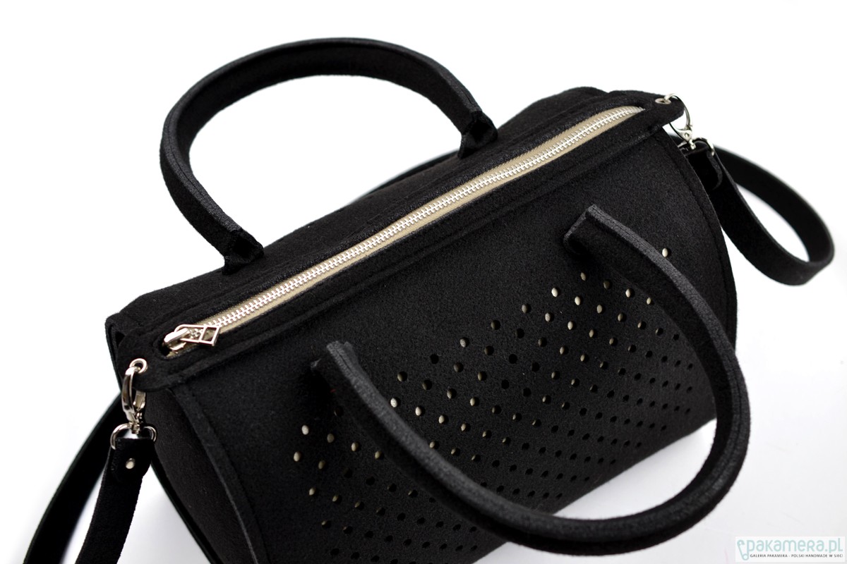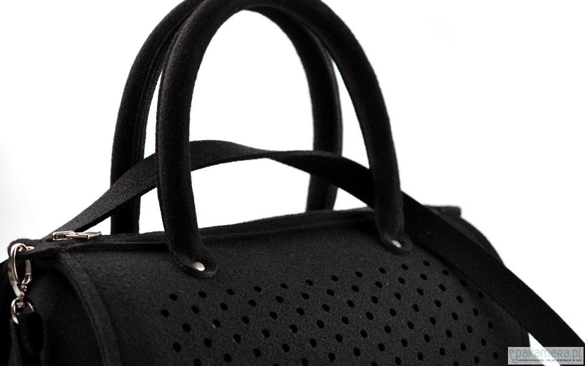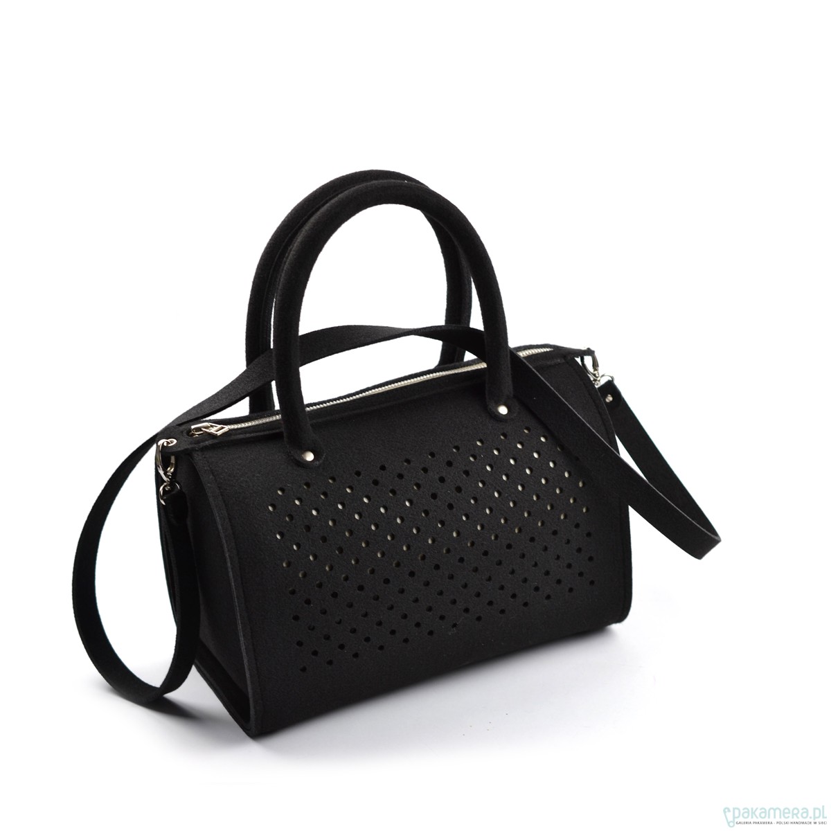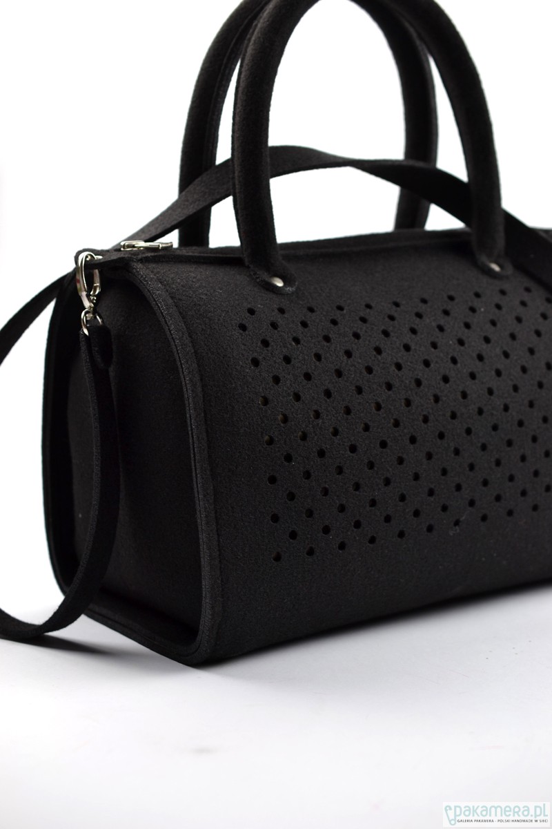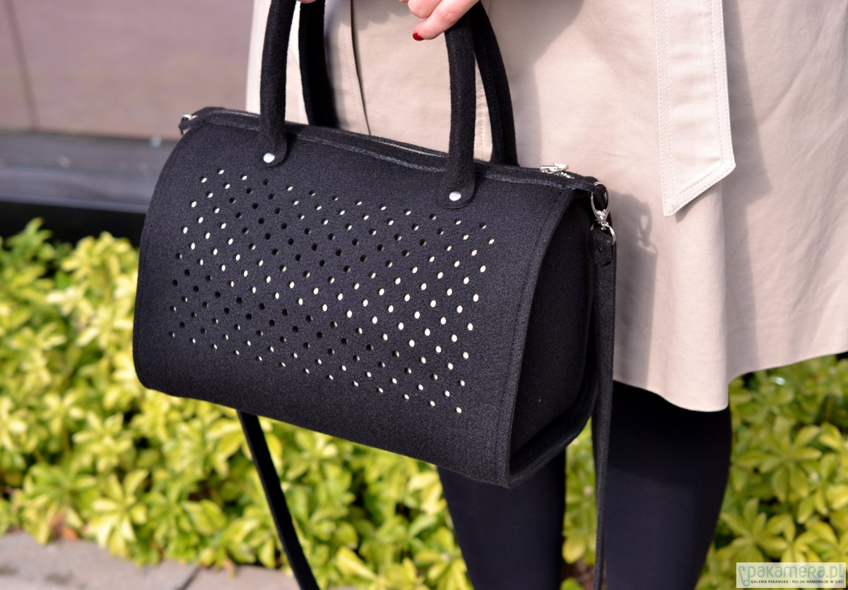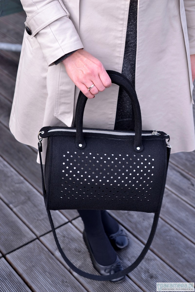 Fantastyczny kuferek FeltLabel. - idealny zarówno do pracy jak i na wypad za miasto. - pomieści wszelkie niezbędne kobietom drobiazgi i nie tylko ;) (gazety, dokumenty, kosmetyki, klucze, rzeczy dla dziecka - wszystko znajdzie w niej bezpieczną przystań;) - model: BlackDotsTrunk - kolekcja: filcMe - kształt: prostokąt - zapięcie: zamek błyskawiczny - kolor: czarny - wymiary: 30 cm x 20 cm, szerokość boku i podstawy 17 cm - materiał: filc 4 mm - uchwyt: zarówno do ręki jak i długi, dopinany pasek na ramię 120 cm - wnętrze: bez dodatkowych kieszonek i podziałów - wzór: podszewka” ze skóry ekologicznej w kolorze bezowym – prześwituje przez wycięte kółeczka i jednocześnie usztywnia torbę - interesuję Cię zmiany? inny rozmiar, kolor?