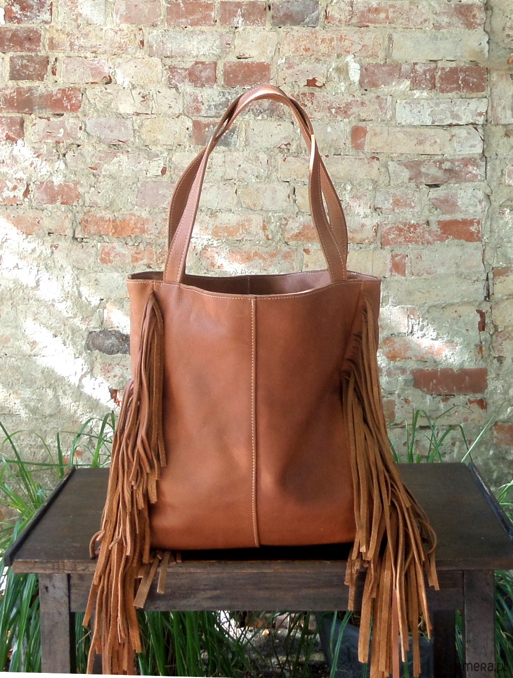 Piękna duża torba uszyta z naturalnej skóry w kolorze ciepłego brązu. Skóra miękka, mięsista. Frędzle spływają w 4 rzędach. Torba Zapinana na zamek. Torba wewnątrz wyłożona podszewką , w podszewce 2 kieszonki skórzane na komórki i 1 kieszeń na zamek. Torba do noszenia na ramieniu (uchwyty 50 cm.),
