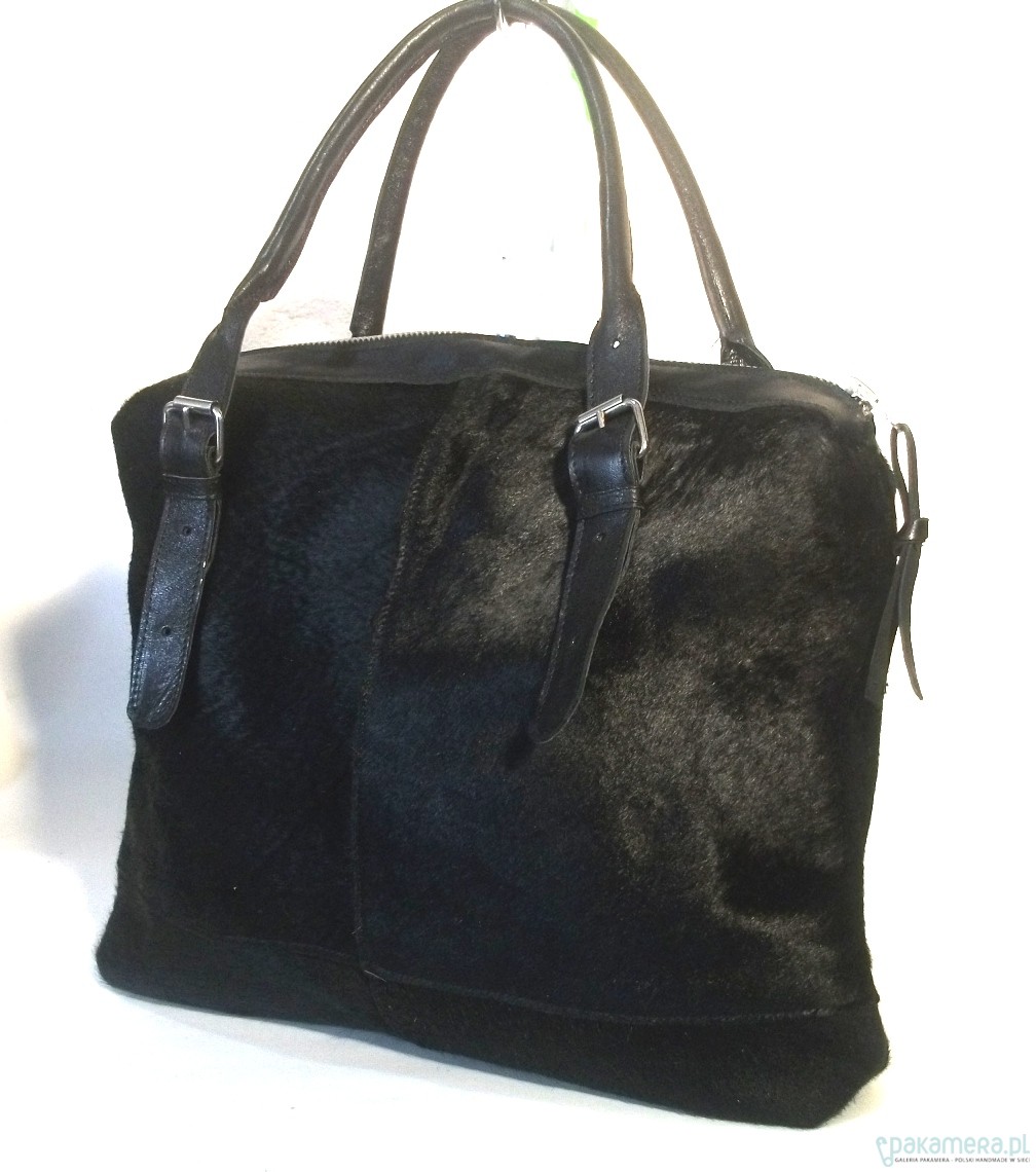Duża skórzana torba uszyta z futra naturalnego. Zapinana na zamek,, uchwyty regulowane, do noszenia w ręku lub na ramieniu. Wyłożona czarna podszewką. Wewnątrz kieszeń na zamek i 2 na telefony. Wys. 37 cm, szer. ok. 43 cm, gł. 10 cm. Przecena- góra wyszla lekko, ale to naprawdę lekko, asymetrycznie.
