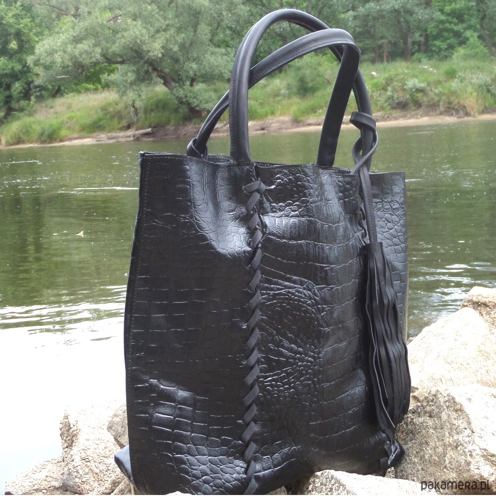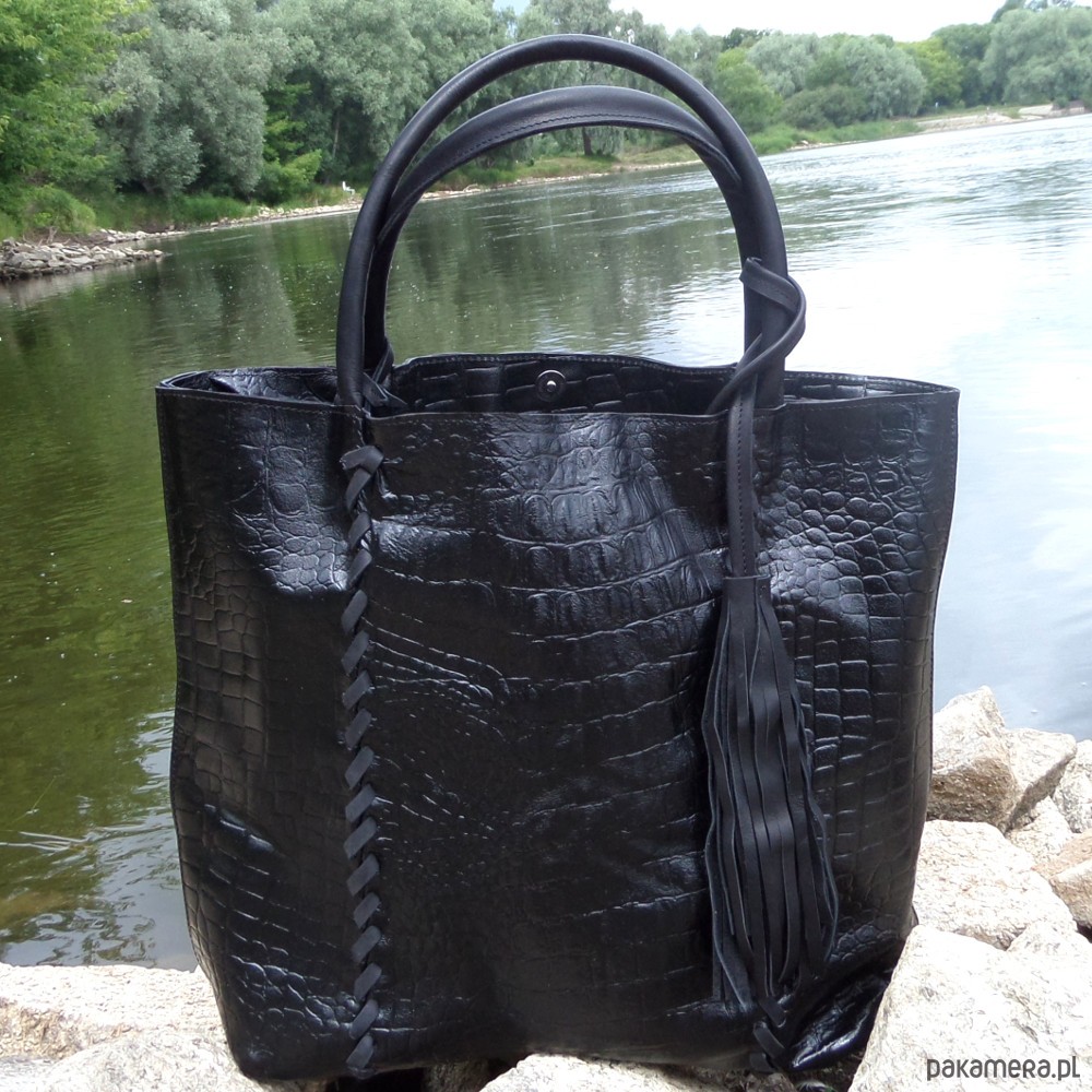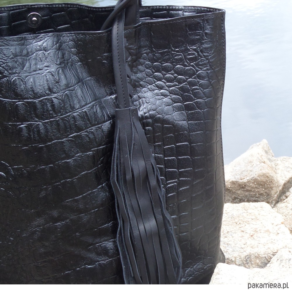 Duża torba uszyta ze skóry naturalnej czarnej, nabłyszczanej fakturowanej w krokodyla.