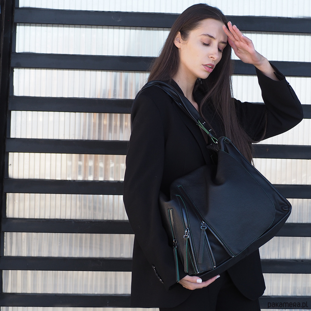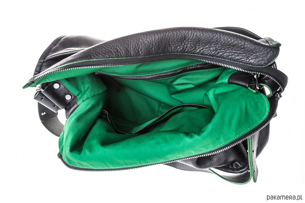 Baza, wykonana z czarnej, miękkiej skóry, zamykana na suwak. Wewnątrz wyposażona w trzy kieszenie: dużą, zapinaną na suwak oraz dwie mniejsze, na akcesoria. Z tyłu duża kieszeń zewnętrzna zamykana na magnes po dopięciu frontu. Wnętrze wykończone zieloną podszewką. Wszystkie okucia w kolorze ciemnego niklu. Brzegi malowane na zielono. Mieści format A4.