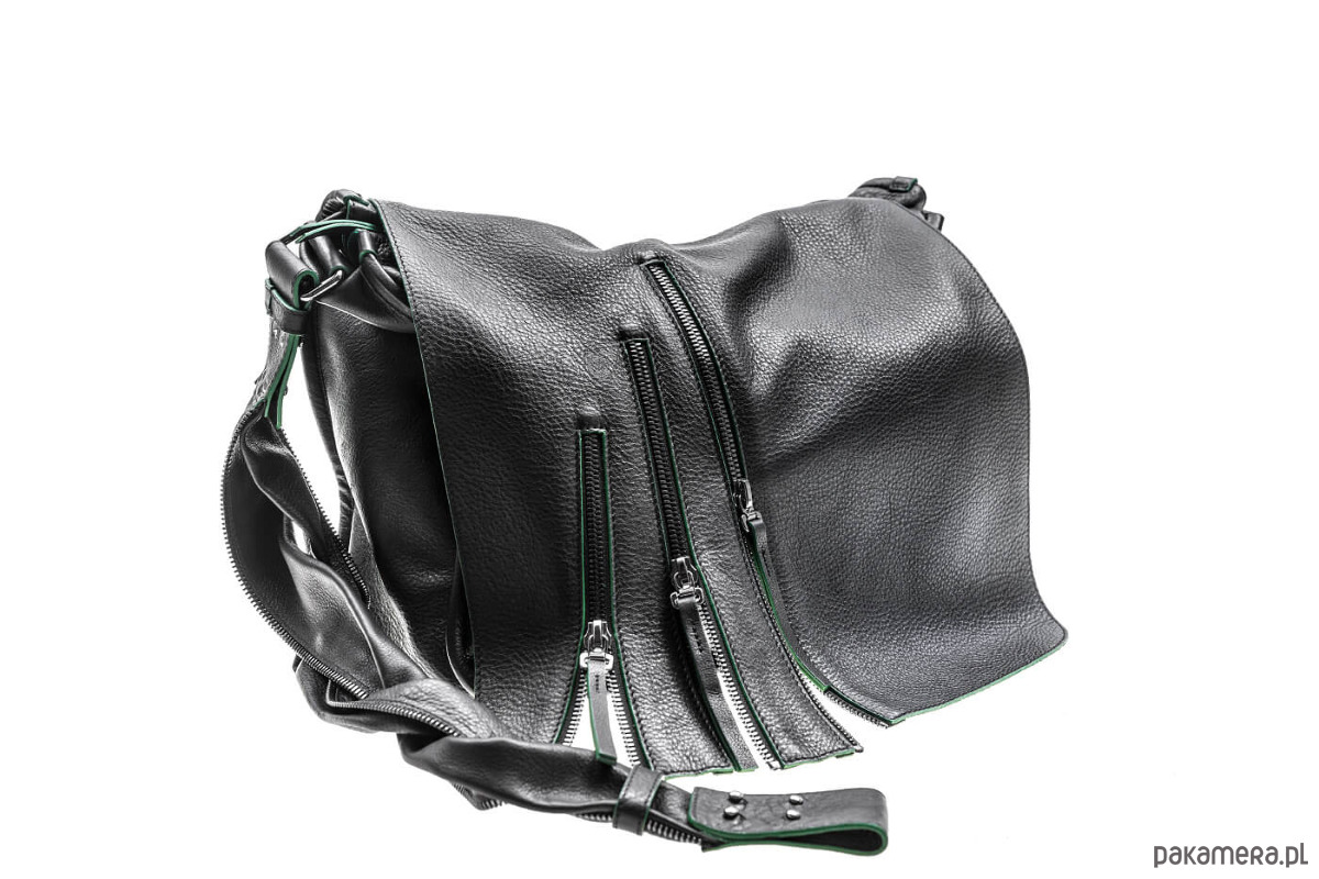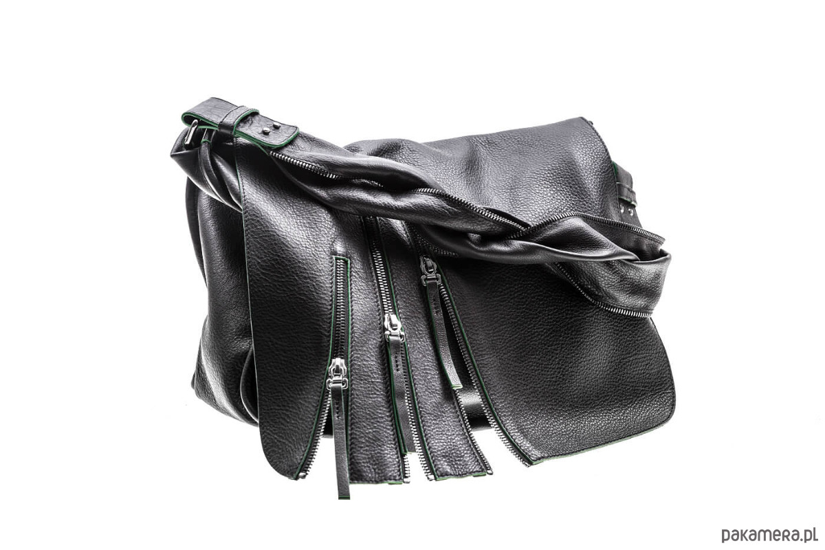 Front wykonany z czarnej skóry, zdobiony trzema rozsuwanymi suwakami, różnej długości. Metalowe elementy listwy suwakowej, w kolorze ciemnego niklu.