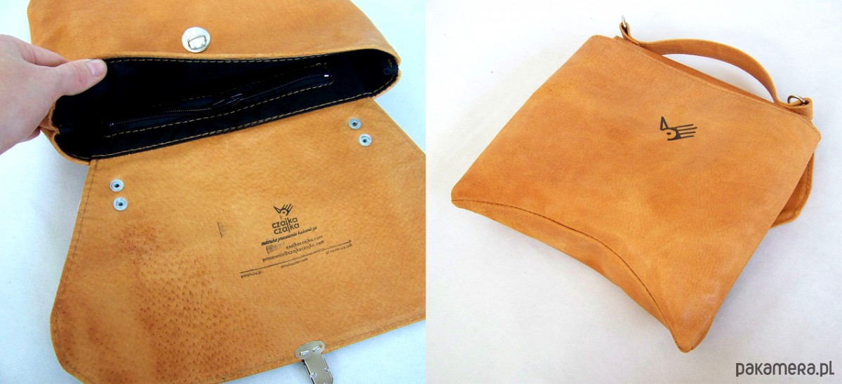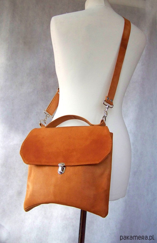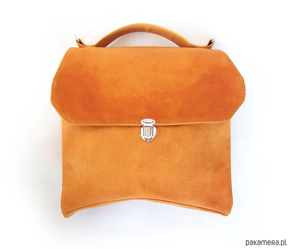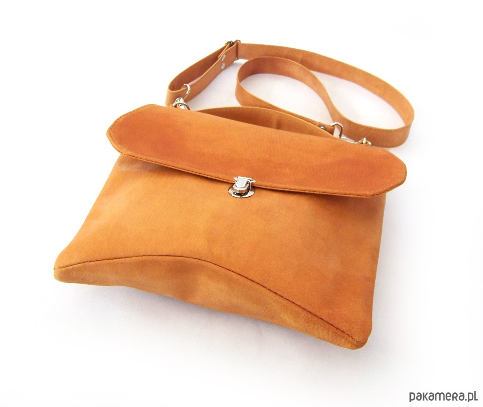 Niewielka torebka o oryginalnym kroju, przywodzącym na myśl japońskie dachy:) Skora naturalna, dwoina woskowana, kolor koniak, nieregularny. Do noszenia w dłoni lub na ramieniu. Wewnątrz kieszeń na zamek. Wysokość - 25, szerokość - 29, dł paska - max 130cm.