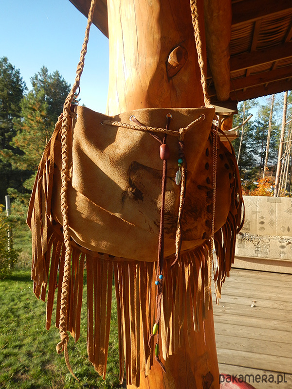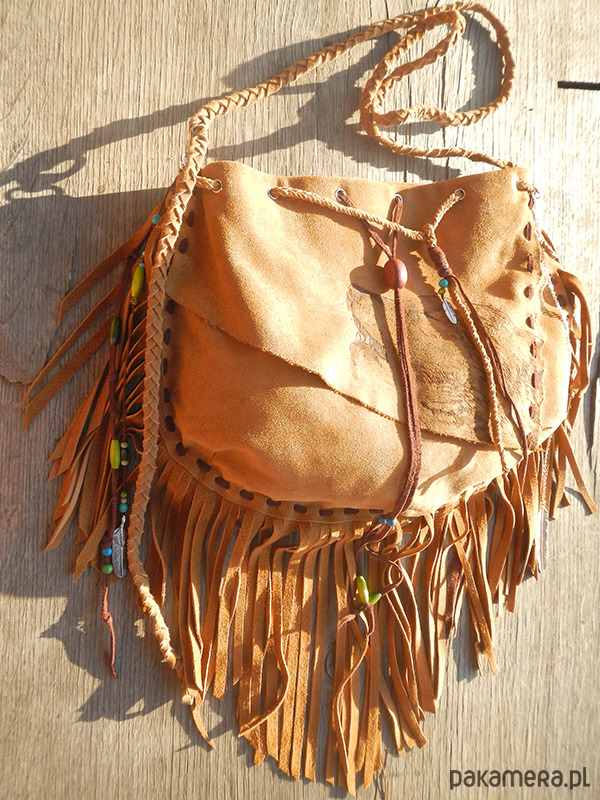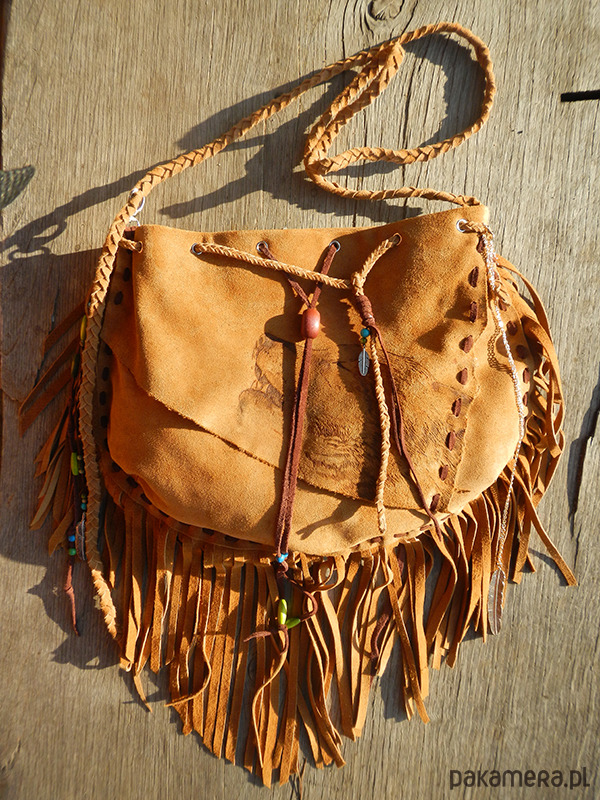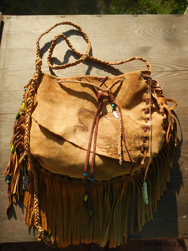 Szyta ręcznie rzemieniem.