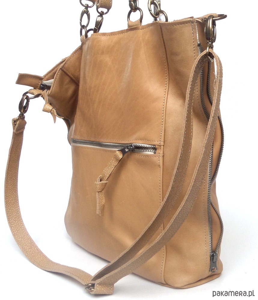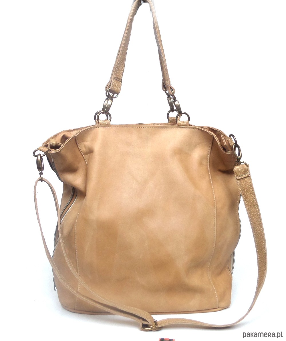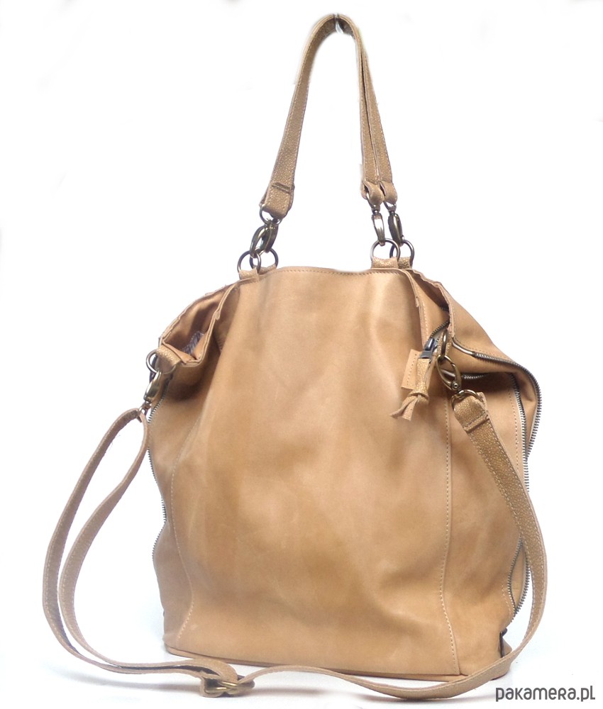 Duża, uszyta ze skóry naturalnej, w kolorze klasycznego beżu, jasnego wielbłądziego kamelu.