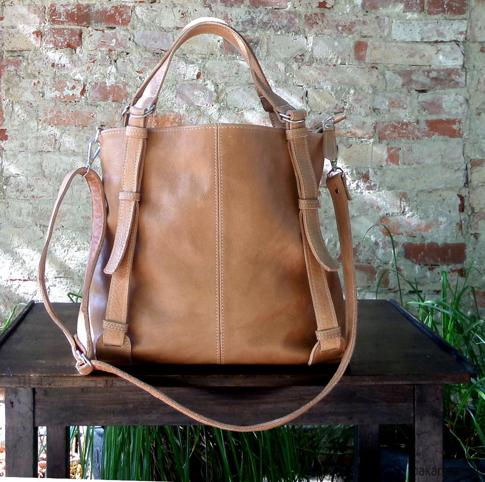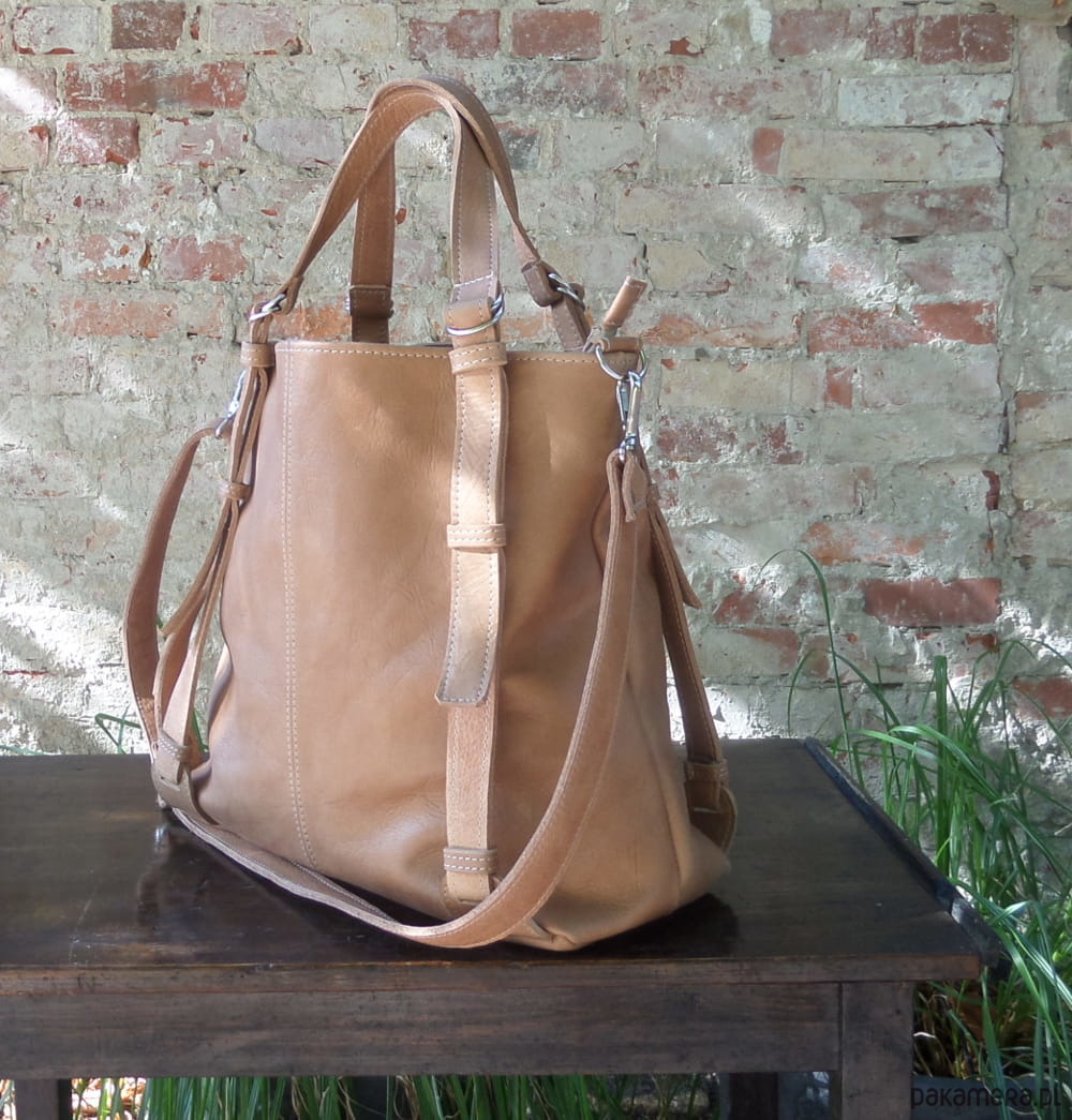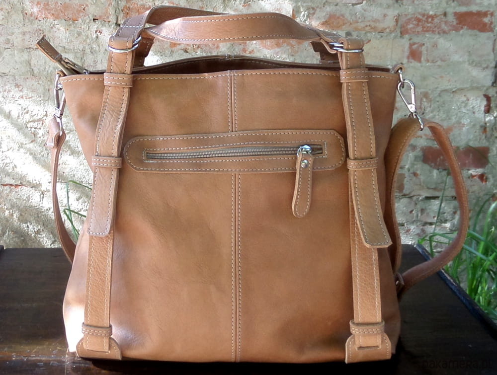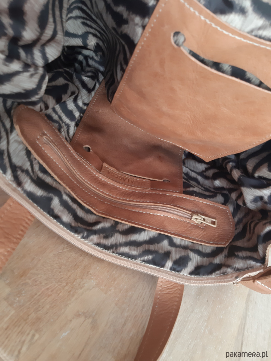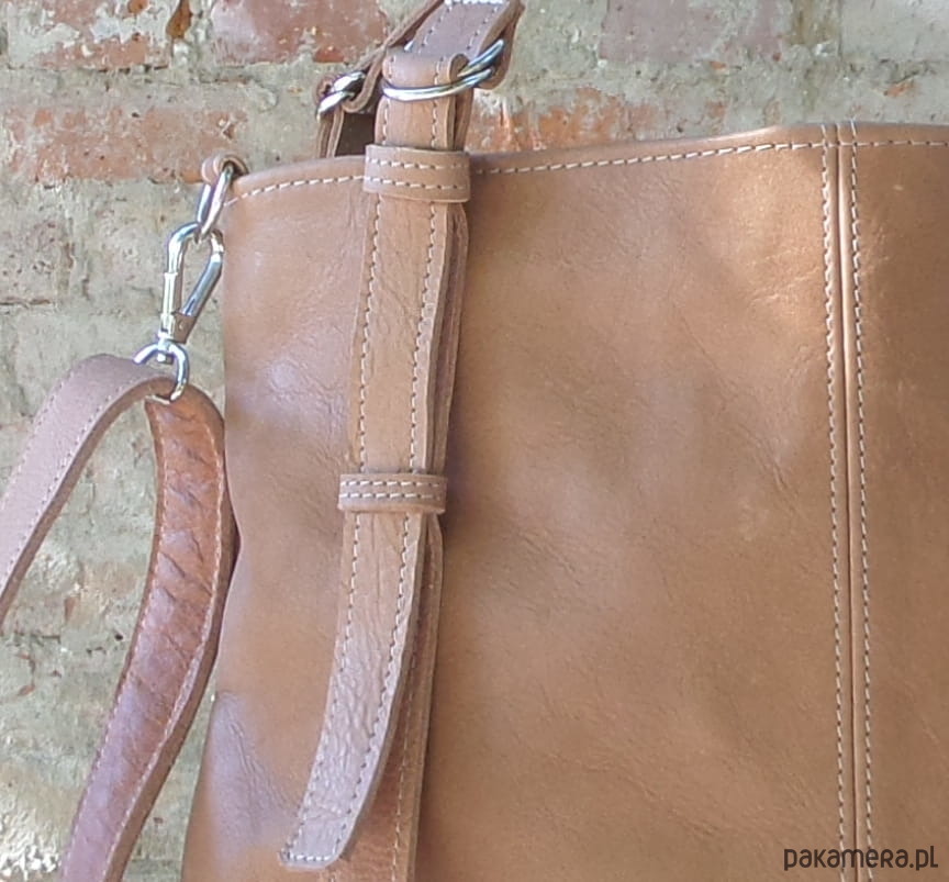 Piękna duża torba uszyta z naturalnej skóry w kolorze camelu . Zapinana na zamek. Torba wewnątrz wyłożona podszewką, w podszewce 2 kieszonki skórzane na komórki i 1 kieszeń na zamek. Torba do noszenia w ręku i na ramieniu - uchwyty regulowane plus doczepiany skórzany pasek o szer. 2,5 cm i regul. dł. - można nosić na skos, okucia ciemno złote.