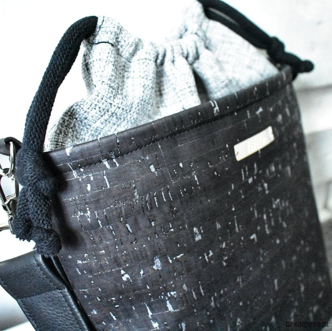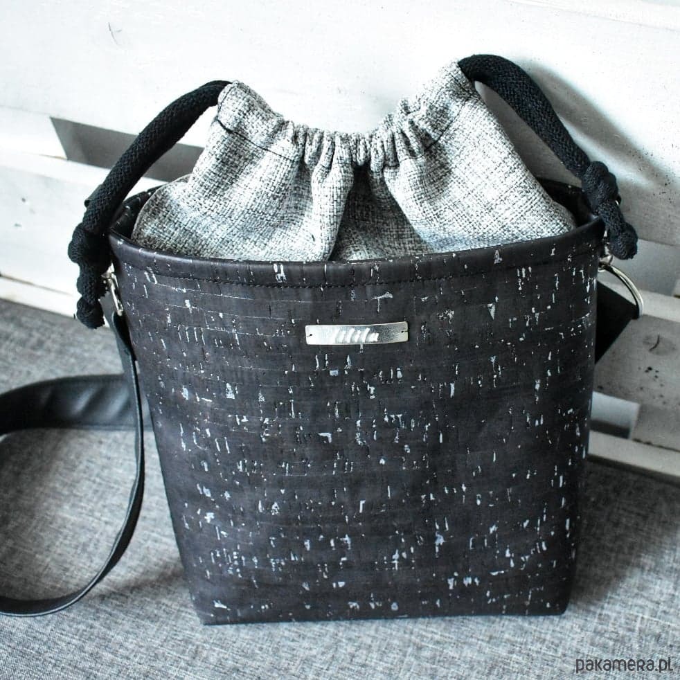 Torebka wykończona jest tkaninowym workiem, który może być widoczny lub schowany w głębi torebki- wedle upodobań. Torebka jest ultralekka. Zamykana jest za pomocą ściąganych troczków. Wewnątrz posiada podszewkę z kieszonką na drobiazgi. Dno torebki jest wzmocnione. Pasek na ramię wykonany jest z czarnej ekoskóry i posiada regulację długości.