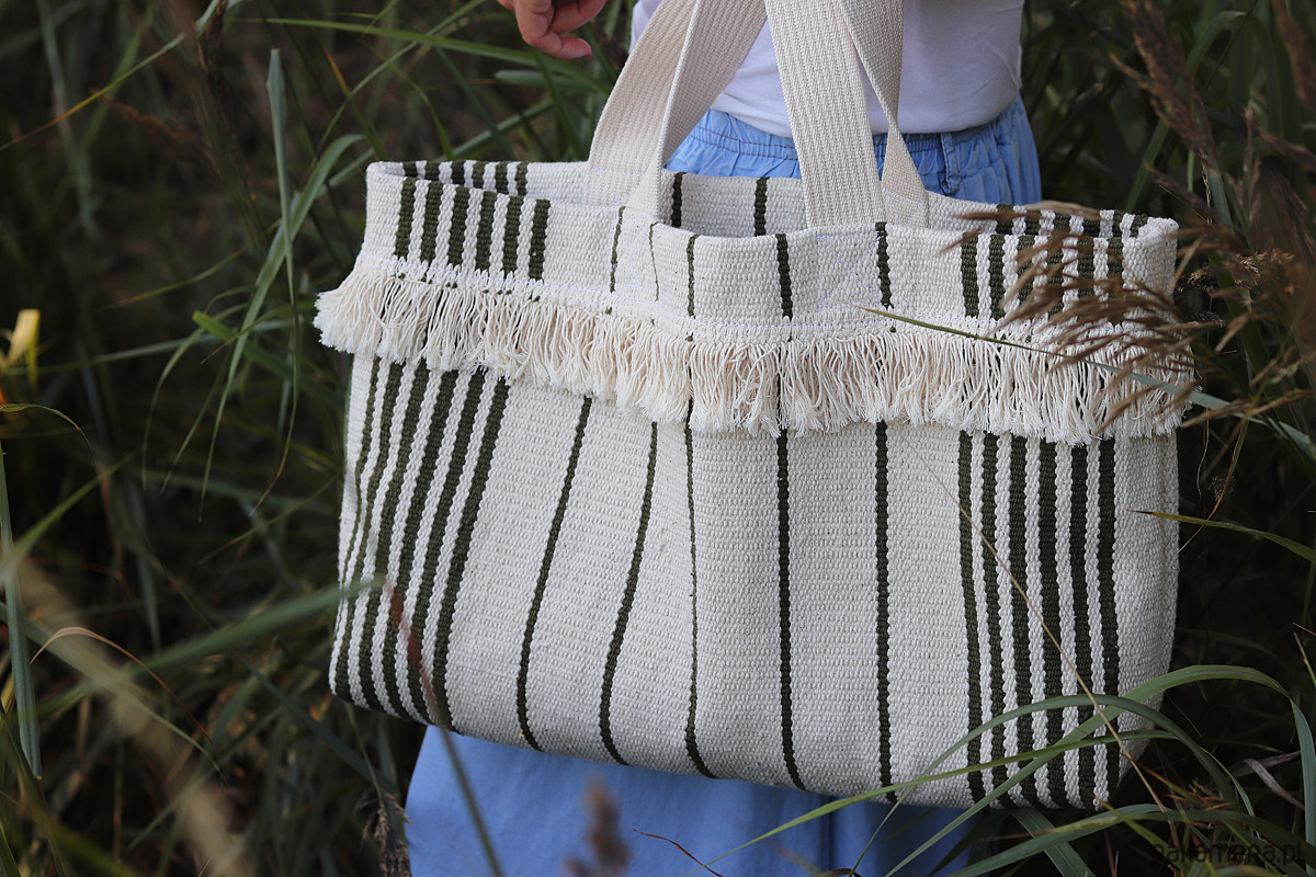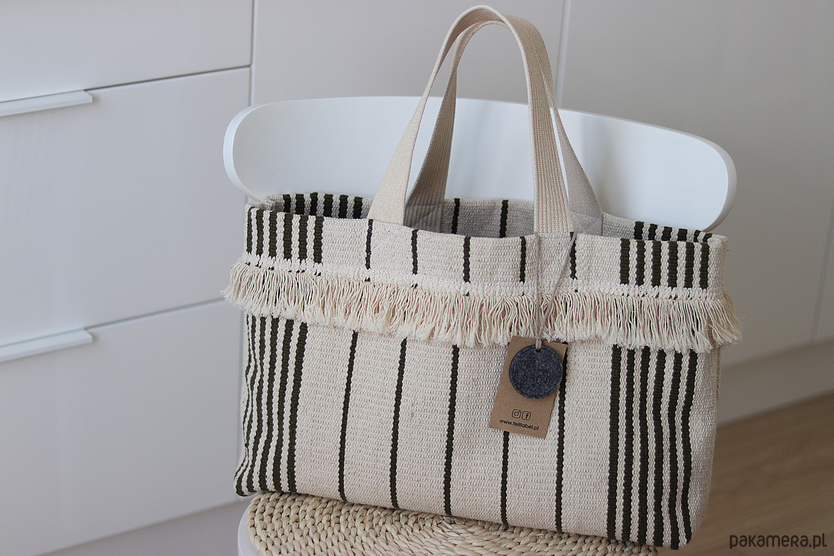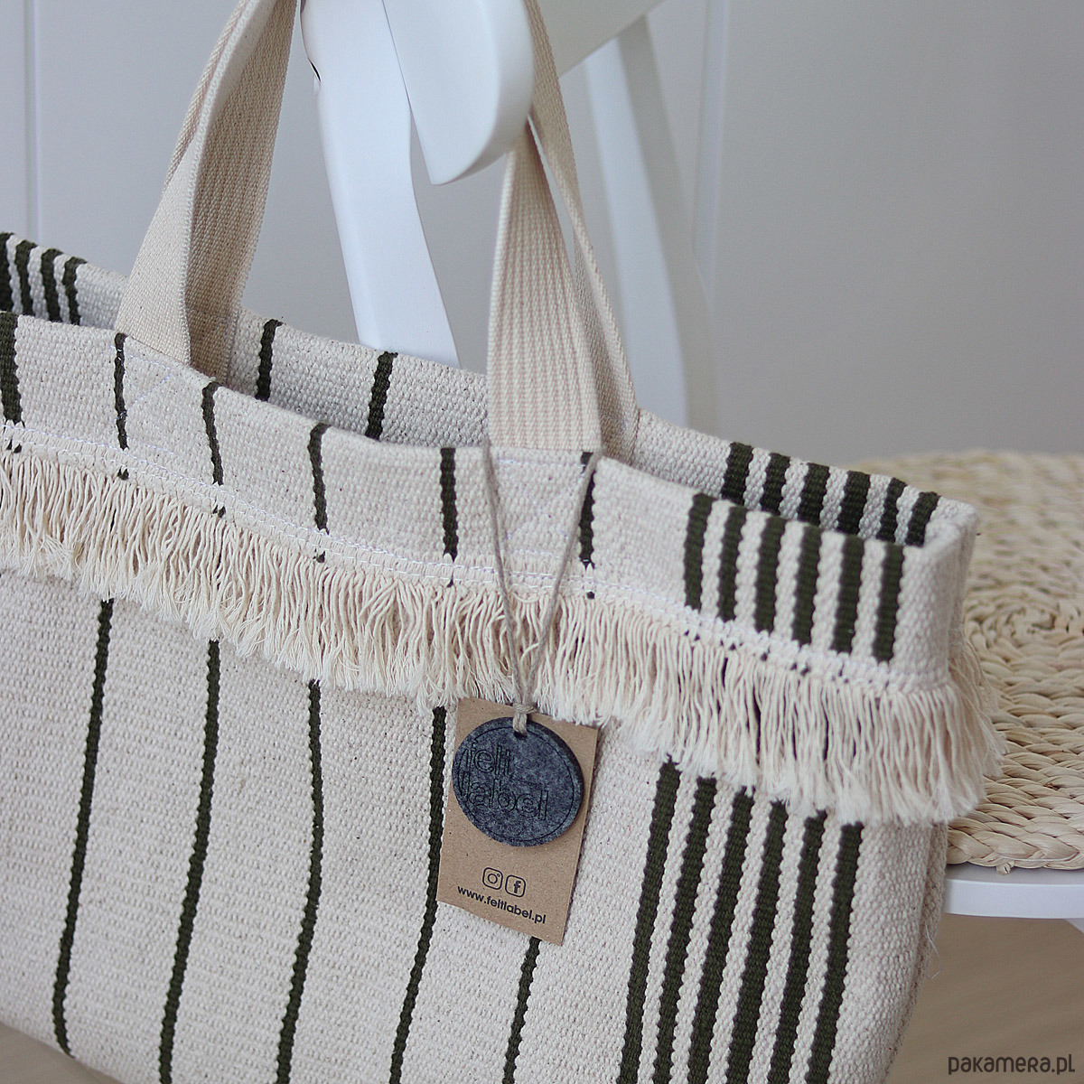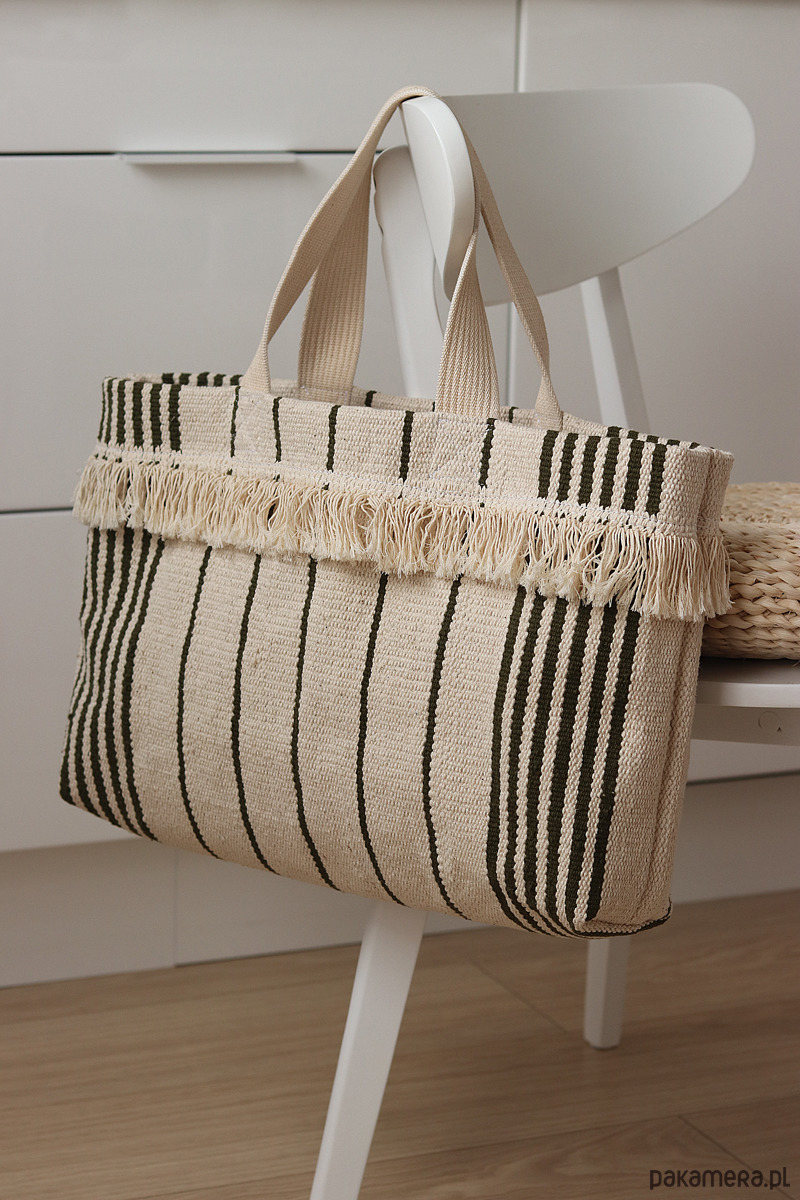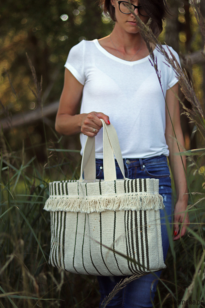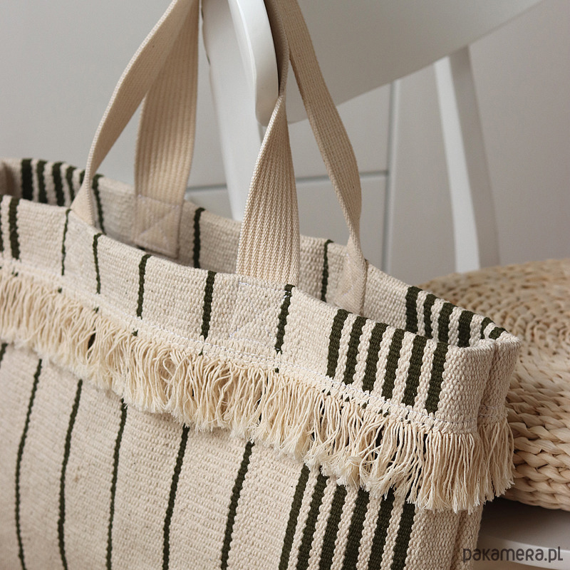 materiał: gruba, pleciona bawełna zarówno baza jak i rączki, kolor kremowy w oliwkowe pasy