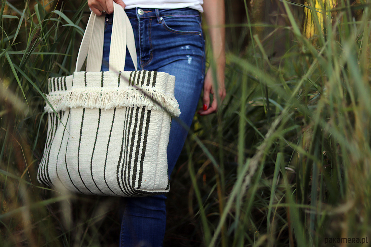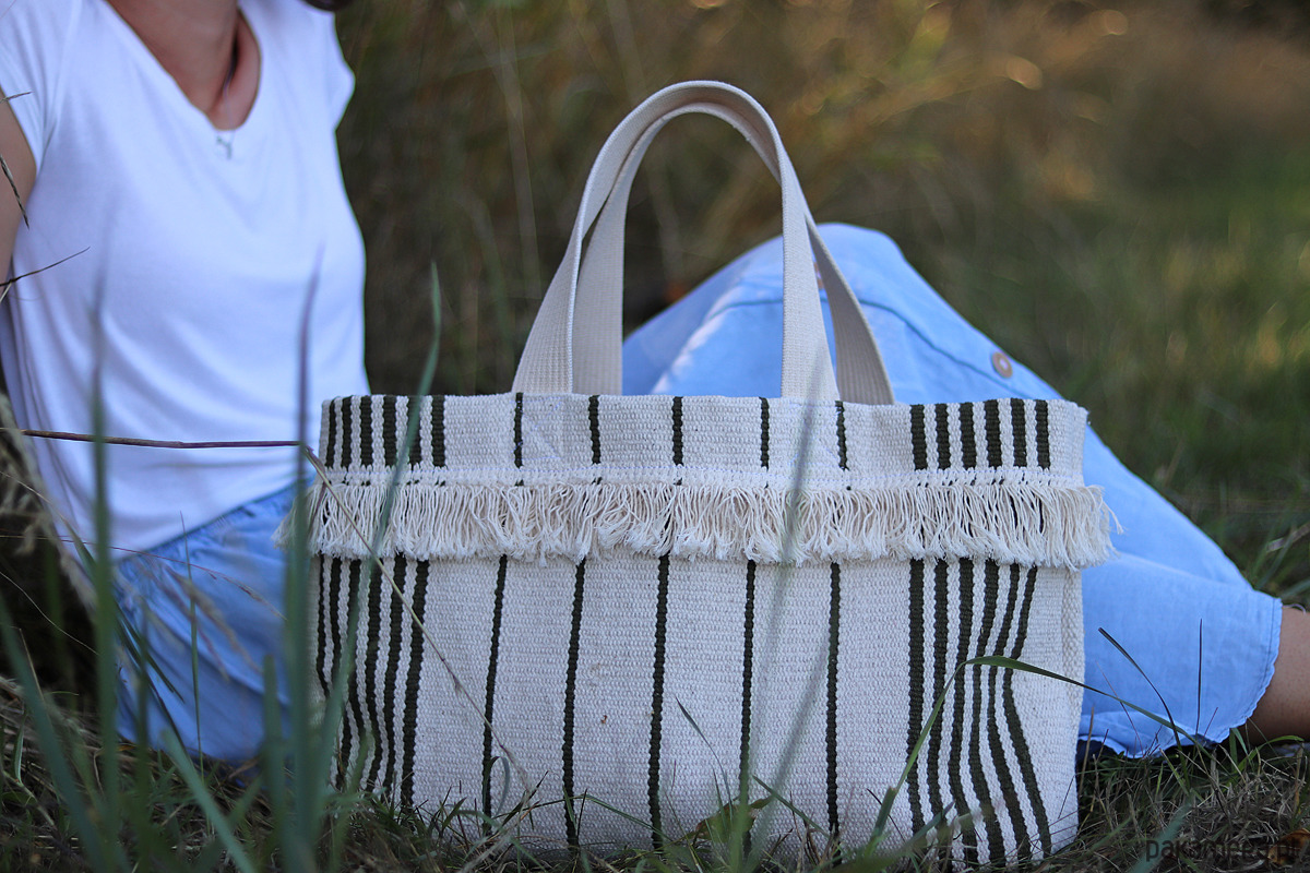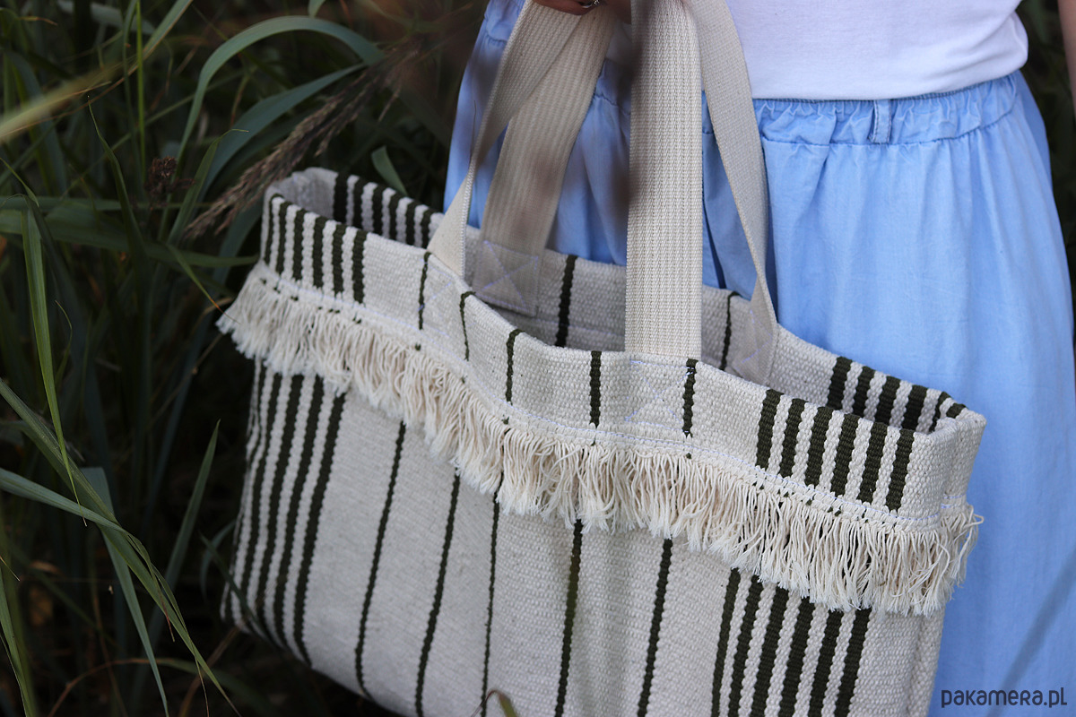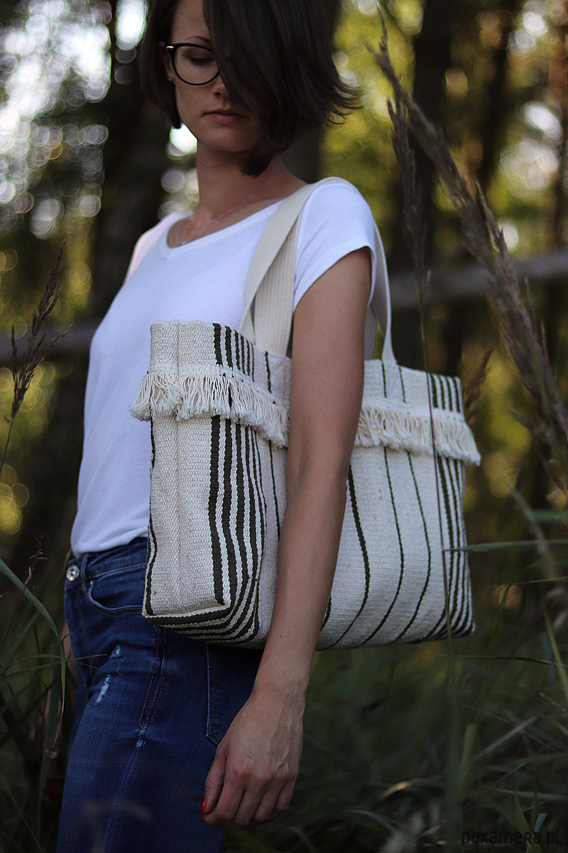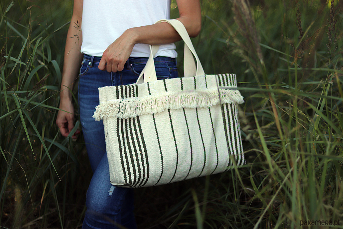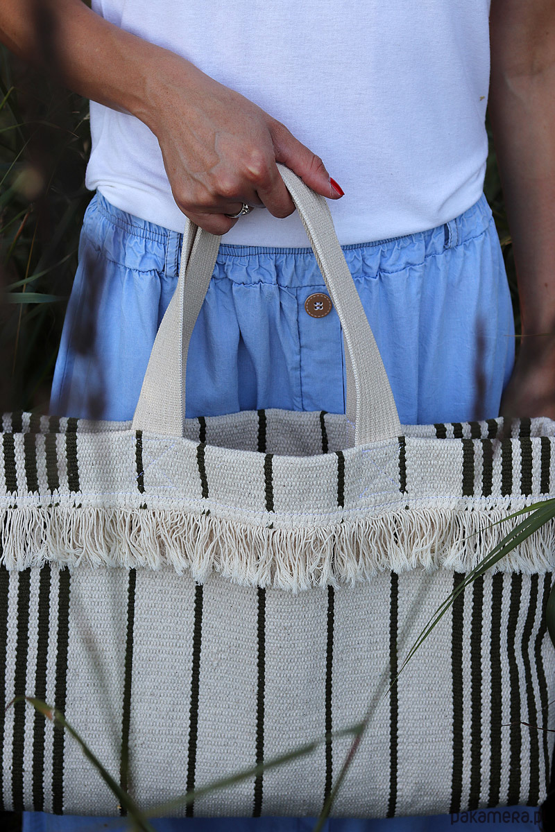 materiał: gruba, pleciona bawełna zarówno baza jak i rączki, kolor kremowy w oliwkowe pasy