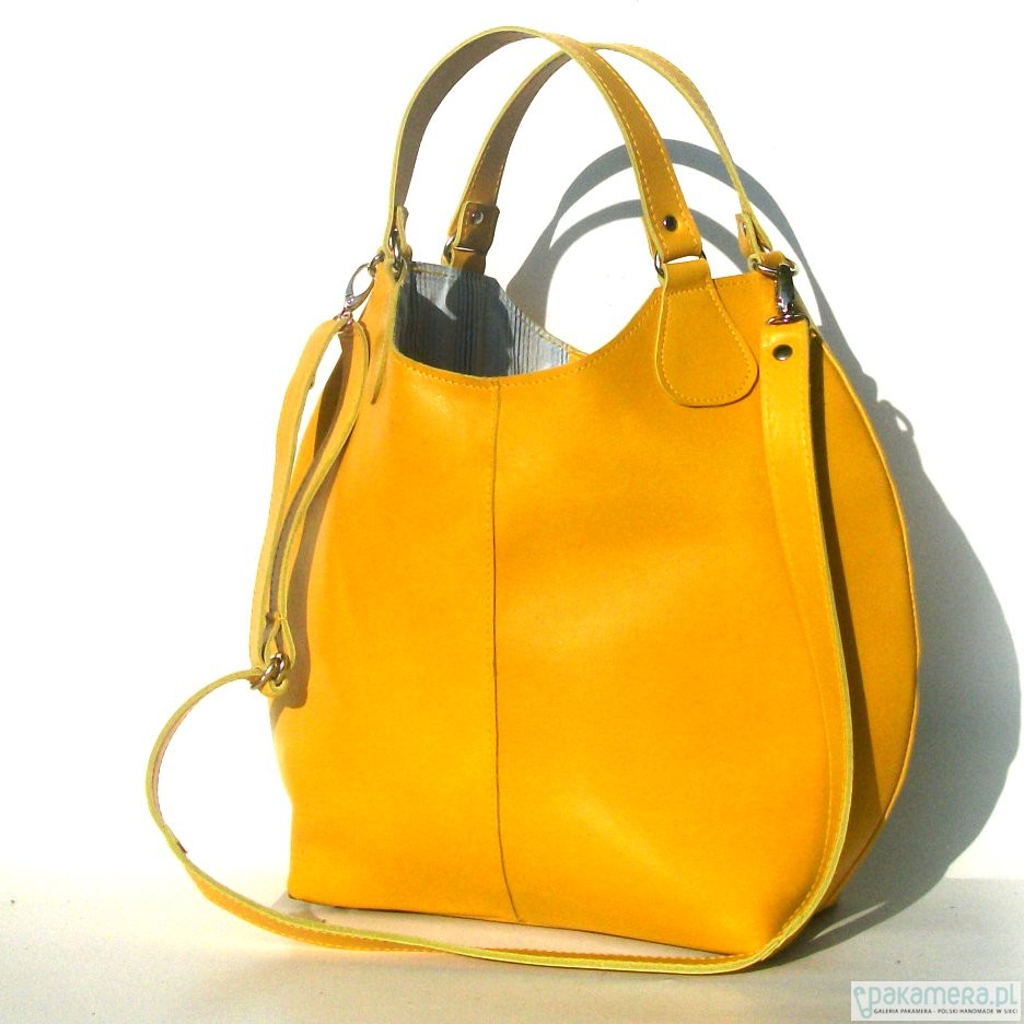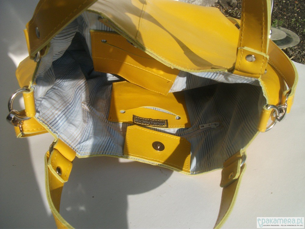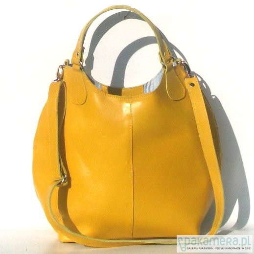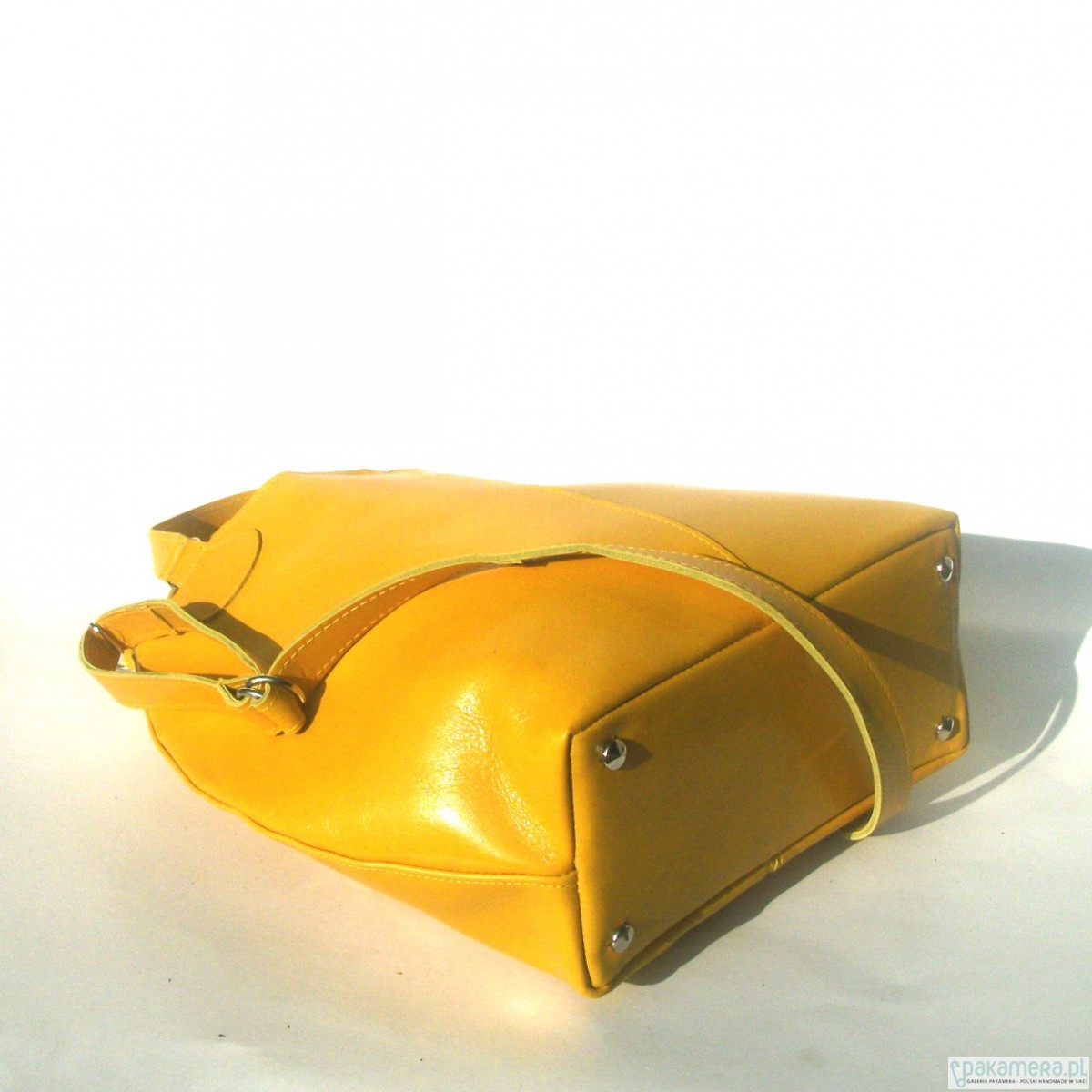 Duża skórzana torba uszyta ze skóry naturalnej licowej - żółtej w odcieniu słonecznika Przód i tył przestebnowane. Zapinana na magnes, wyłożona stylowym płótnem w paseczki; wewnątrz kieszonka zapinana na zamek i 2 kieszonki skórzane na komórki. Dno usztywnione, na dnie metalowe nóżki, okucia srebrne. Uchwyty - do noszenia na ramię w komplecie też długi doczepiany pasek do noszenia na skos. Wymiary torby: wys. na środku 31 cm , szer. na środku 40 cm, gł 14 cm.