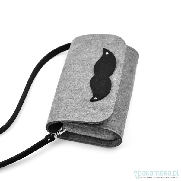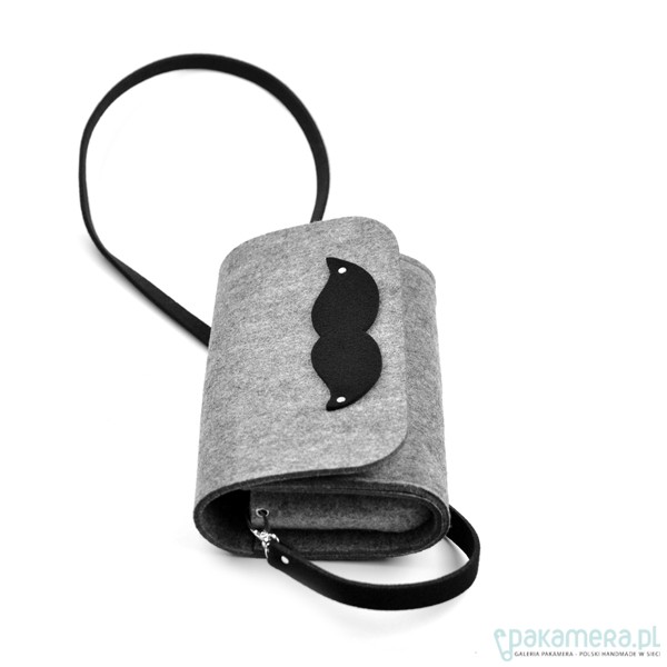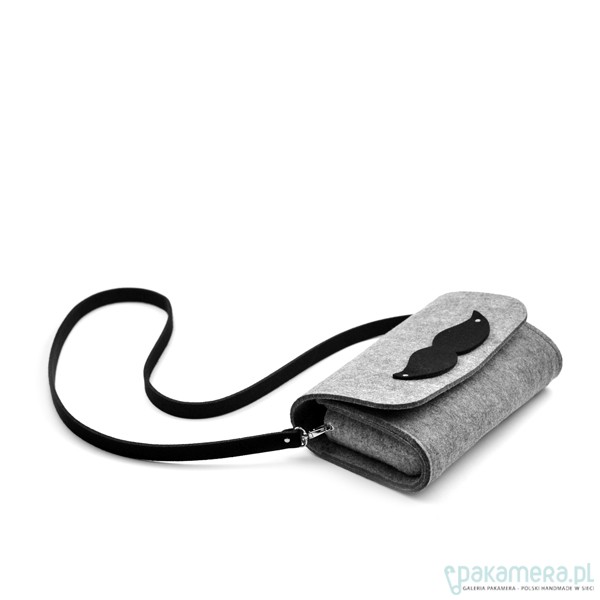 Fantastyczna mała torebka/kopertówka z kolekcji marki FeltLabel. - idealna zarówno na co dzień jak i specjalne okazje. - pomieści wszelkie niezbędne kobietom drobiazgi i nie tylko ;) - mimo niewielkich rozmiarów ;) - model: MustacheClutch - kolekcja: filcMe - kształt: prostokąt - zapięcie: nap - kolor: szary - wymiary: 24 cm x 18 cm, szerokość boku i podstawy 7 cm - materiał: filc 4 mm - uchwyt: dopinany, czarny pasek na ramię dł. 120 cm - wnętrze: bez dodatkowych kieszonek i podziałów - wzór: element ozdobny - czarne filcowe wąsy - interesuję Cię zmiany? inny rozmiar, kolor? napisz do nas!