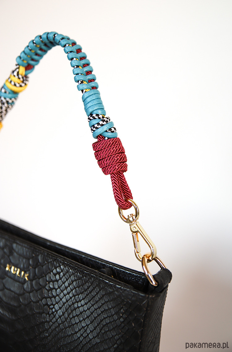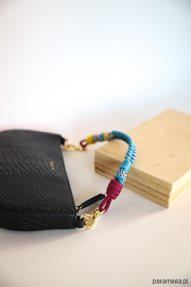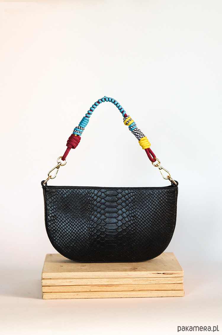Nowa torebka w kształcie półksiężyca jest wykonana z czarnej, tłoczonej skóry we wzór pytona. Zapinana na zamek w kolorze złotym. Wykończona w środku czarną bawełnianą podszewką z wewnętrzna skórzaną kieszonką. Załączony pasek jest z wyjątkowo oryginalny, pleciony z różnyo kolorowych sznurków. Idealnie się sprawdza zarówno w dziennych stylizacjach jak i dopełnienie wieczorowego looku