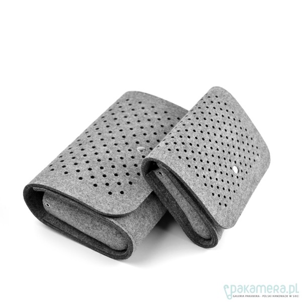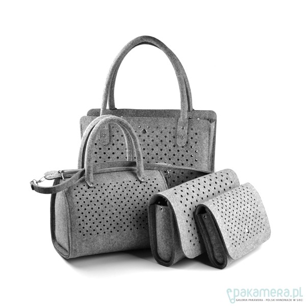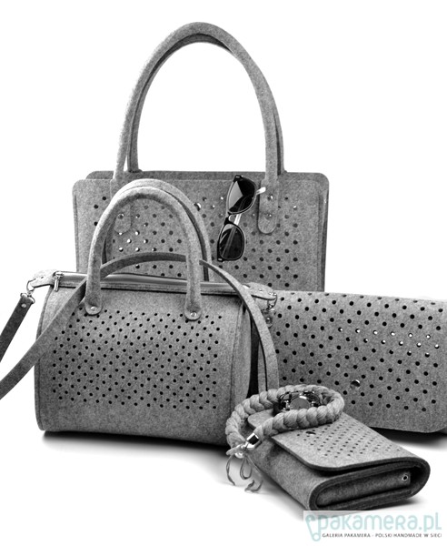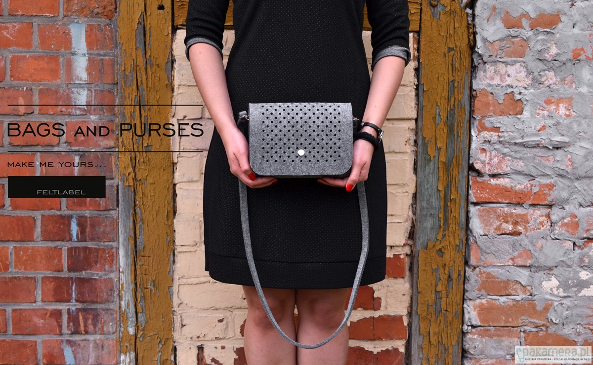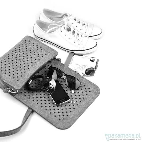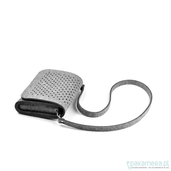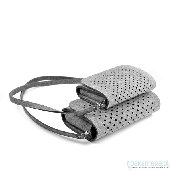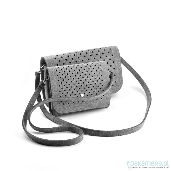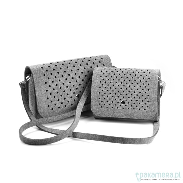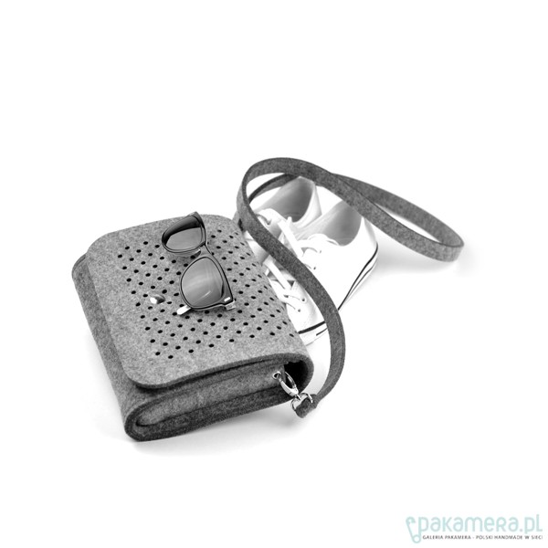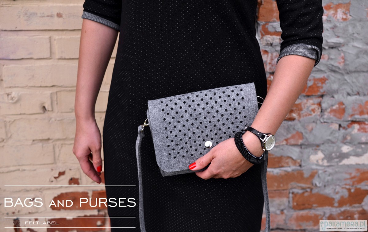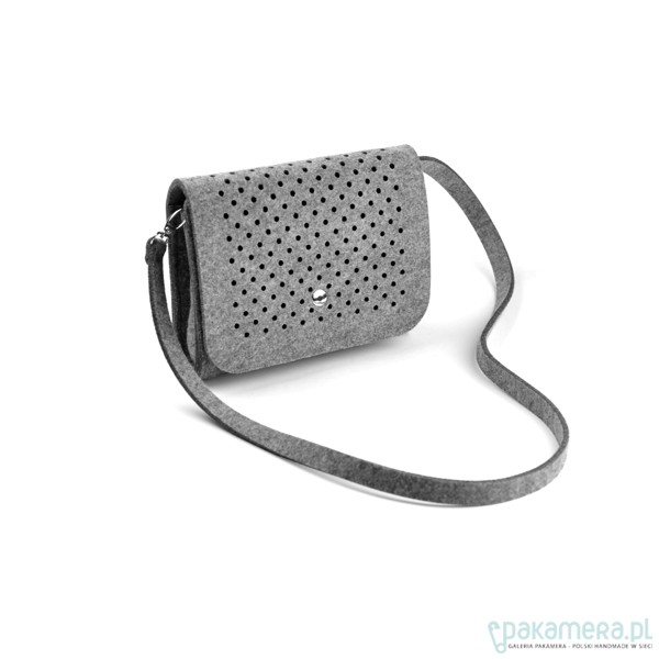 Fantastyczna mała torebka/kopertówka marki FeltLabel. - idealna zarówno na co dzień jak i specjalne okazje. - pomieści wszelkie niezbędne kobietom drobiazgi i nie tylko ;) - mimo niewielkich rozmiarów ;) - model: SmallDotsClutch - kolekcja: filcMe - kształt: prostokąt - zapięcie: srebrny nap - kolor: szary - wymiary: 23 cm x 18 cm, szerokość boku i podstawy 5 cm - materiał: filc 4 mm - uchwyt: dopinany pasek na ramię dł. 120 cm - wnętrze: bez dodatkowych kieszonek i podziałów - wzór: kółeczka o średnicy 5 mm wycięte z obu stron torebki - są na tyle małe, że nie widać przez nie co dokładnie znajduje się w środku, ale jednocześnie dodają odrobiny koloru torebce przez znajdujące się w niej rzeczy - interesuję Cię zmiany? inny rozmiar, kolor? napisz do nas!