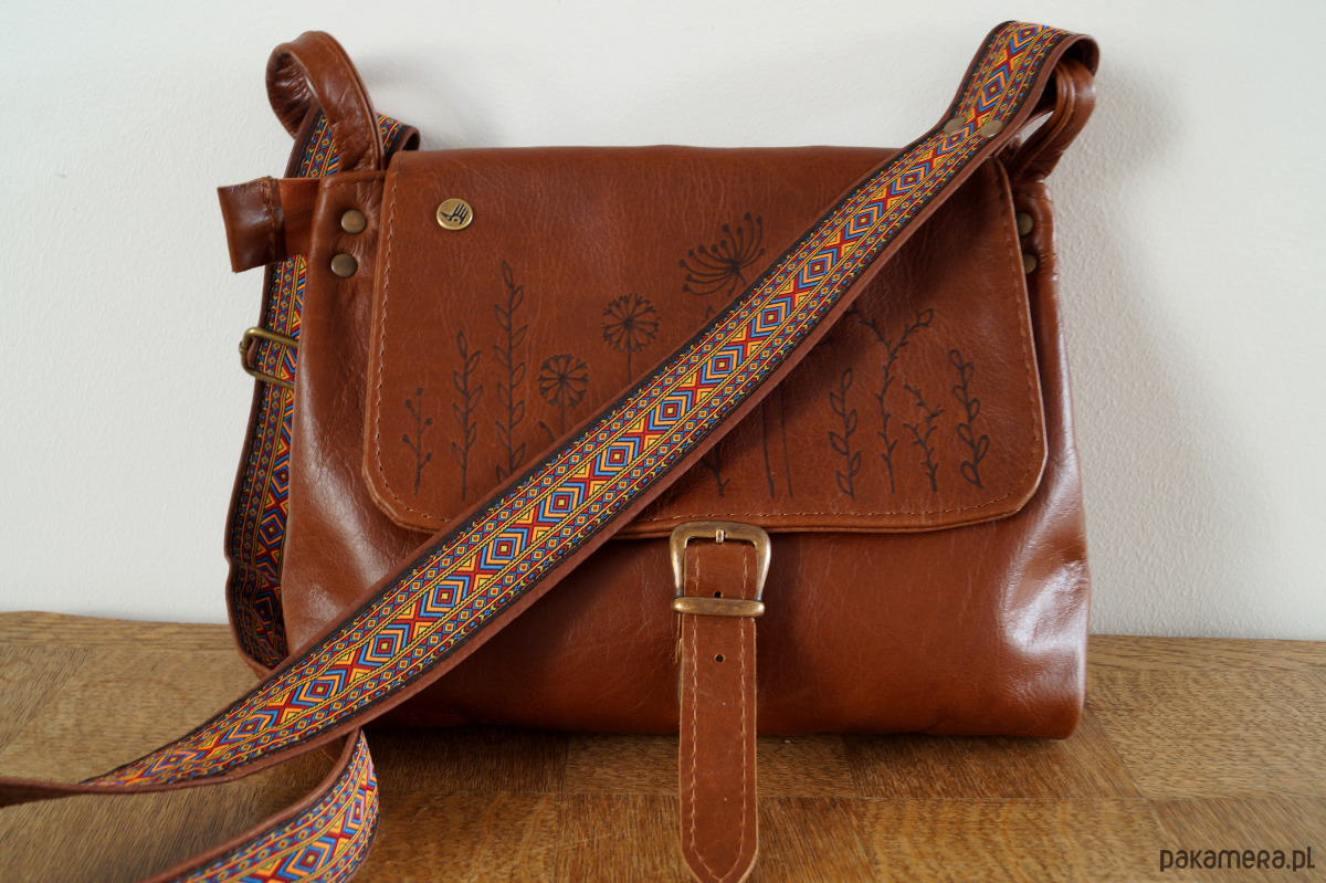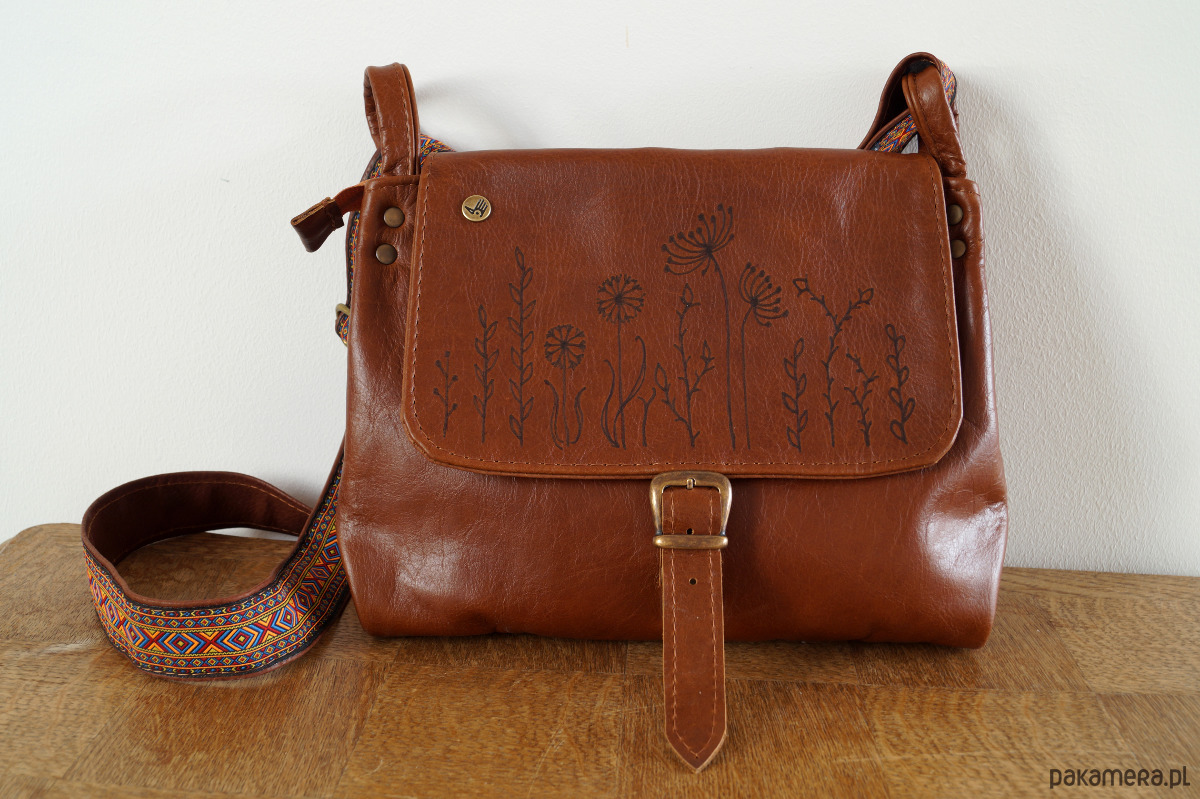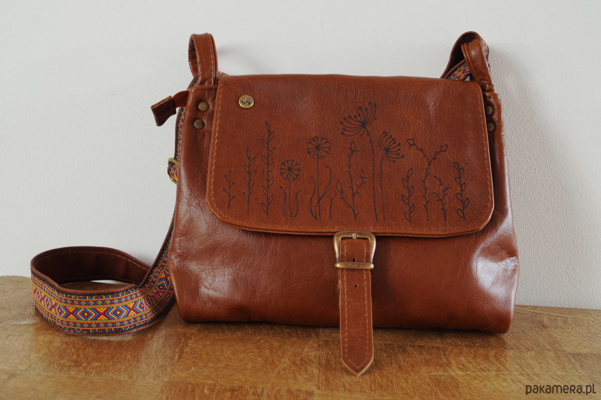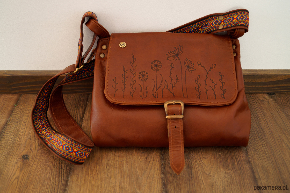 Średniej wielkości, funkcjonalna i wygodna torebka. Uszyta ze świetnej jakości, pięknej skóry bydlęcej, licowej, bardzo łatwej do utrzymania w czystości. Piękny, koniakowy odcień brązu. Prosty, autorski krój. Na klapie – ręcznie wypalony wzór polnych kwiatów. Szeroki pas uszyty ze skóry i taśmy z azteckim wzorem. Zapinana na zamek oraz na skórzany troczek. Wewnątrz podszewka, kieszeń na zamek i dwie kieszenie otwarte. Z tyłu kieszonka na telefon. Wysokość – 25, szerokość – 28, szerokość – 7cm, regulowany pasek długi na max. 130 cm.