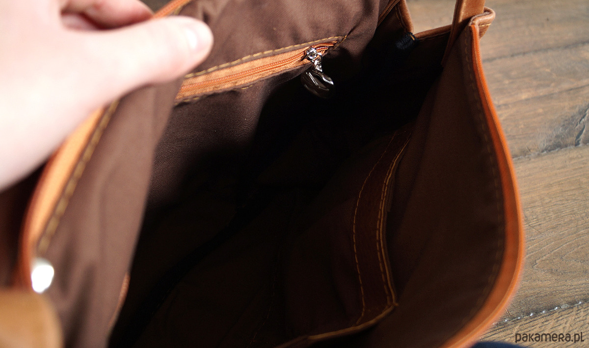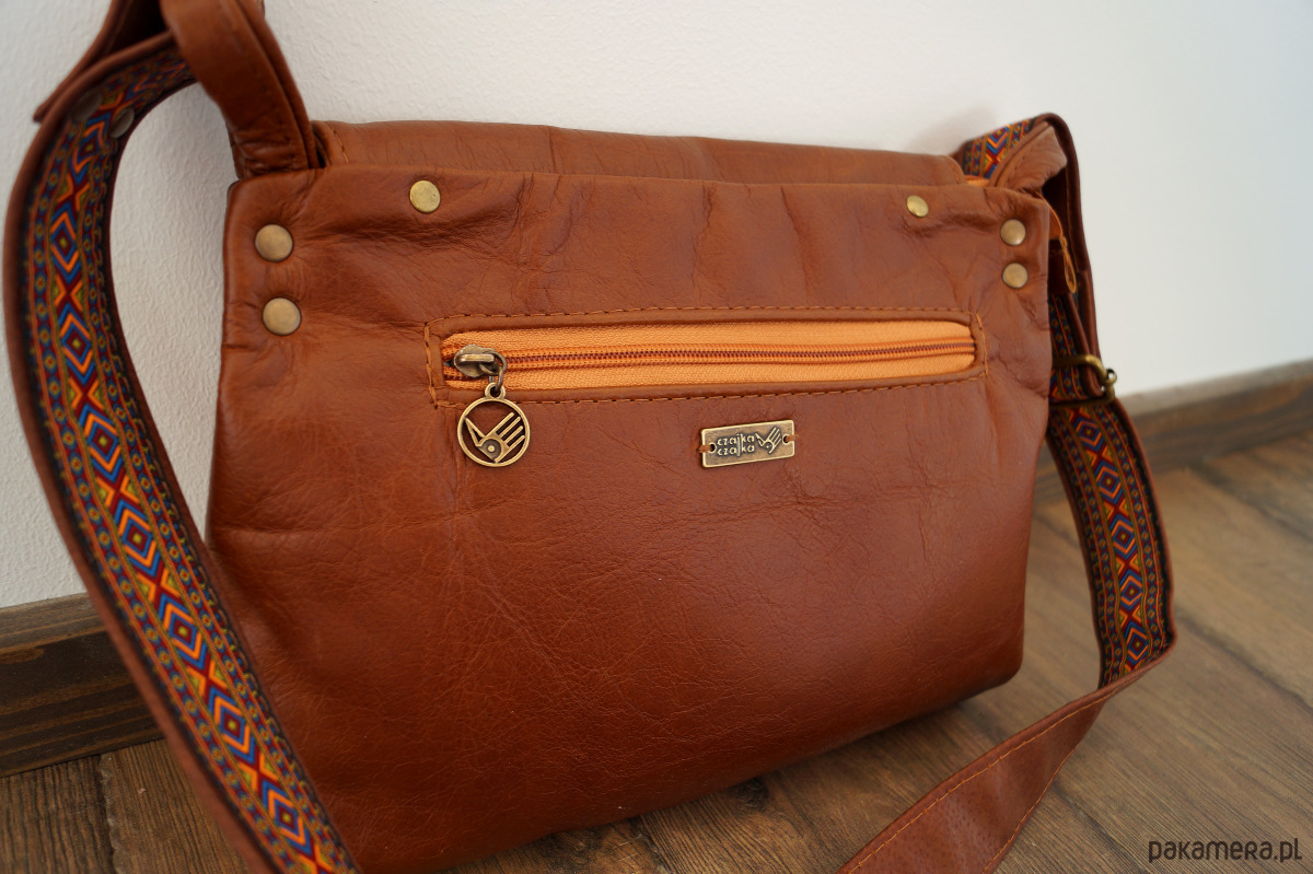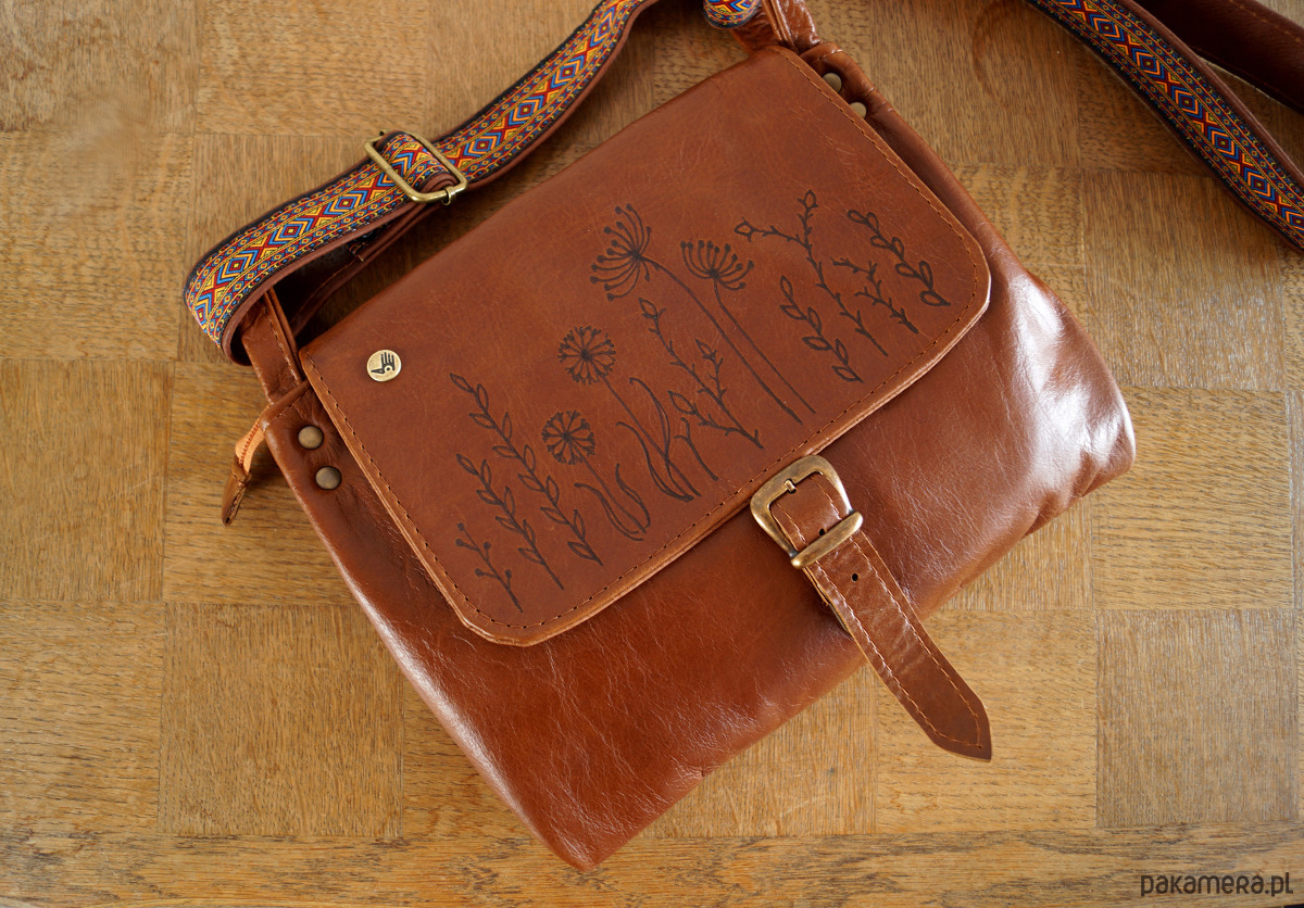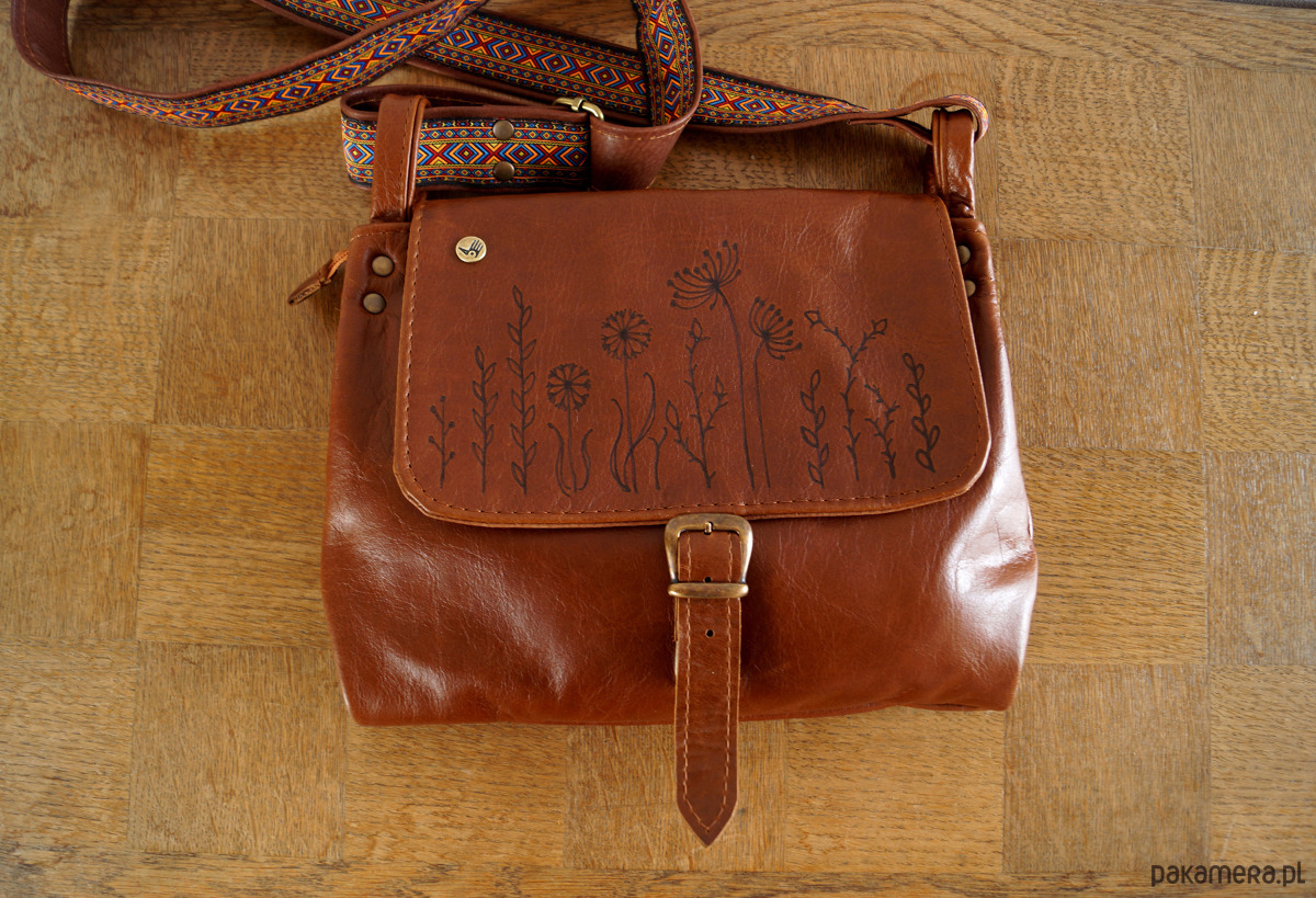 Średniej wielkości, funkcjonalna i wygodna torebka. Uszyta ze świetnej jakości, pięknej skóry bydlęcej, licowej, bardzo łatwej do utrzymania w czystości. Piękny, koniakowy odcień brązu. Prosty, autorski krój. Na klapie – ręcznie wypalony wzór polnych kwiatów. Szeroki pas uszyty ze skóry i taśmy z azteckim wzorem. Zapinana na zamek oraz na skórzany troczek. Wewnątrz podszewka, kieszeń na zamek i dwie kieszenie otwarte. Z tyłu kieszonka na telefon. Wysokość – 25, szerokość – 28, szerokość – 7cm, regulowany pasek długi na max. 130 cm.
