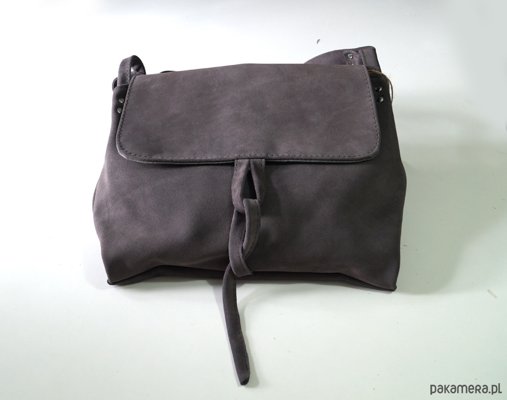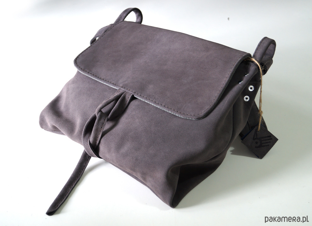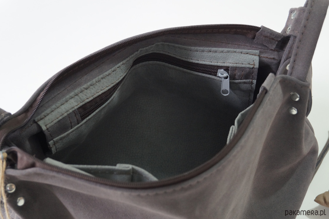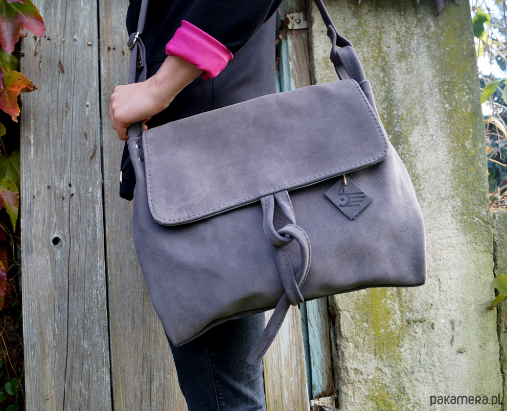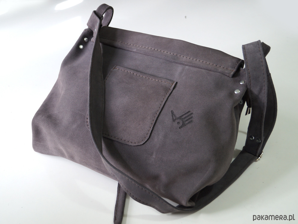 Duża torebka ze świetnej jakości, grubej, pięknej skóry bydlęcej, zamszowej, w kolorze szarym. Mieści swobodnie format A4. . Prosty, autorski krój. Torebka bez podszewki. Zapinana na zamek, skórzany troczek i magnes ukryty pod klapą. Wewnątrz trzy kieszenie, w tym jedna na zamek, uszyte z różowej skóry. Z tyłu kieszeń na telefon. Wysokość - 33, szerokość - 33/44, regulowany pasek długi na max. 130 cm.